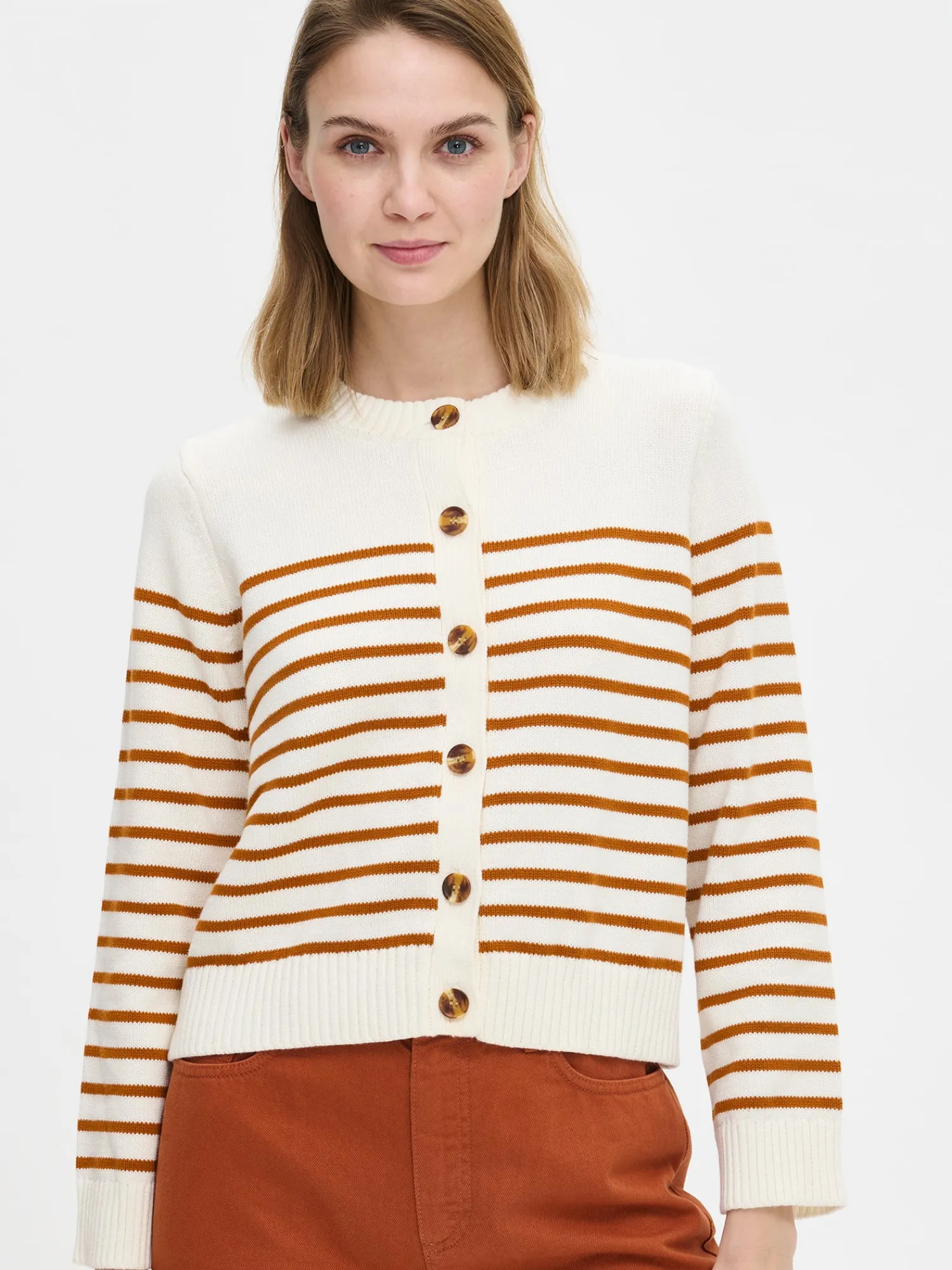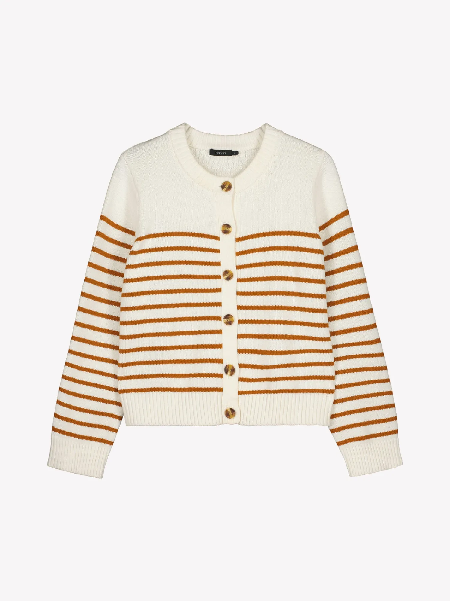 Naisten pitkähihainen, valko-ruskea raidallinen ja suoralinjainen Mira-neuletakki. Kaunis neuletakki on vaatekaapin kulmakivi ja helppo yhdistää moniin eri asuihin. Muotoonneulotussa puuvilla neuletakissa on pyöreä pääntie, täyspitkät hihat ja edessä napitus. Tuotteen pituus koossa M on noin 56 cm. Neuletakki on valmistettu sertifioidusta laadukkaasta puuvillasta.