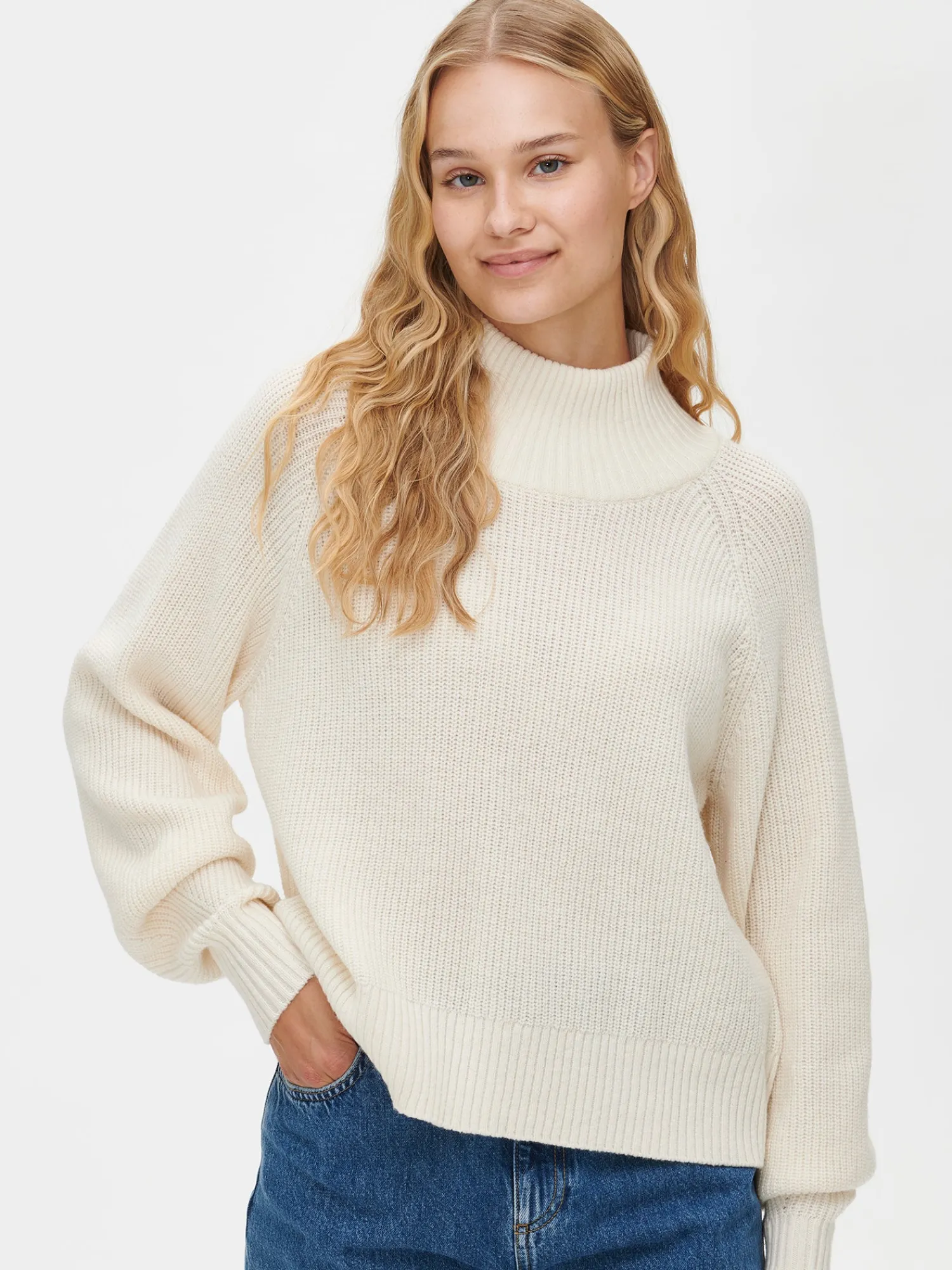 Naisten lämmin luonnonvalkoinen Nora-neulepusero. Mukavaan neulepaitaan on ihanaa pukeutua sään viilentyessä. Yhdistä neulepaita vaikka tyylikkäiden farkkujen tai suorien housujen pariksi. Neulepuserossa on pystykaulus ja täyspitkät hihat. Neulepuseron pituus koossa M on noin 55 cm. Puolipatenttineulos on pehmeän ja miellyttävän tuntuista villa-polyamidi sekoitetta. Tuotteen valmistuksessa on käytetty sertifioitua villaa. Neuleen hoito-ohjeet löydät