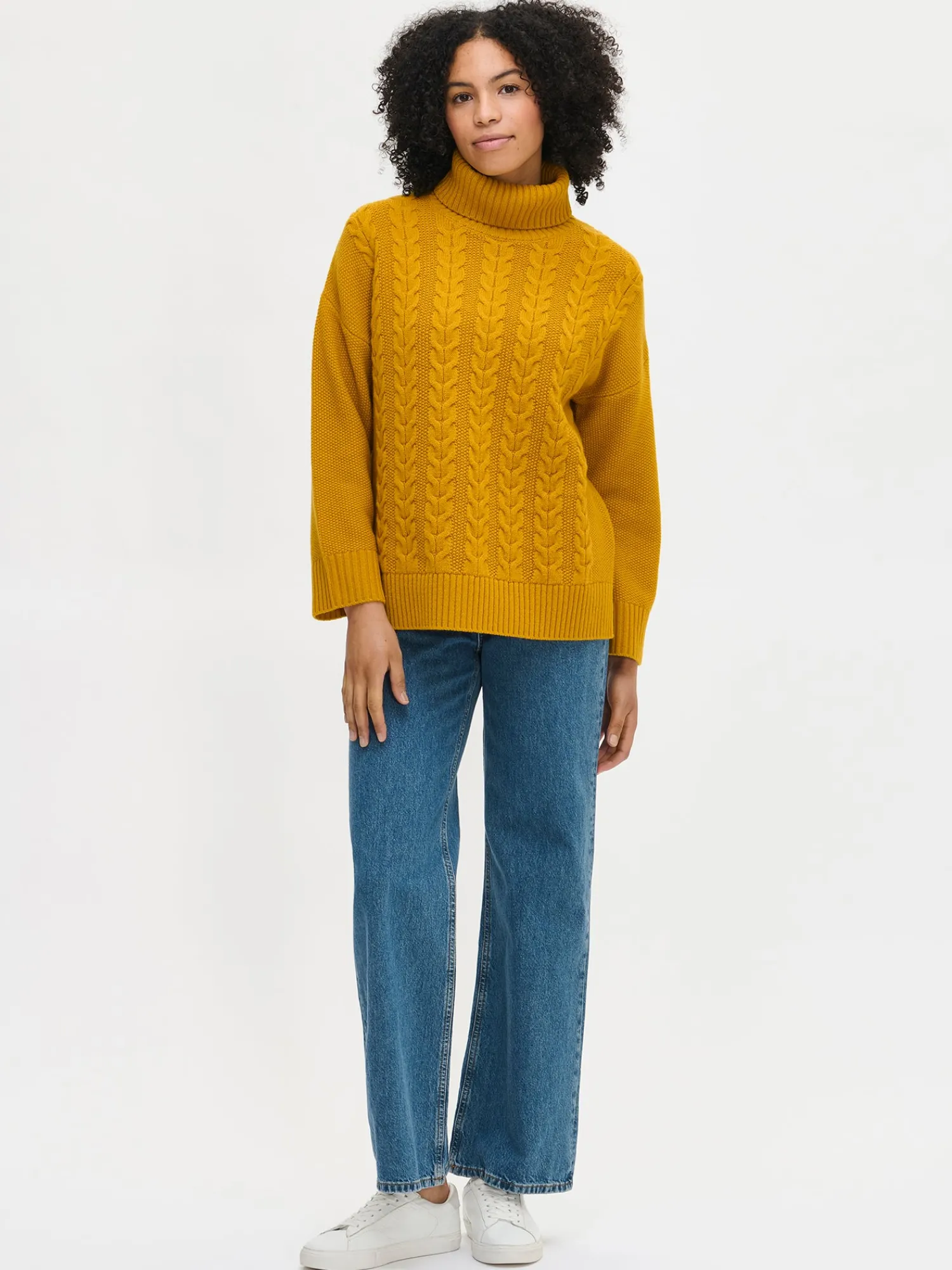 Naisten rento keltainen Palmikko-neulepusero poolokauluksella. Muotoonneulotussa neulepuserossa on pystykaulus, pudotettu olkalinja, täyspitkät hihat ja sivuhalkiot. Hihansuissa ja helmassa on resori. Neulepuserossa on kaunis neulottu palmikkokuvio ja sen pituus koossa M on noin 66 cm. Neulos on pehmeän ja miellyttävän tuntuista villa-polyamidi sekoitetta. Tuotteen valmistuksessa on käytetty sertifioitua villaa.
