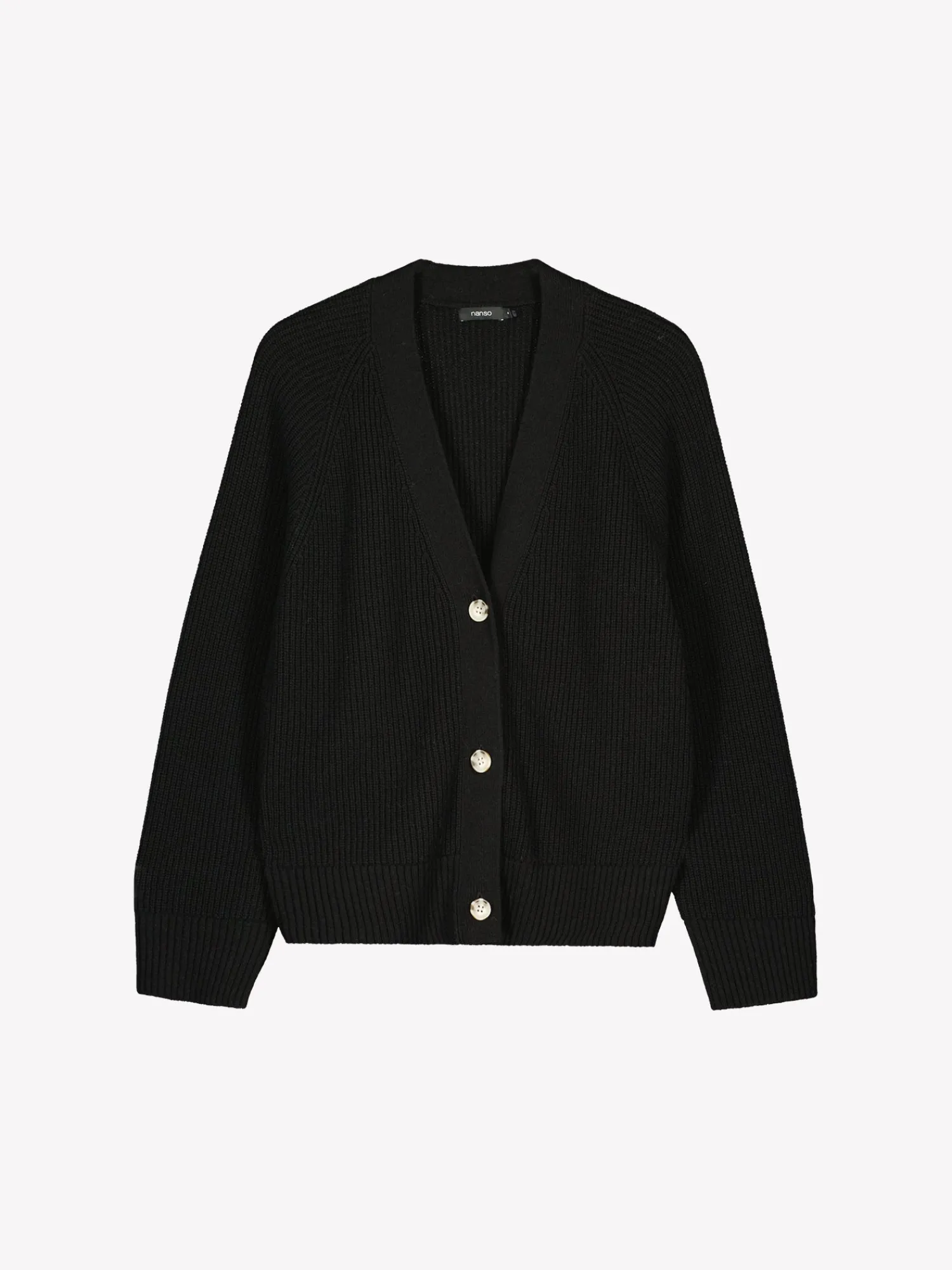 Naisten lämmin musta Pamela-neuletakki. Pehmeä villatakki on täydellinen vaate viileämpiin päiviin. Muotoonneulotussa laatikkomaisessa neuletakissa on avara v-pääntie, edessä napitus ja täyspitkät suoralinjaiset raglanhihat. Neuletakin pituus koossa M on noin 60 cm. Neulos on pehmeän ja miellyttävän tuntuista villa-viskoosi-polyamidi sekoitetta. Tuotteen valmistuksessa on käytetty sertifioitua villaa.