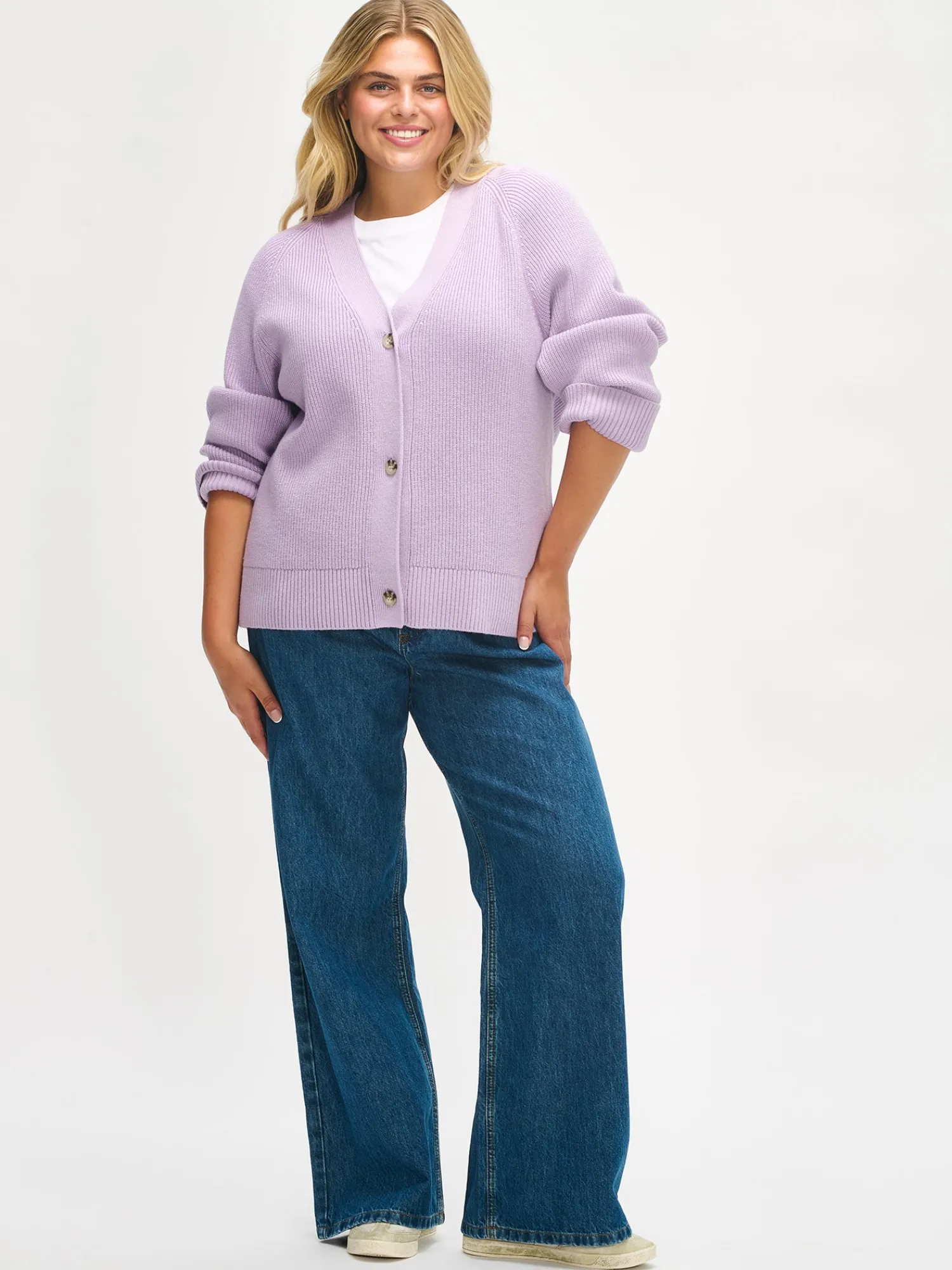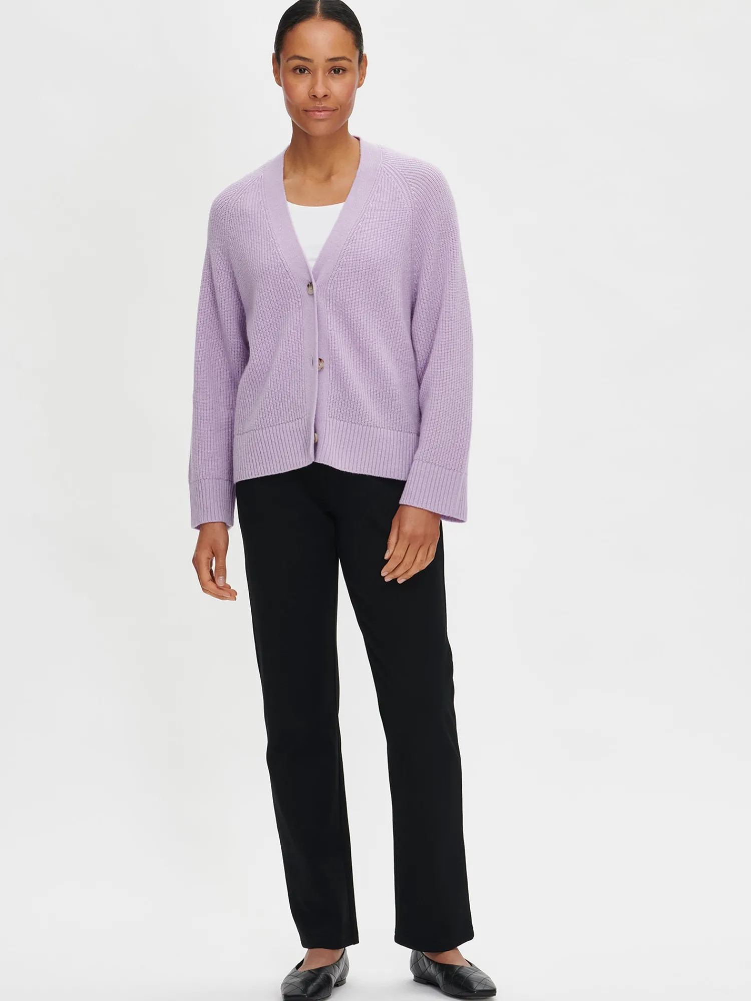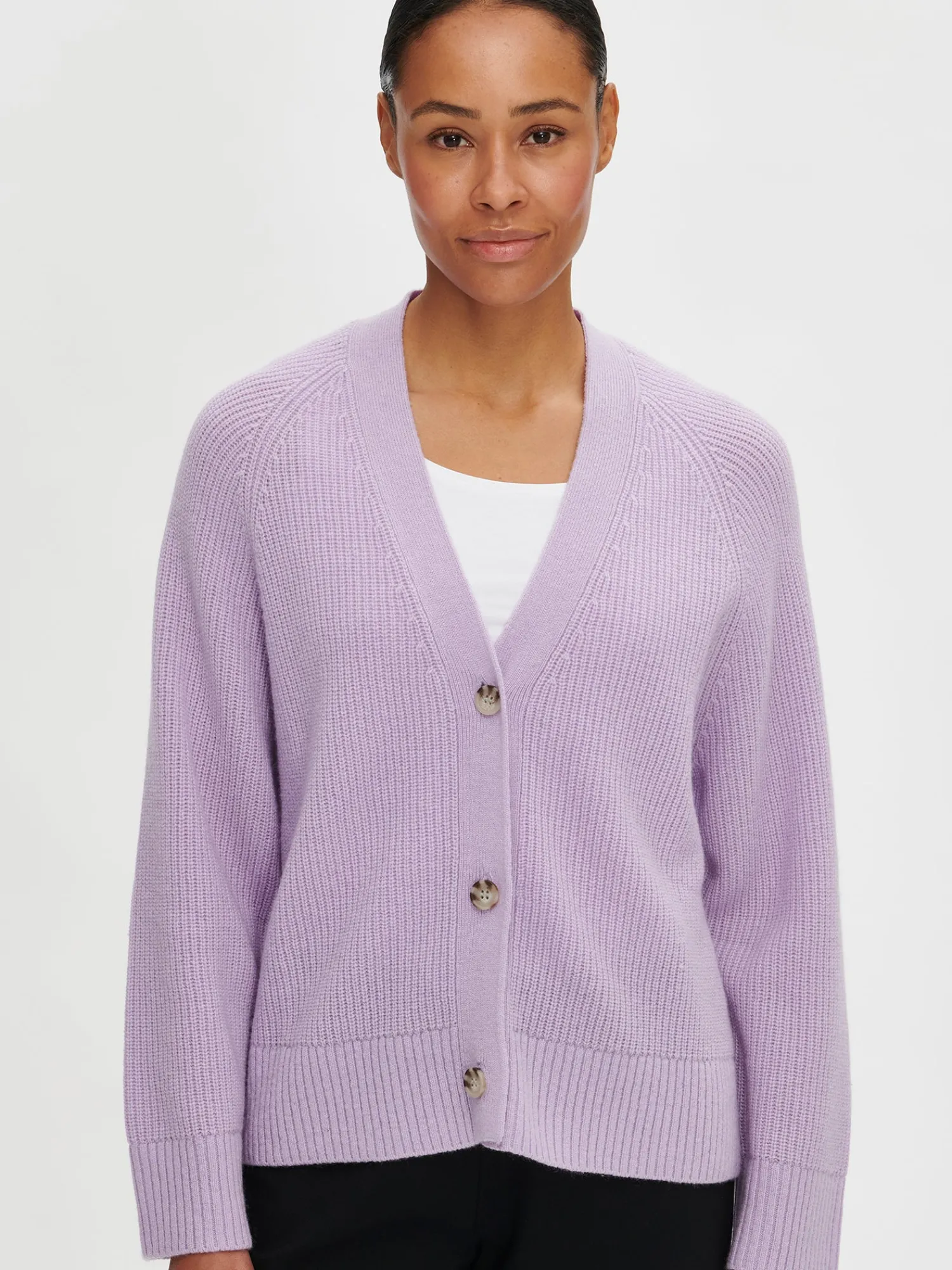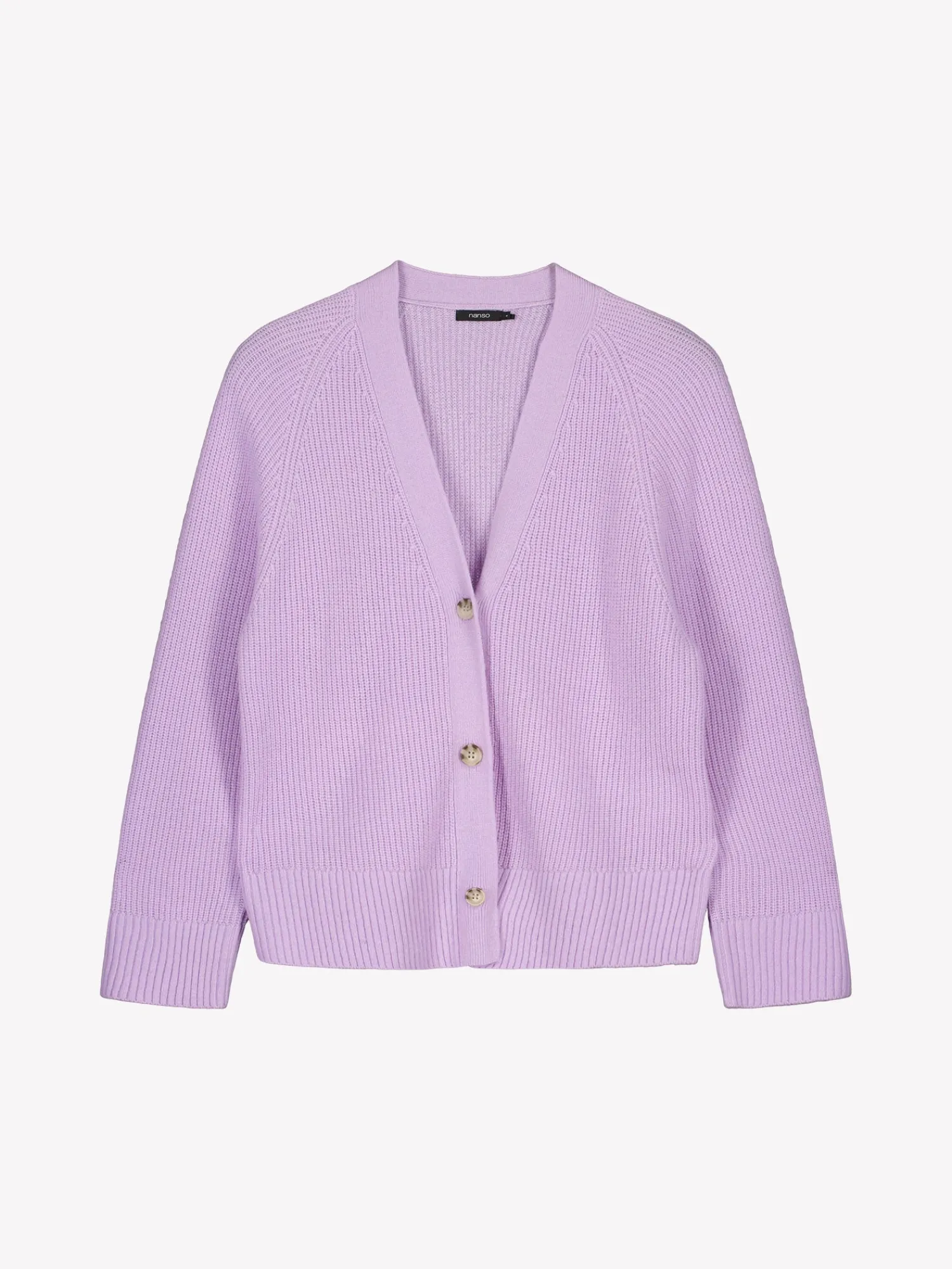 Naisten lämmin lila Pamela-neuletakki. Pehmeä villatakki on täydellinen vaate viileämpiin päiviin. Muotoonneulotussa laatikkomaisessa neuletakissa on avara v-pääntie, edessä napitus ja täyspitkät suoralinjaiset raglanhihat. Neuletakin pituus koossa M on noin 60 cm. Neulos on pehmeän ja miellyttävän tuntuista villa-viskoosi-polyamidi sekoitetta. Tuotteen valmistuksessa on käytetty sertifioitua villaa.