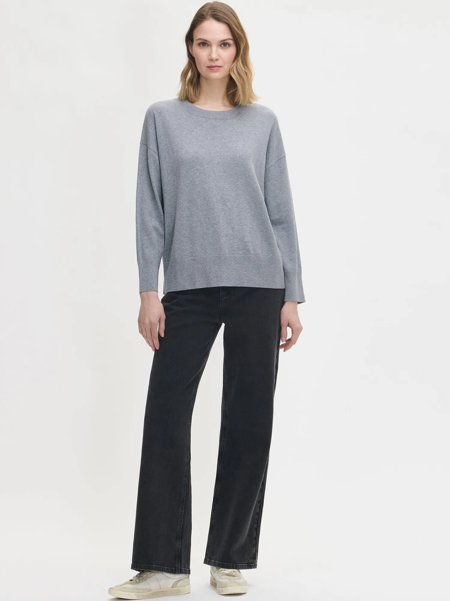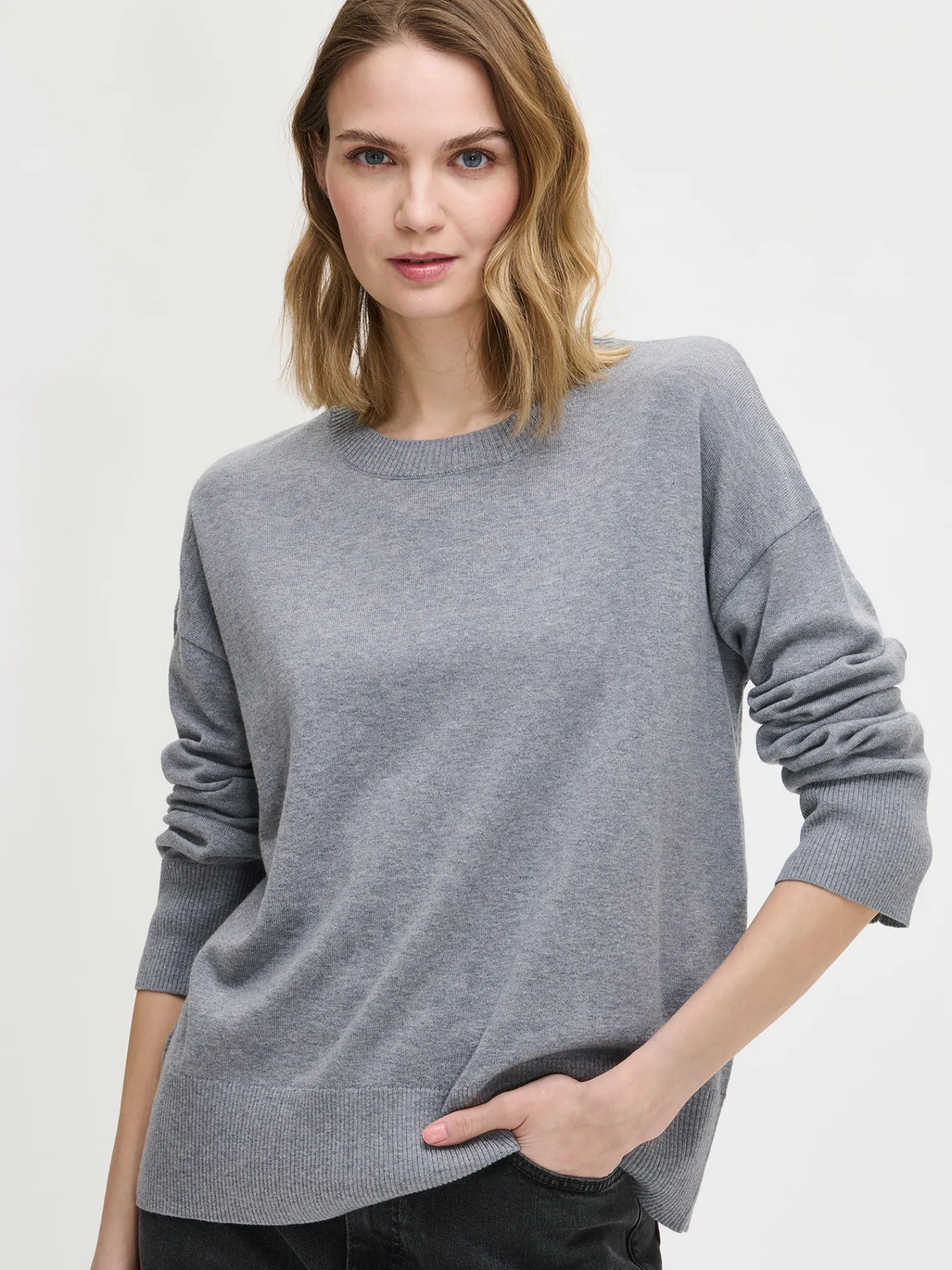 Naisten vaaleanharmaa laatikkomallinen Villis-neulepusero. Pehmeä villapaita on syksyn luottovaate. Neulepuserossa on pyöreä resoripääntie, pudotettu olkalinja ja täyspitkät hihat. Helmassa ja hihansuissa on leveä resori. Puseron pituus koossa M on noin 62 cm. Materiaali on laadukasta merinovillan ja puuvillan sekoitetta. Tuotteen valmistuksessa on käytetty mulesing-vapaata merinovillaa. Neuleen hoito-ohjeet löydät
