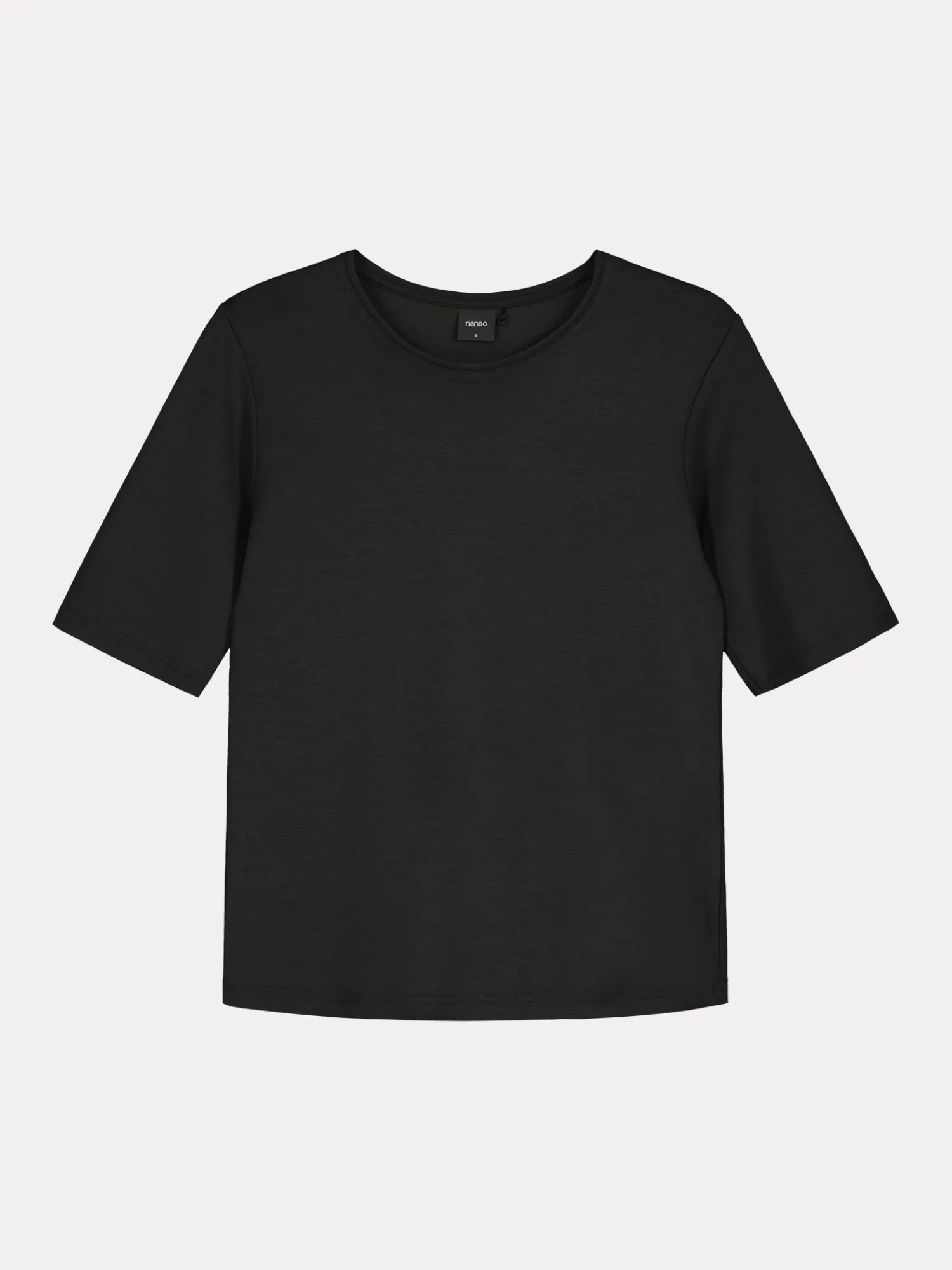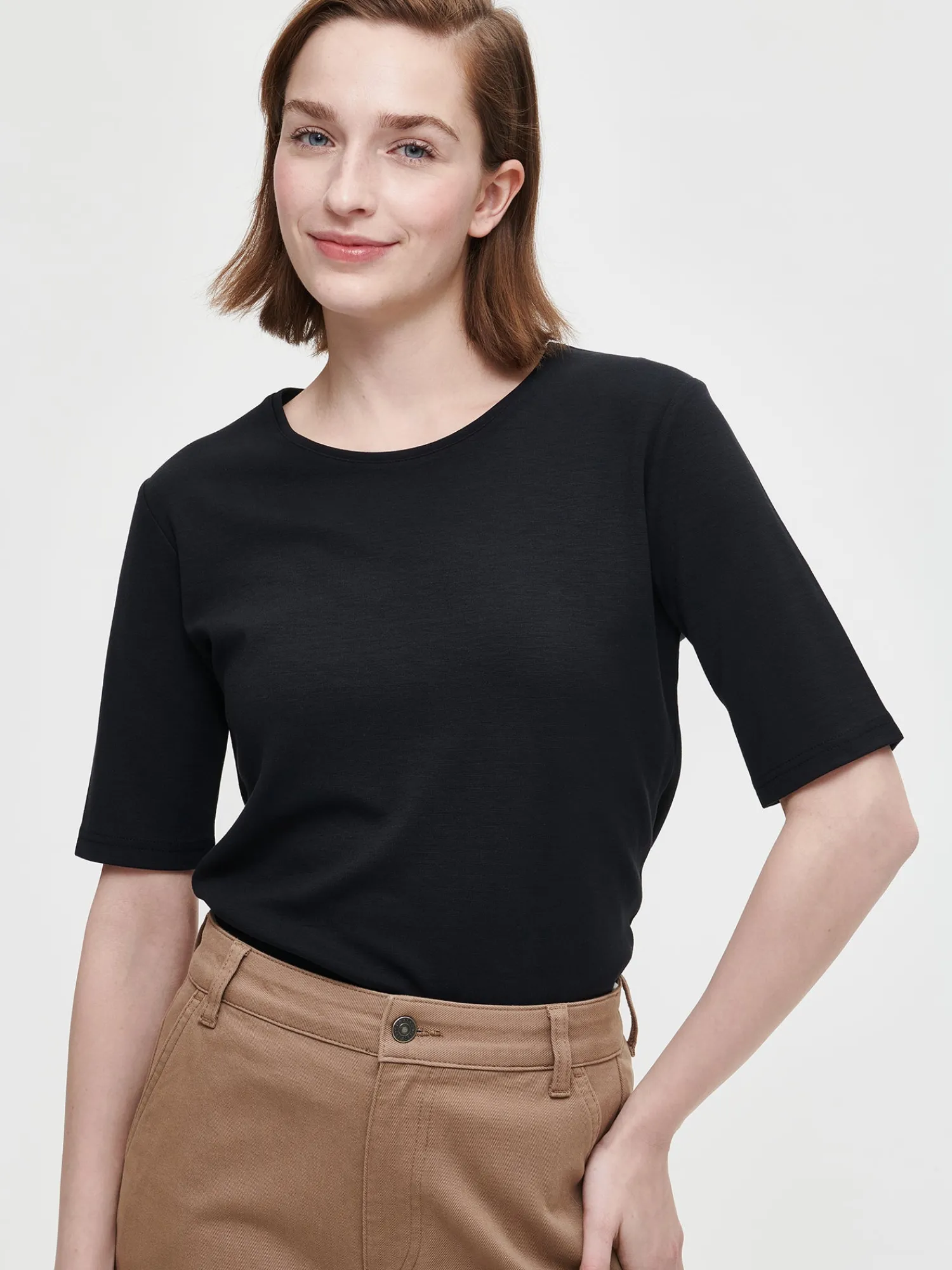 Naisten tyylikäs musta Aina T-paita. Klassinen t-paita on arjen monipuolinen luottovaate, johon on aina helppo pukeutua. Istuvassa T-paidassa on tereellä viimeistelty pyöreä pääntie. Hihat ovat 2/4 -mittaiset. T-paidan pituus koossa M on noin 62 cm. Materiaali on miellyttävän tuntuista, paksumpaa interlock-neulosta.
