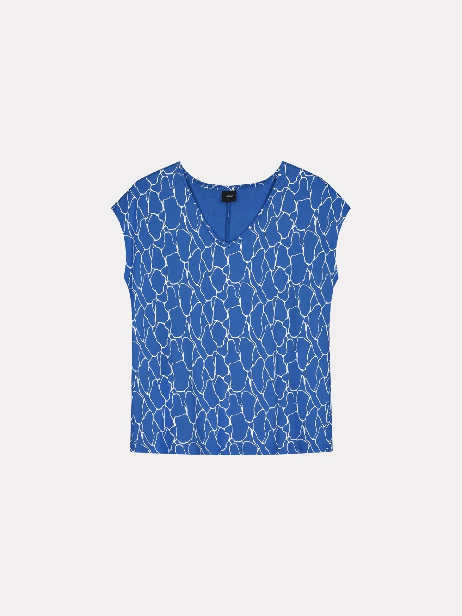 Naisten kuosillinen sininen Allas-pusero. Rento pusero sopii moniin eri asukokonaisuuksiin. Puserossa on tereellä viimeistelty v-pääntie ja holkkihihat. Puseron pituus koossa M on noin 65 cm. Materiaali on laadukasta ja helppohoitoista puuvilla-elastaani-neulosta, joka pysyy hyvänä pesusta toiseen.