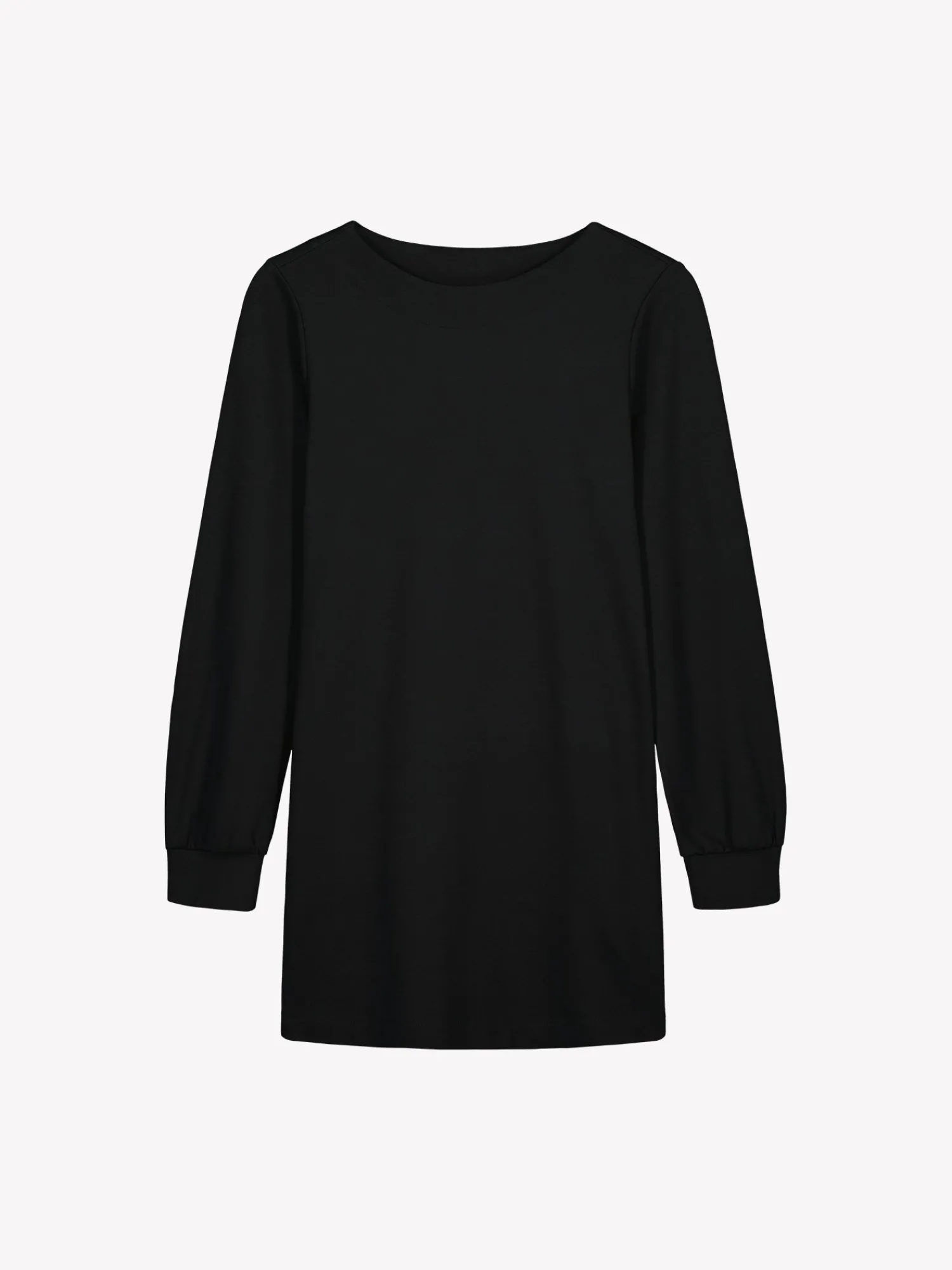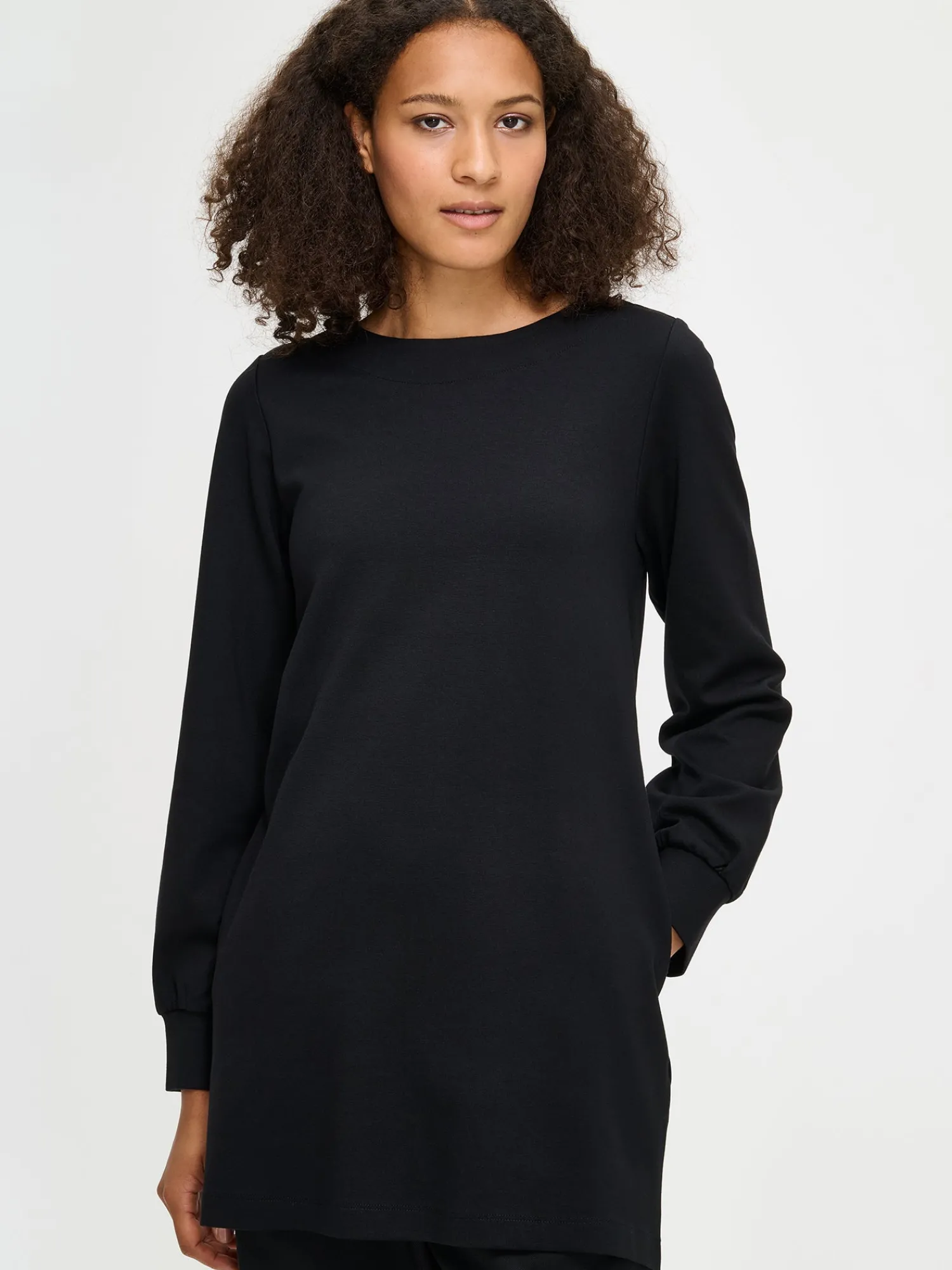 Naisten musta Arkki-tunika. Tunikassa on ovaali pääntie, joka on huoliteltu alavaralla. A-linjaisessa tunikassa on sivutaskut ja suora helma. Täyspitkät hihat poimuttuvat kauniisti hihansuun leveän kaksinkertaisen kaitaleen yläpuolelle. Tunikan pituus koossa 38 on noin 80 cm. Materiaali on laadukasta ja miellyttävän tuntuista viskoosi-polyamidi-elastaani-neulosta. Viskoosineulos on sähköistymätöntä ja helppohoitoista. Materiaalille on ominaista 3-5% kutistuminen ensimmäisessä pesussa.