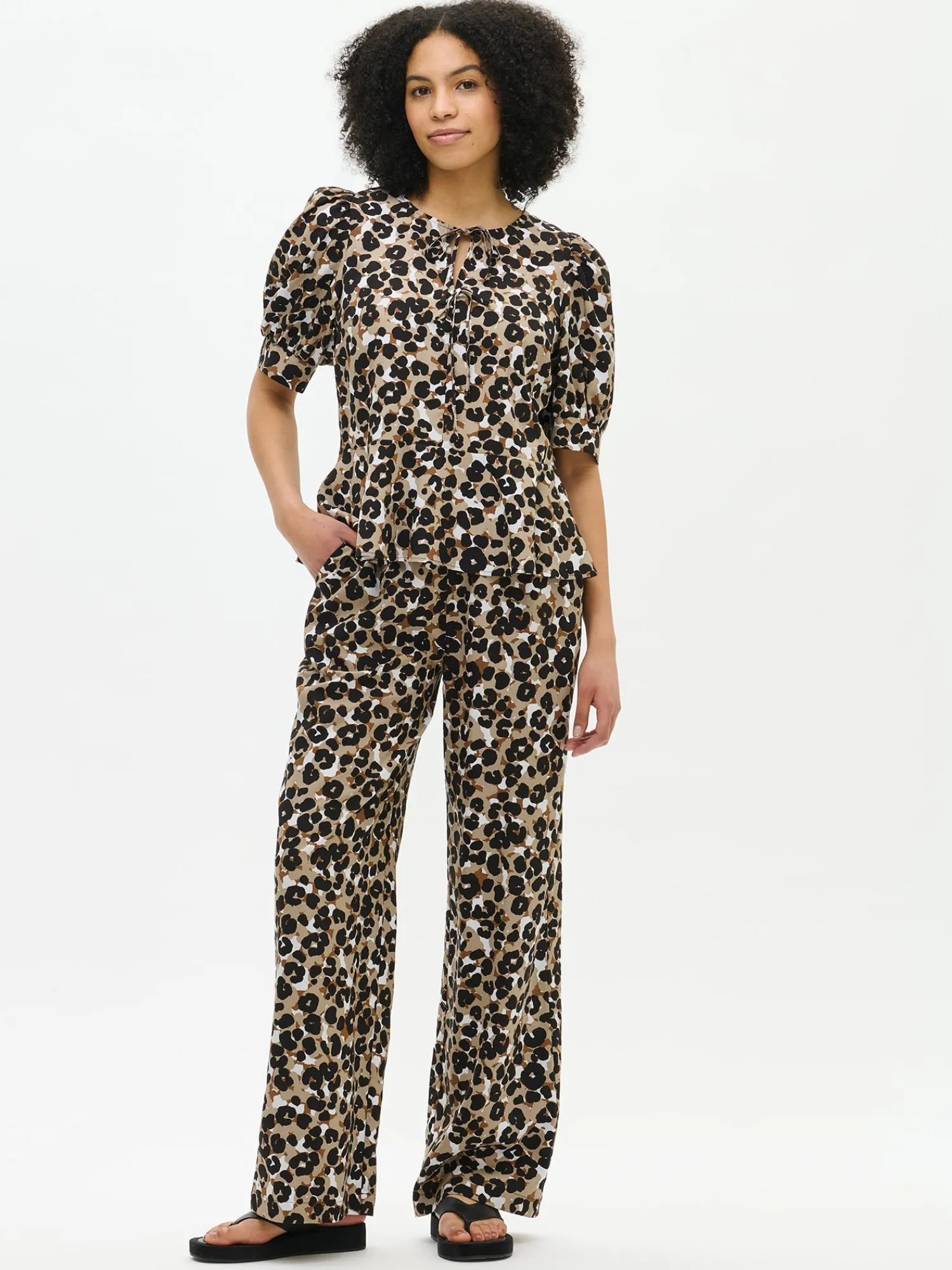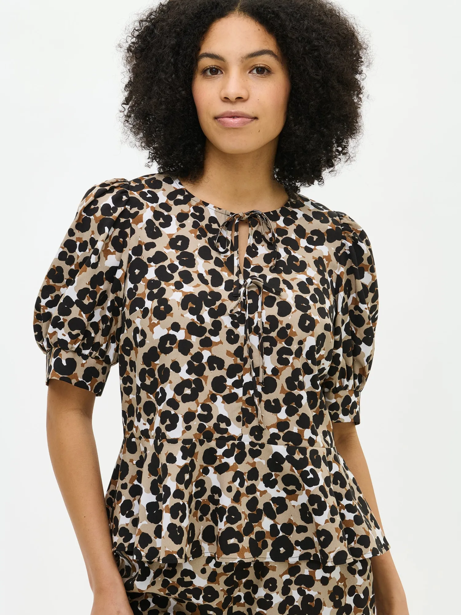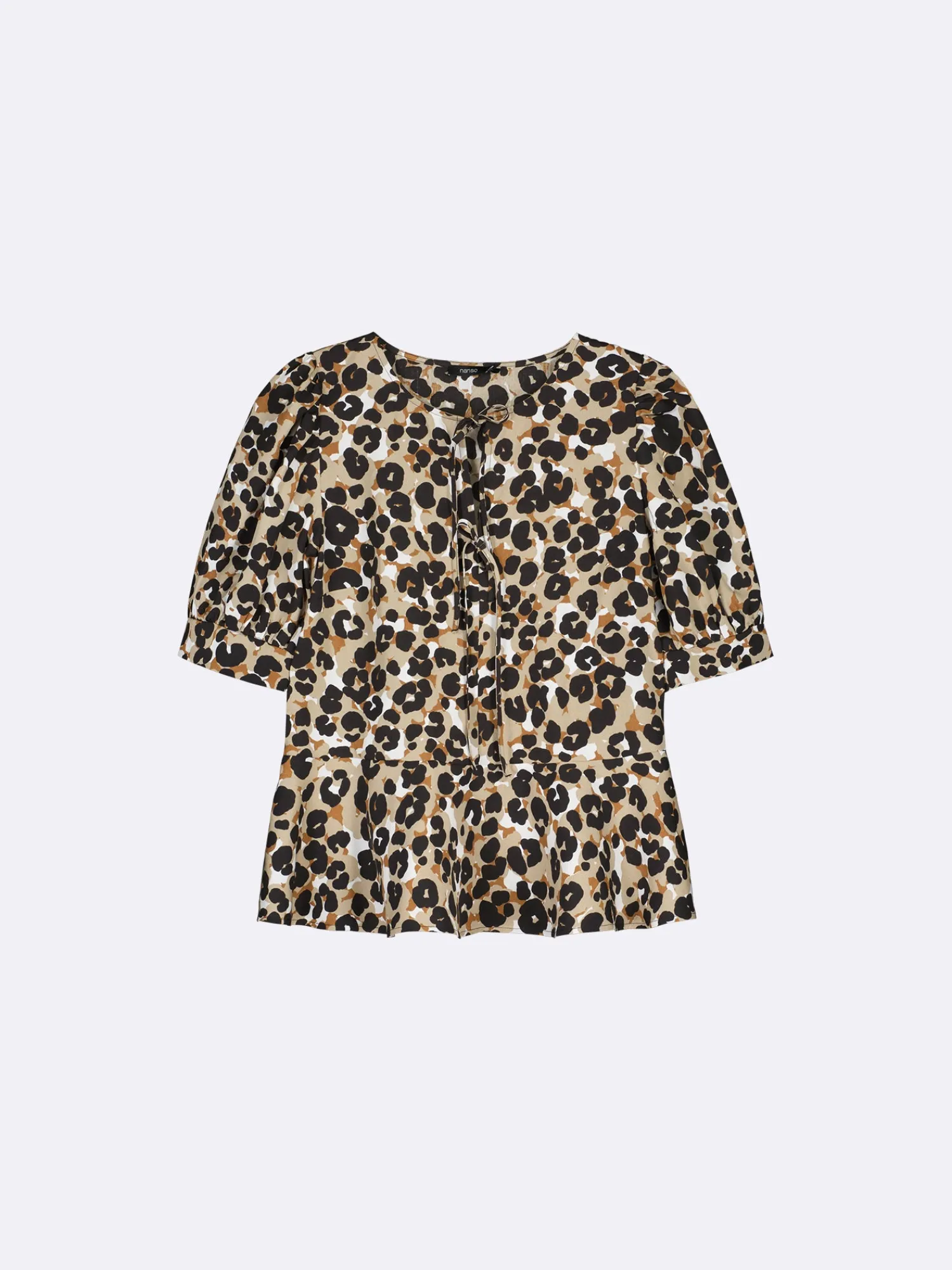Naisten pantterikuviollinen ruskea Babette-pusero. Puserossa on kantilla viimeistelty pyöreä pääntie ja edessä yksityiskohtana halkio kahdella rusetilla, joista ylimmäinen on avattava. Pusero on yläosasta istuvampi ja helma on hieman kellotettu. 2/4 pituiset hihat poimuttuvat kauniisti hihansuun leveän kaitaleen yläpuolella. Puseron pituus koossa M on noin 62 cm. Materiaali on kevyttä miellyttävän tuntuista 100% Lyocell- kangasta. Materiaalille on ominaista 3-5% kutistuminen ensimmäisessä pesussa.