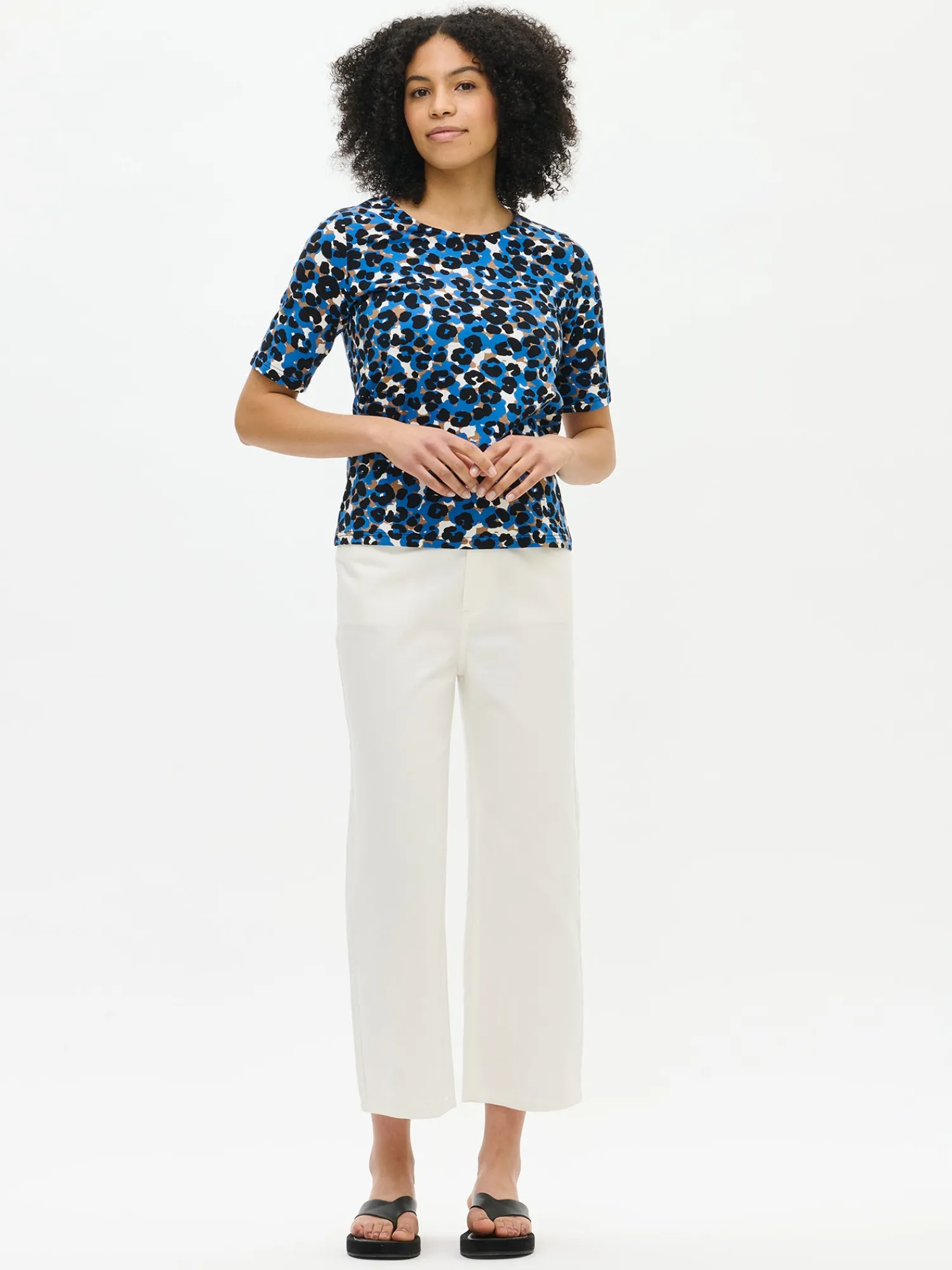 Naisten kuosillinen vaaleanpunainen Babette-pusero. T-paidassa on kantilla viimeistelty pyöreä pääntie. Puserossa on 2/4 pituiset hihat ja helma on suora. Puseron pituus koossa M on noin 64 cm. Materiaali on miellyttävää ja joustavaa puuvilla-elastaani-neulosta.