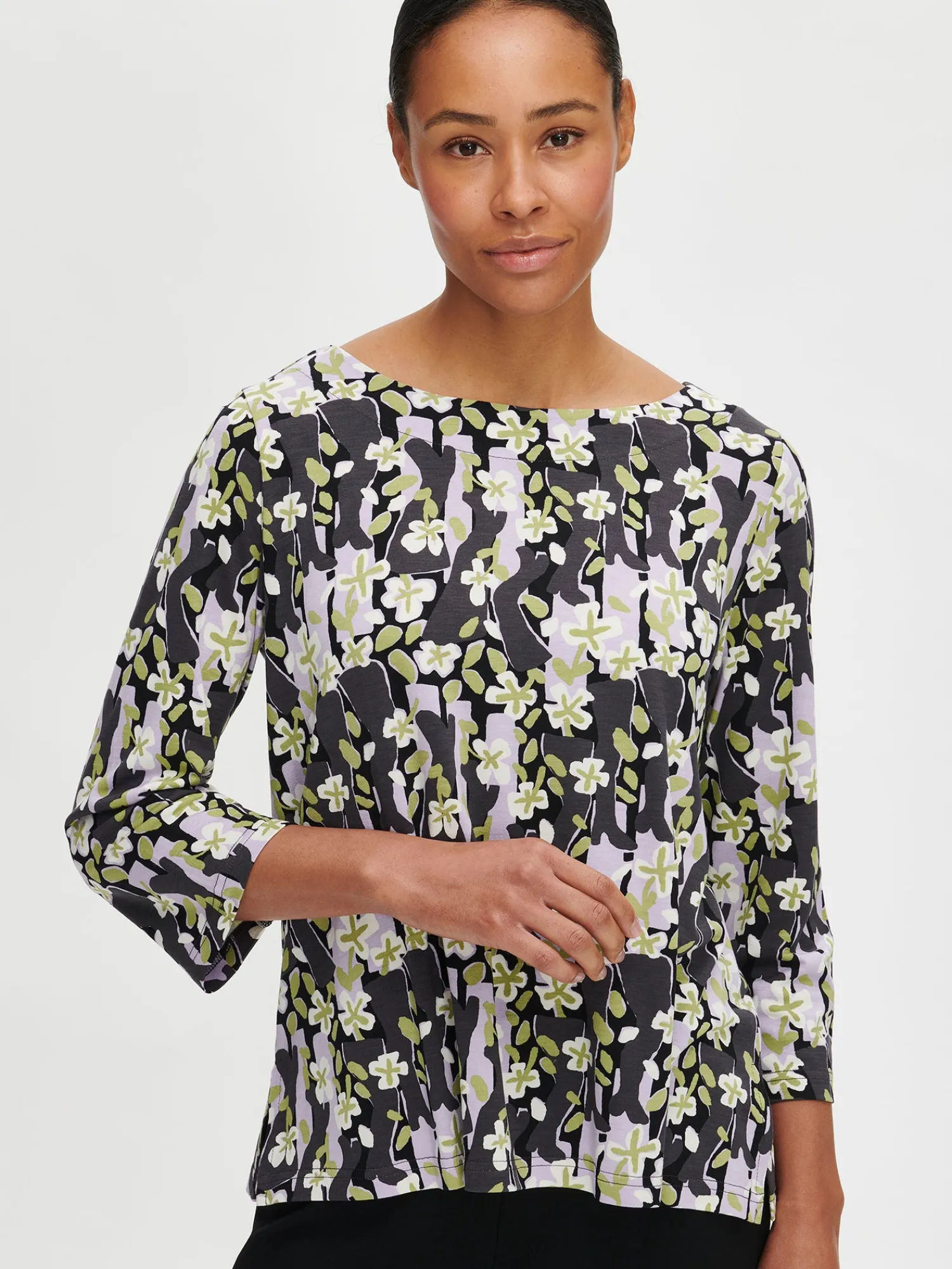 Naisten kuosillinen harmaa Bootsit-pusero. Väljässä puserossa on alavaralla viimeistelty ovaali pääntie, 3/4 pituiset hihat ja suora helma sivuhalkioilla. Puseron pituus koossa M on noin 60 cm ja sivuissa on halkiot. Materiaali on laadukasta, miellyttävän tuntuista ja laskeutuvaa viskoosi-elastaani-neulosta, joka pysyy hyvänä pesusta toiseen. Tuote on valmistettu LENZING™ ECOVERO™-viskoosista. Materiaalille on ominaista 3-5 % kutistuminen ensimmäisessä pesussa.