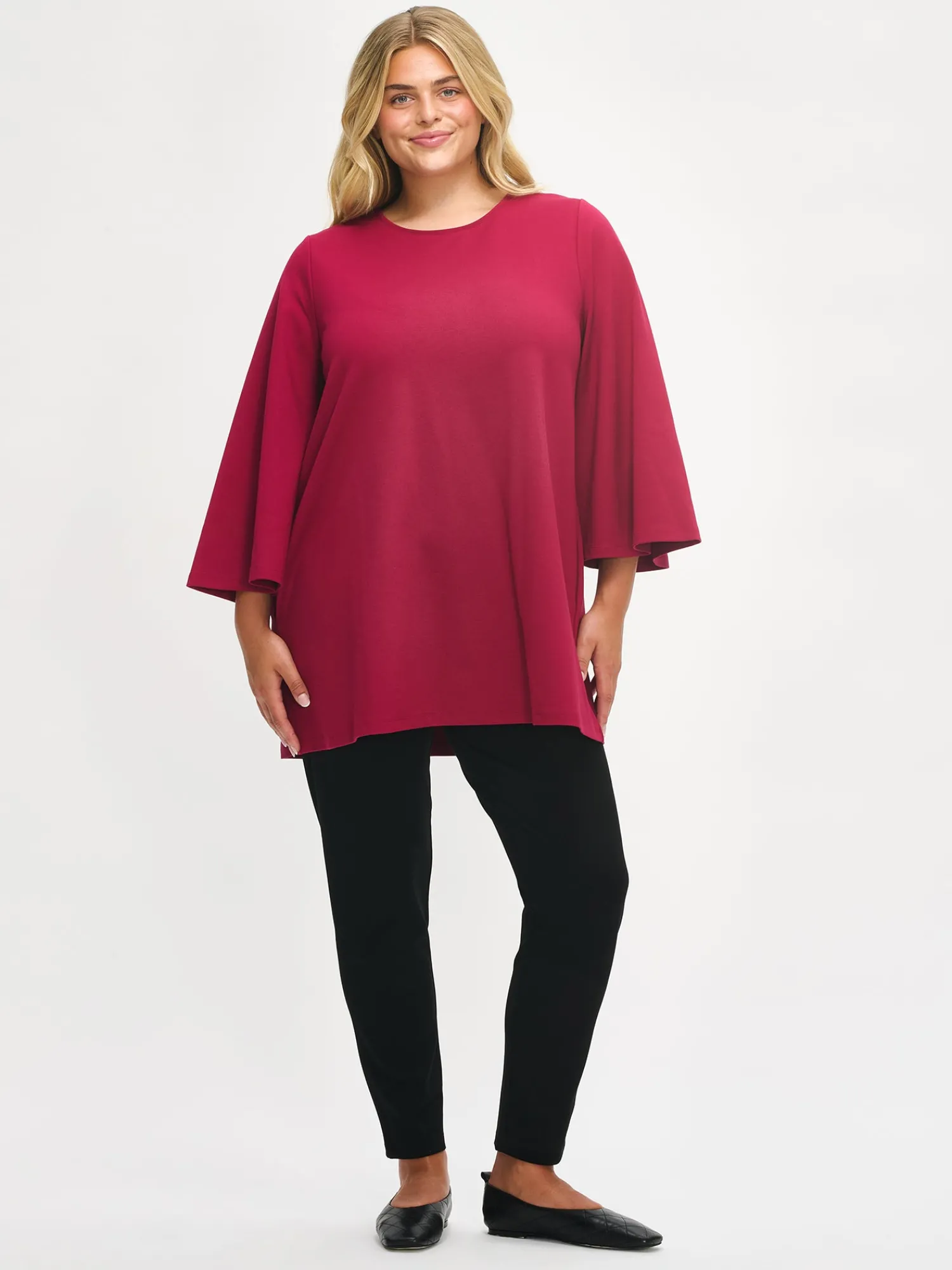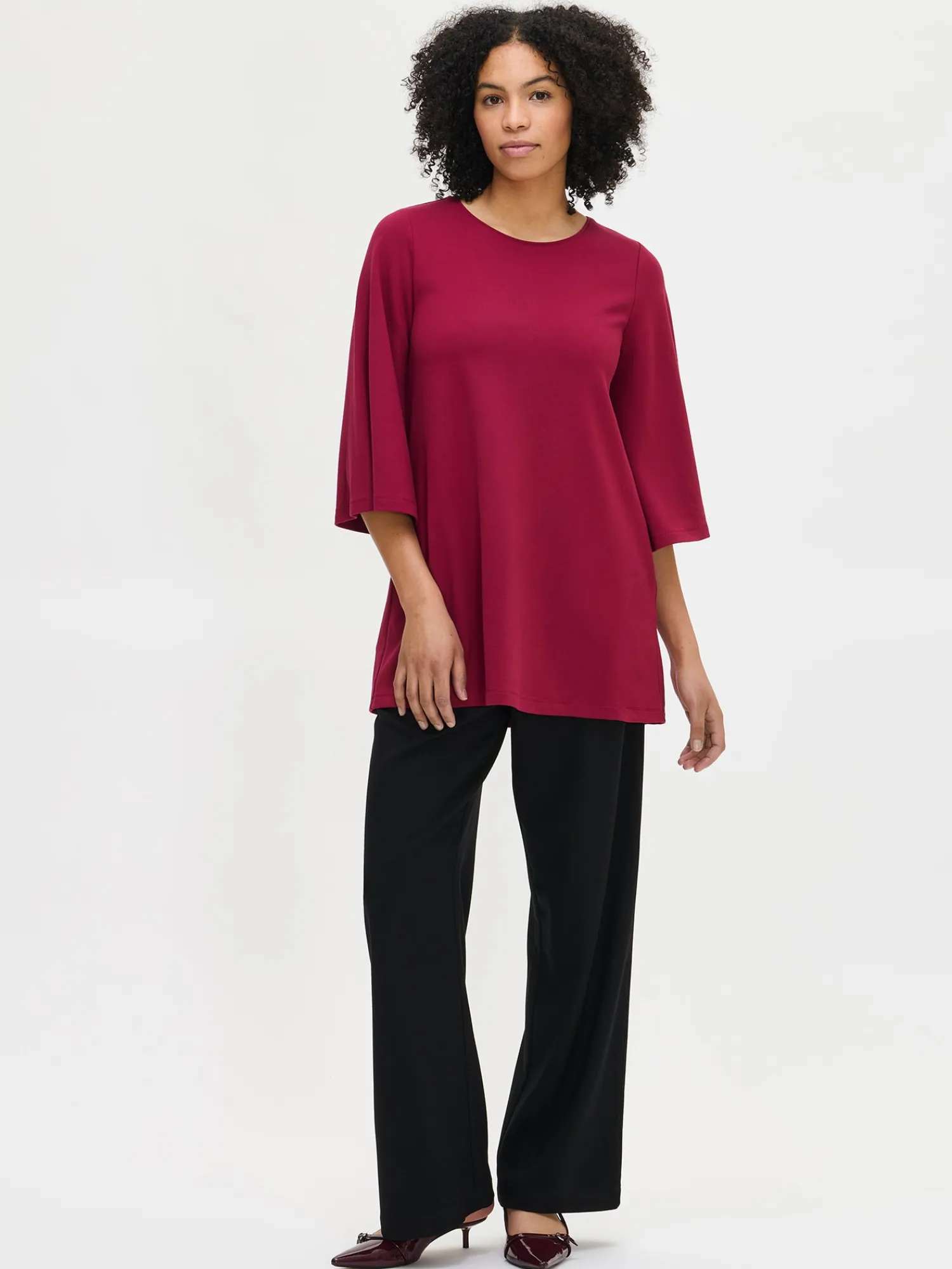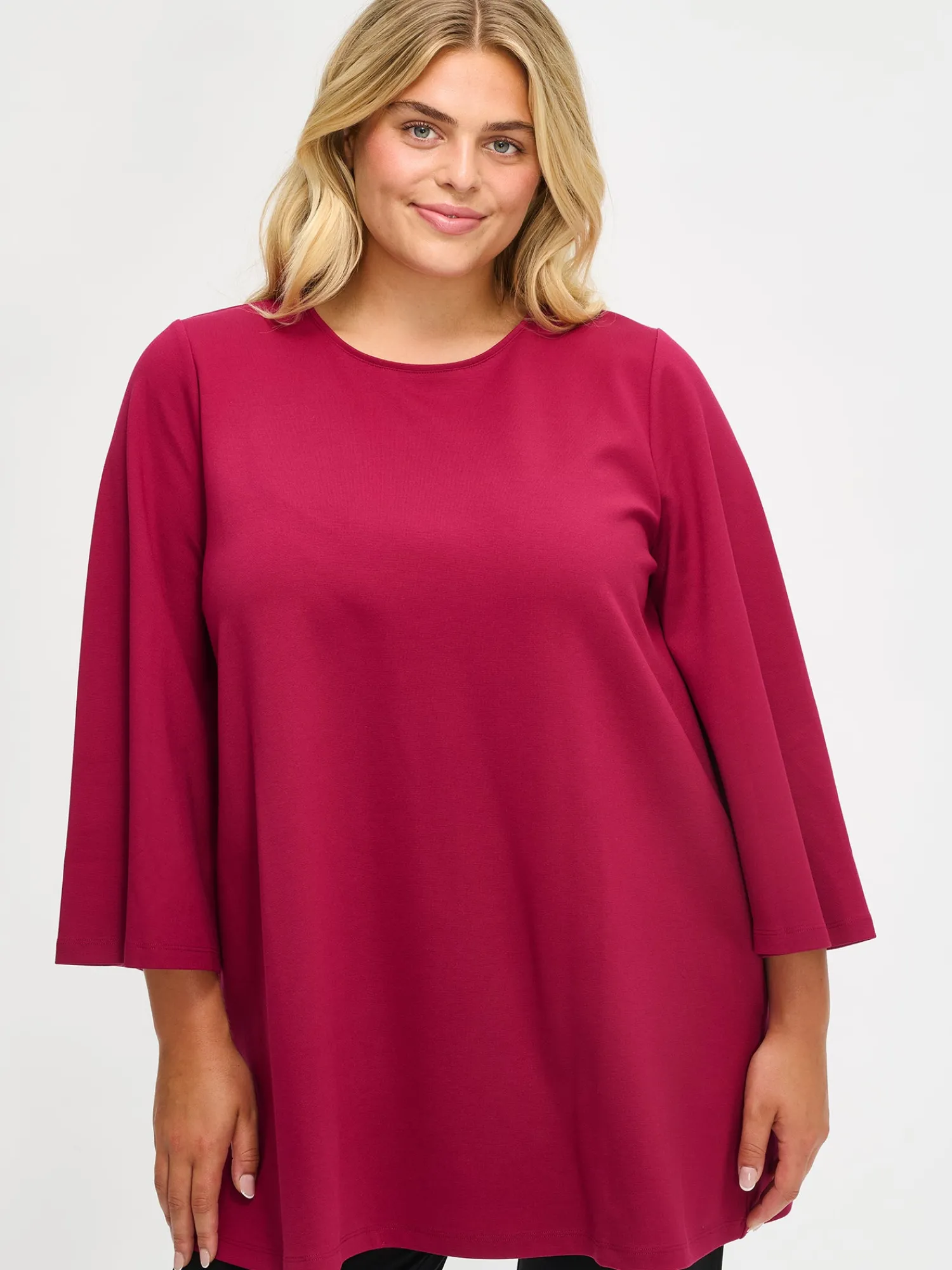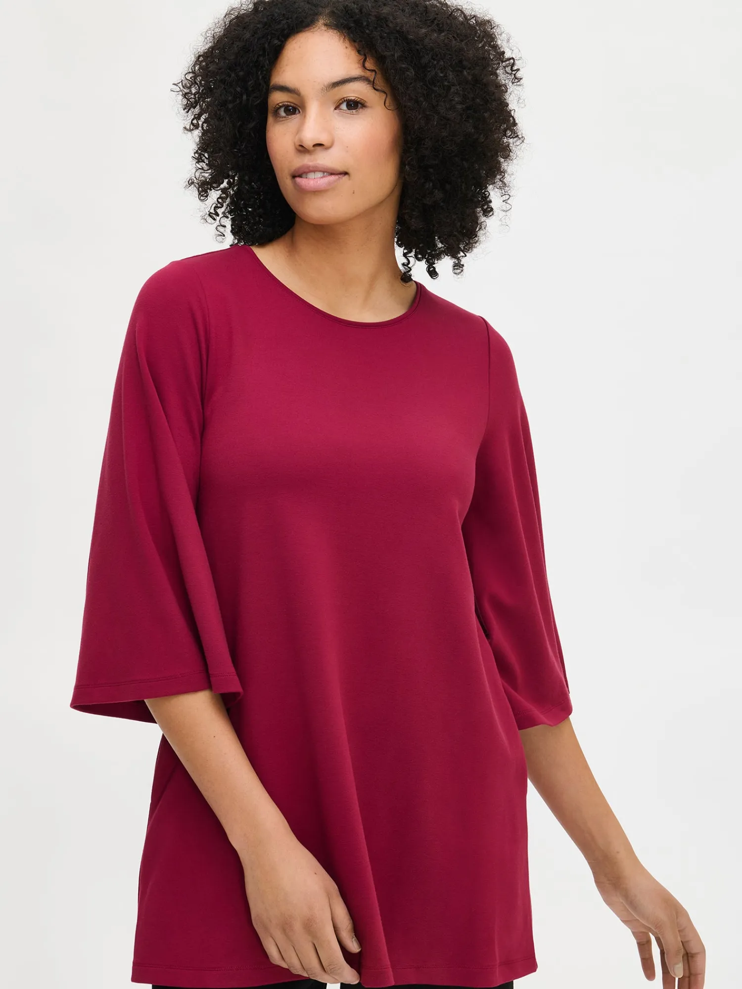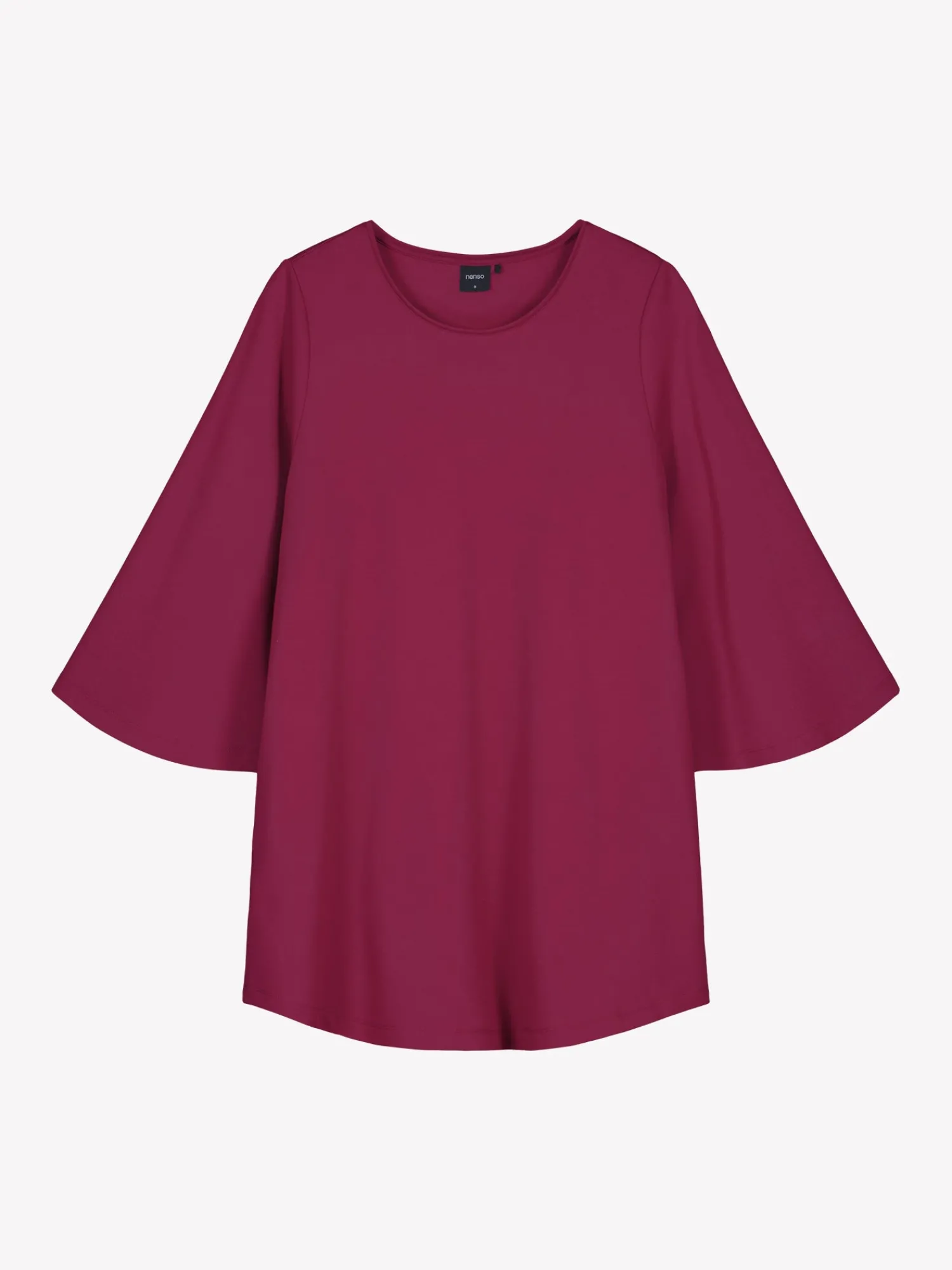 Naisten ajaton viininpunainen Elegia-tunika. Tunikassa on pyöreä pääntie, 3/4 pituiset kellotetut hihat ja taskut. Tunikan pituus koossa M on noin 81 cm. Materiaali on miellyttävän tuntuista interlock-neulosta.
