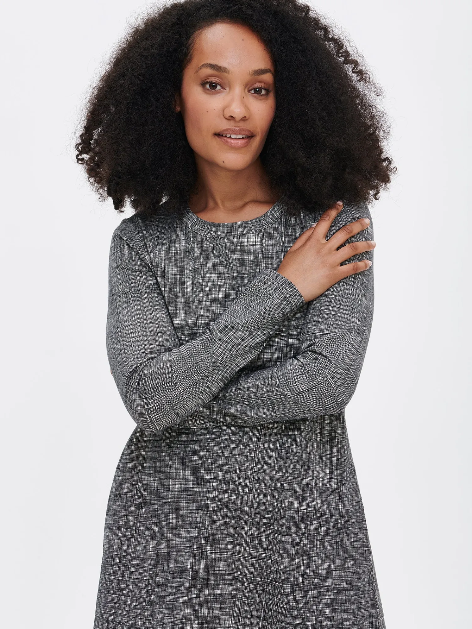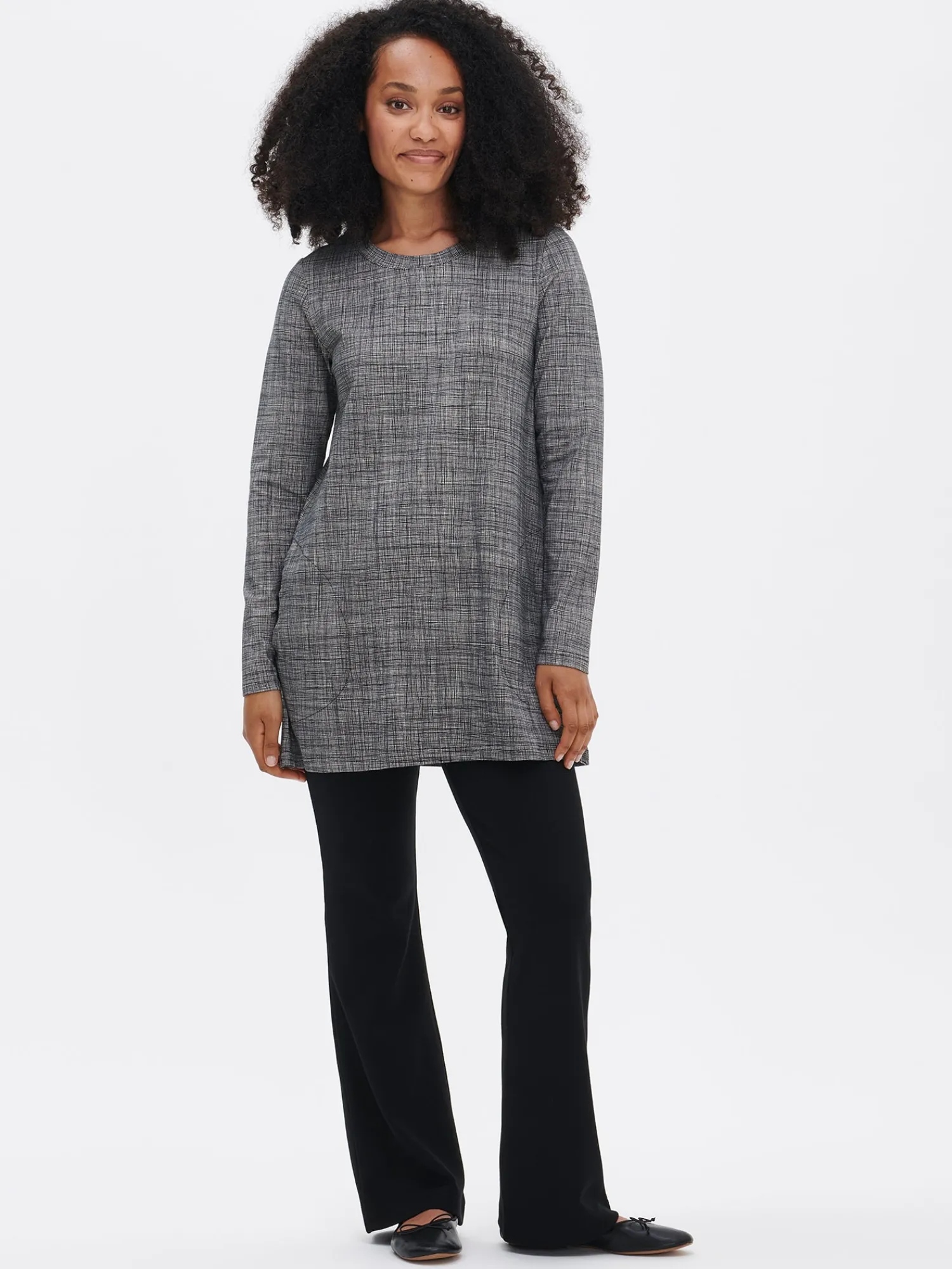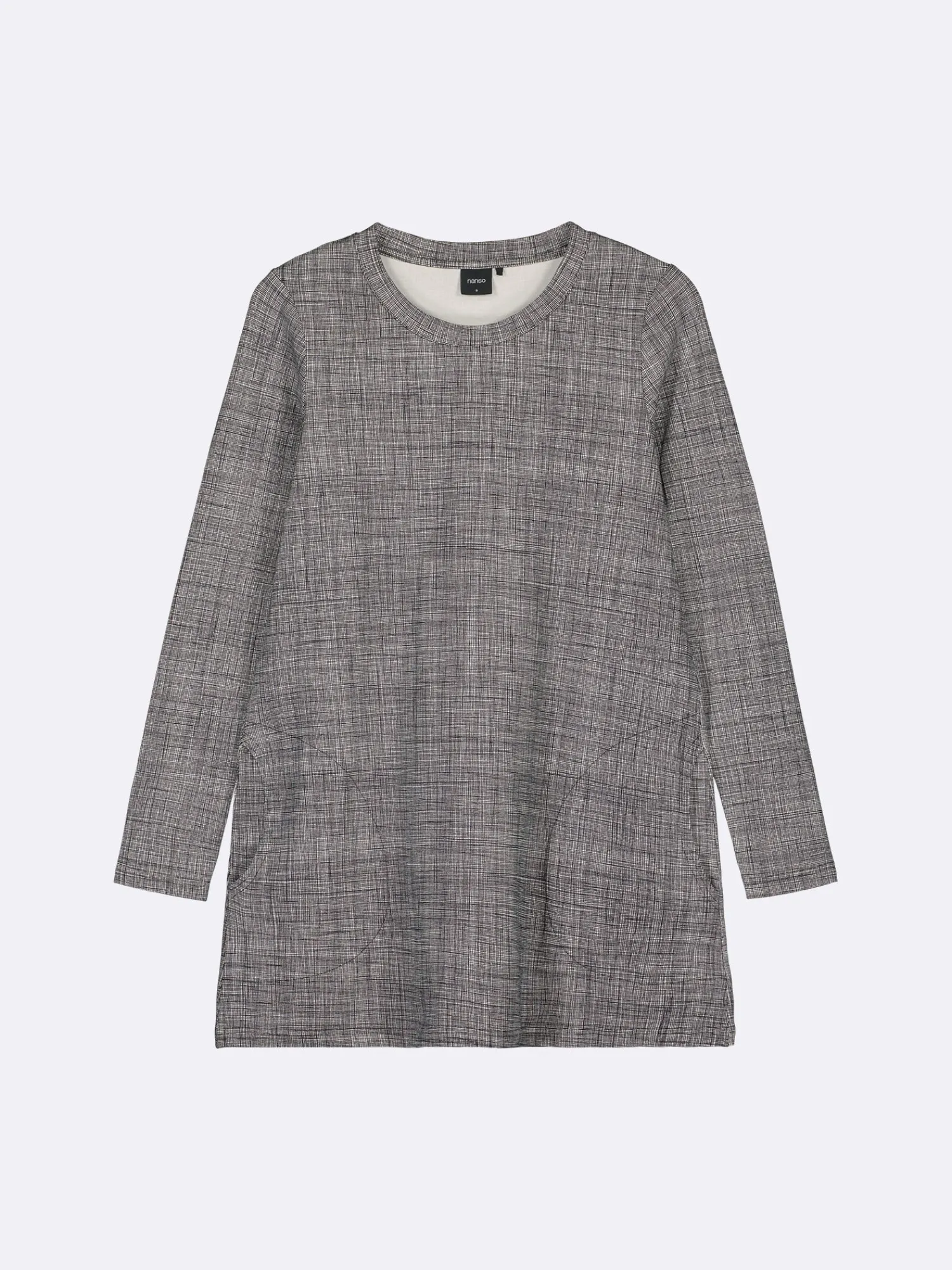 Naisten kuosillinen mustavalkoinen Harso-tunika. Tunikassa on leveällä listalla viimeistelty pyöreä pääntie, sivuissa taskut ja täyspitkät hihat. Tunikan pituus koossa M on noin 80cm. Materiaali on miellyttävän tuntuista ja helppohoitoista puuvilla-elastaani-neulosta.