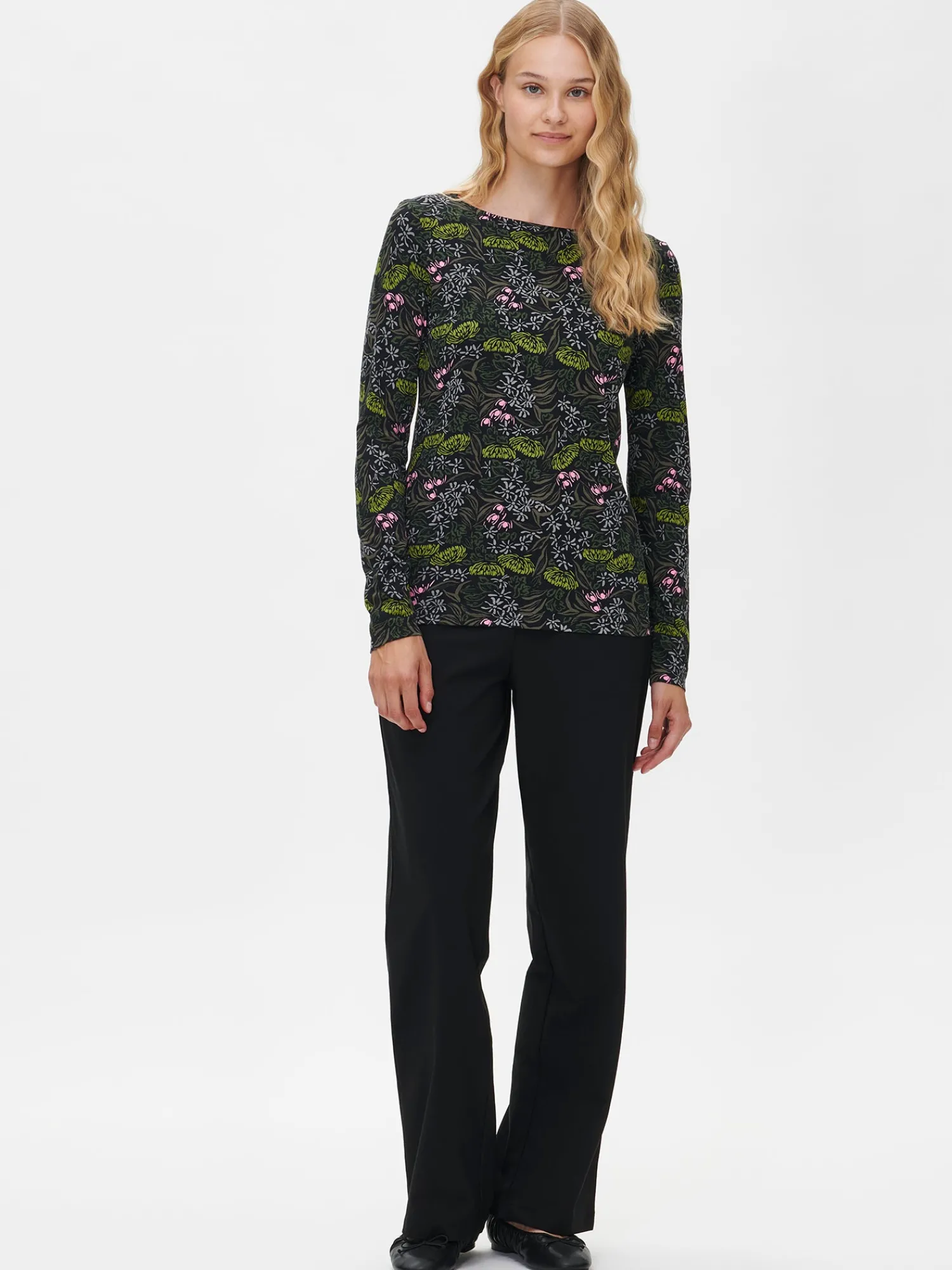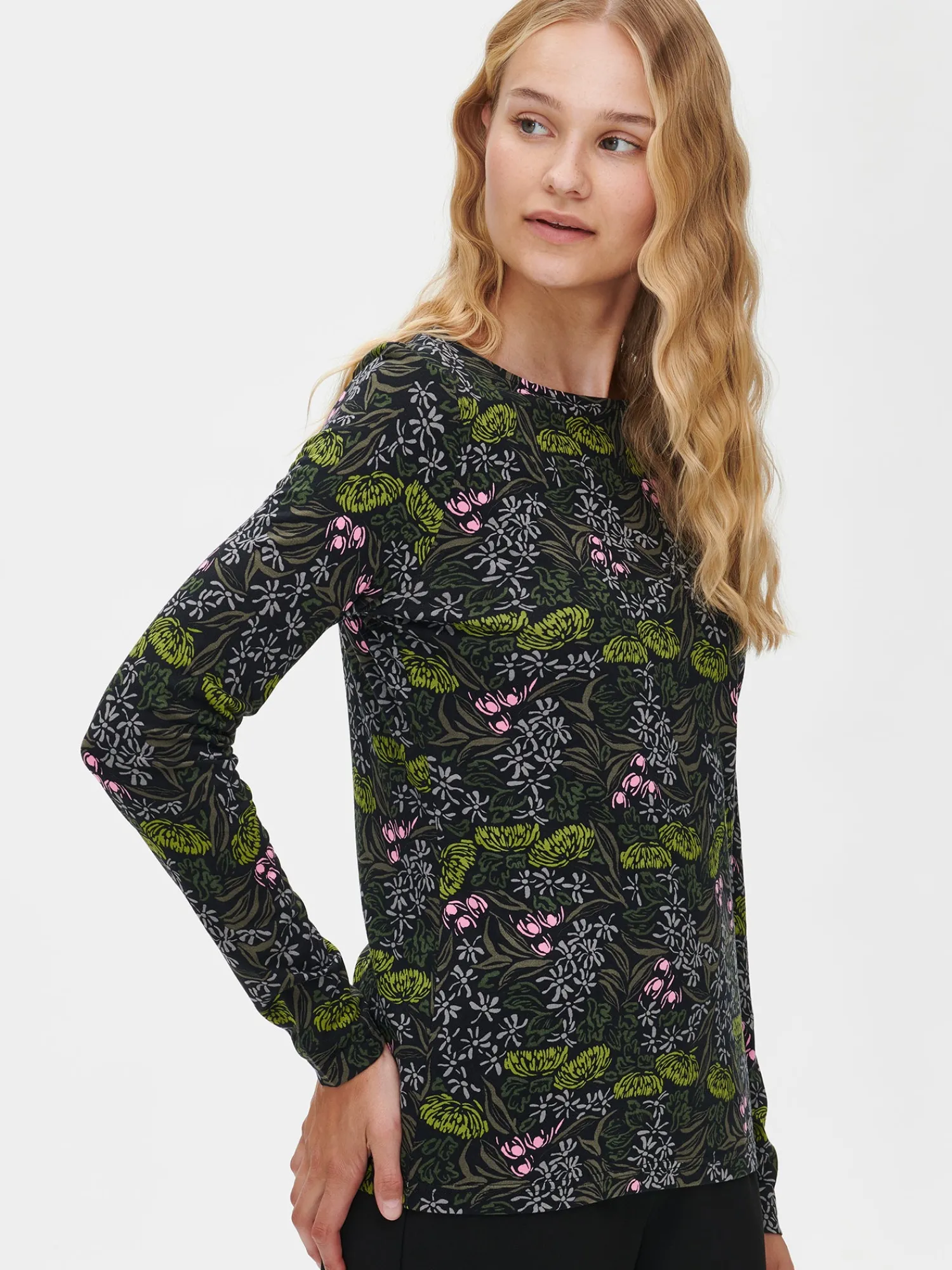 Naisten kuosillinen Jalava-pusero. Istuvassa puserossa on kantilla viimeistelty venepääntie ja täyspitkät hihat. Puseron pituus koossa M on noin 65 cm. Kauniisti laskeutuvan puseron materiaali on laadukasta ja miellyttävän tuntuista viskoosi-elastaani-neulosta. Viskoosineulos on sähköistymätöntä ja helppohoitoista. Tuote on valmistettu LENZING™ ECOVERO™ -viskoosista. Materiaalille on ominaista 3-5% kutistuminen ensimmäisessä pesussa.