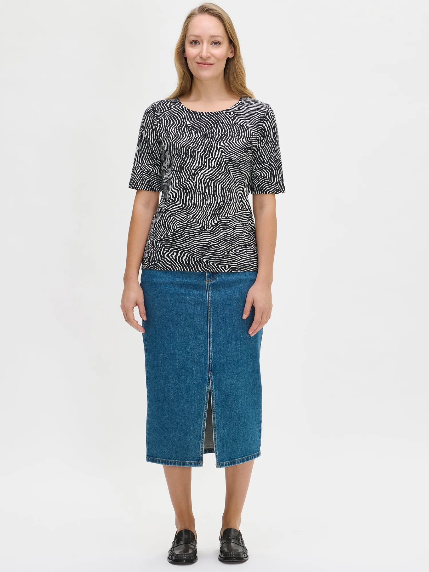 Naisten kuosillinen mustavalkoinen Jälki-t-paita. T-paidassa on kantilla viimeistelty pyöreä pääntie. T-paidassa on 2/4 pituiset hihat ja helma on suora. Paidan pituus koossa M on noin 64 cm. Materiaali on miellyttävää ja joustavaa puuvilla-elastaani-neulosta.