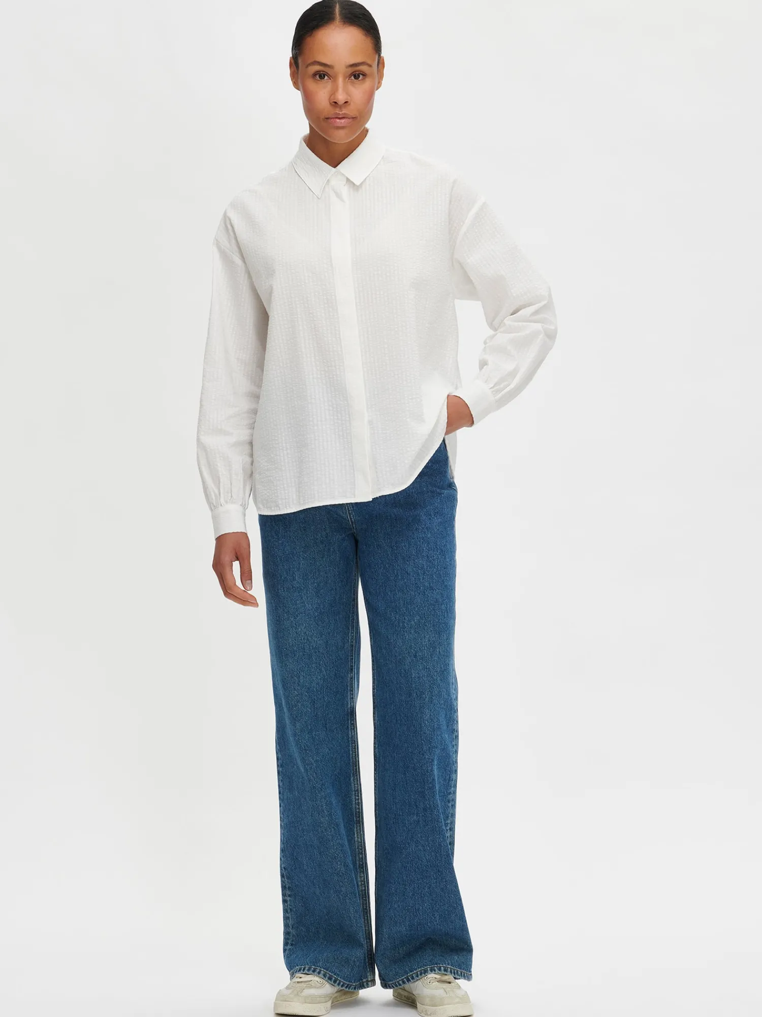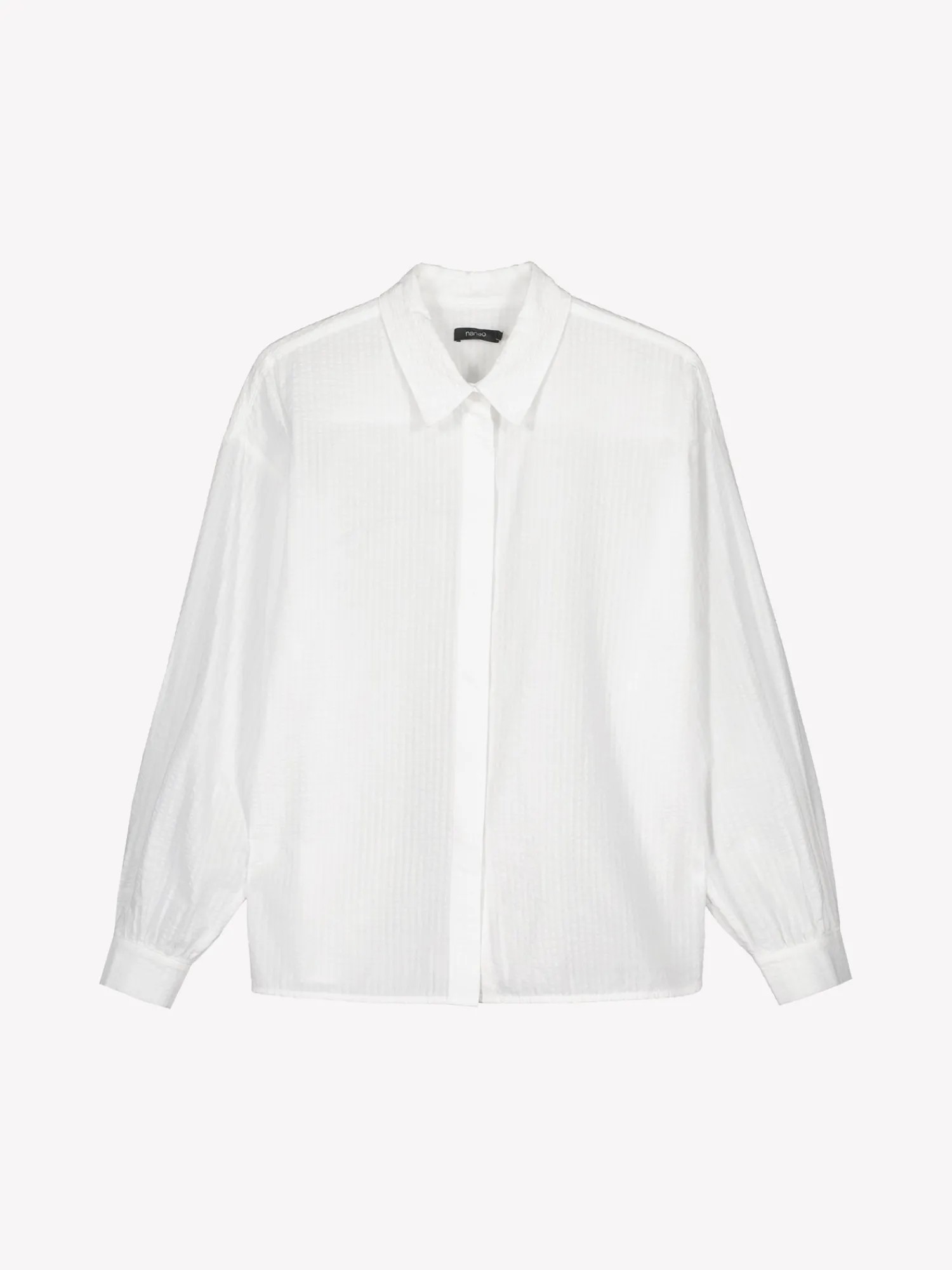 Naisten valkoinen Justiinsa kauluspaita. Väljässä paitapuserossa on kaulus, edessä piilonapitus ja pyöristetty helma sivuhalkioilla. Paitapuserossa on pudotettu olka ja täyspitkät hihat poimuttuvat hihansuussa nappikalvosimien yläpuolelle. Puseron pituus koossa 38 on noin 67 cm. Tuote on valmistettu kudotusta seersucker puuvillakankaasta, jossa on kaunis pintastruktuuri. Materiaalissa käytetty puuvilla on sertifioitua. Materiaalille on ominaista 3-5% kutistuminen ensimmäisessä pesussa.