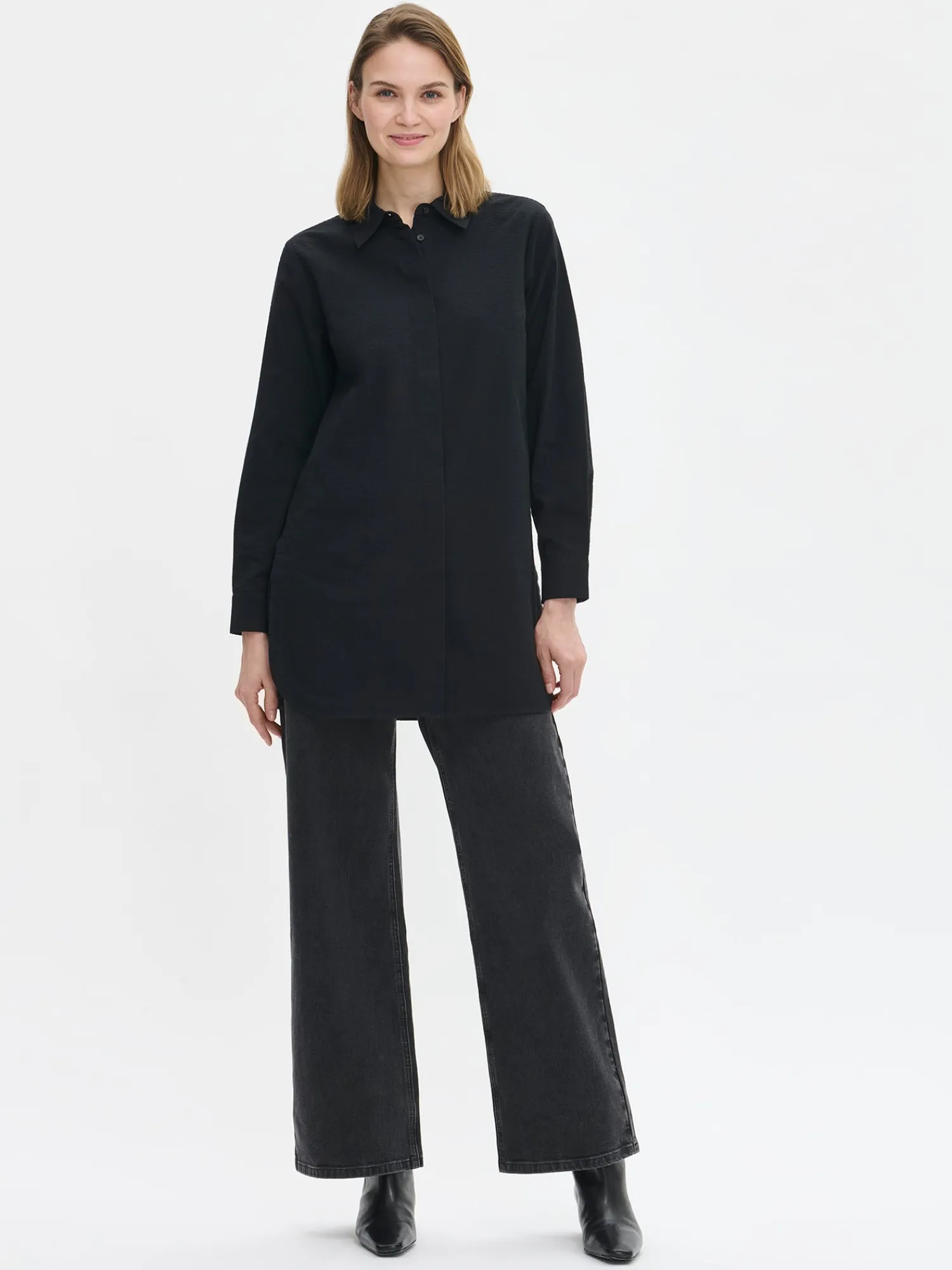 Naisten pitkä, musta Justiinsa-paitapusero. Monikäyttöinen, klassisen paitapuseron rennompi versio on mukavaa seersucker puuvillakangasta. Puserossa on kaulus, piilonapitus edessä, sivuissa halkiot ja pyöristetty helma. Hihat ovat täyspitkät ja hihansuissa on nappikalvosimet. Puseron pituus koossa 38 on noin 85 cm. Tuote on valmistettu kudotusta 100 % puuvillakankaasta, jossa on kaunis pintastruktuuri. Materiaalissa käytetty puuvilla on sertifioitua. Materiaalille on ominaista 3-5 % kutistuminen ensimmäisessä pesussa.