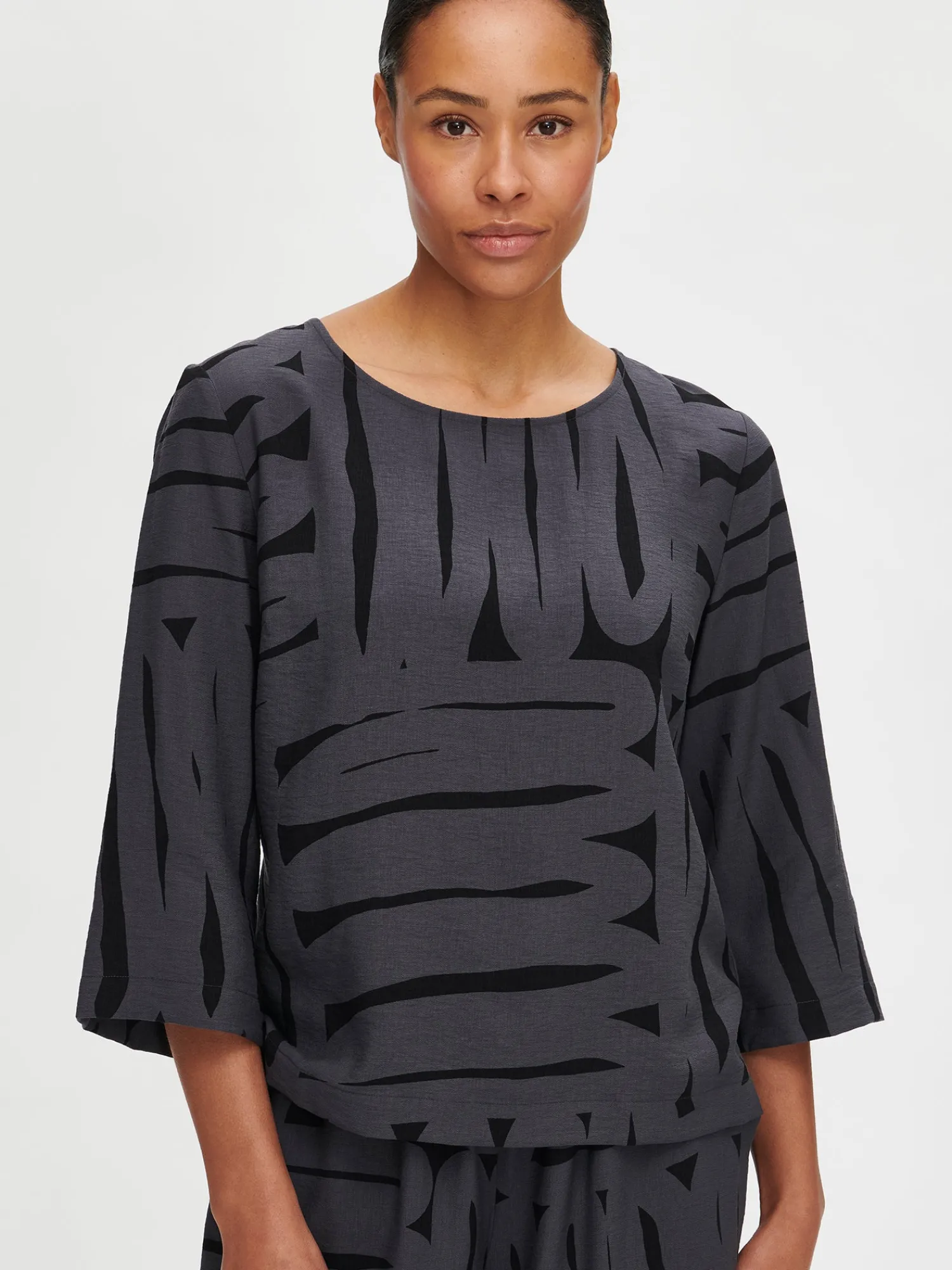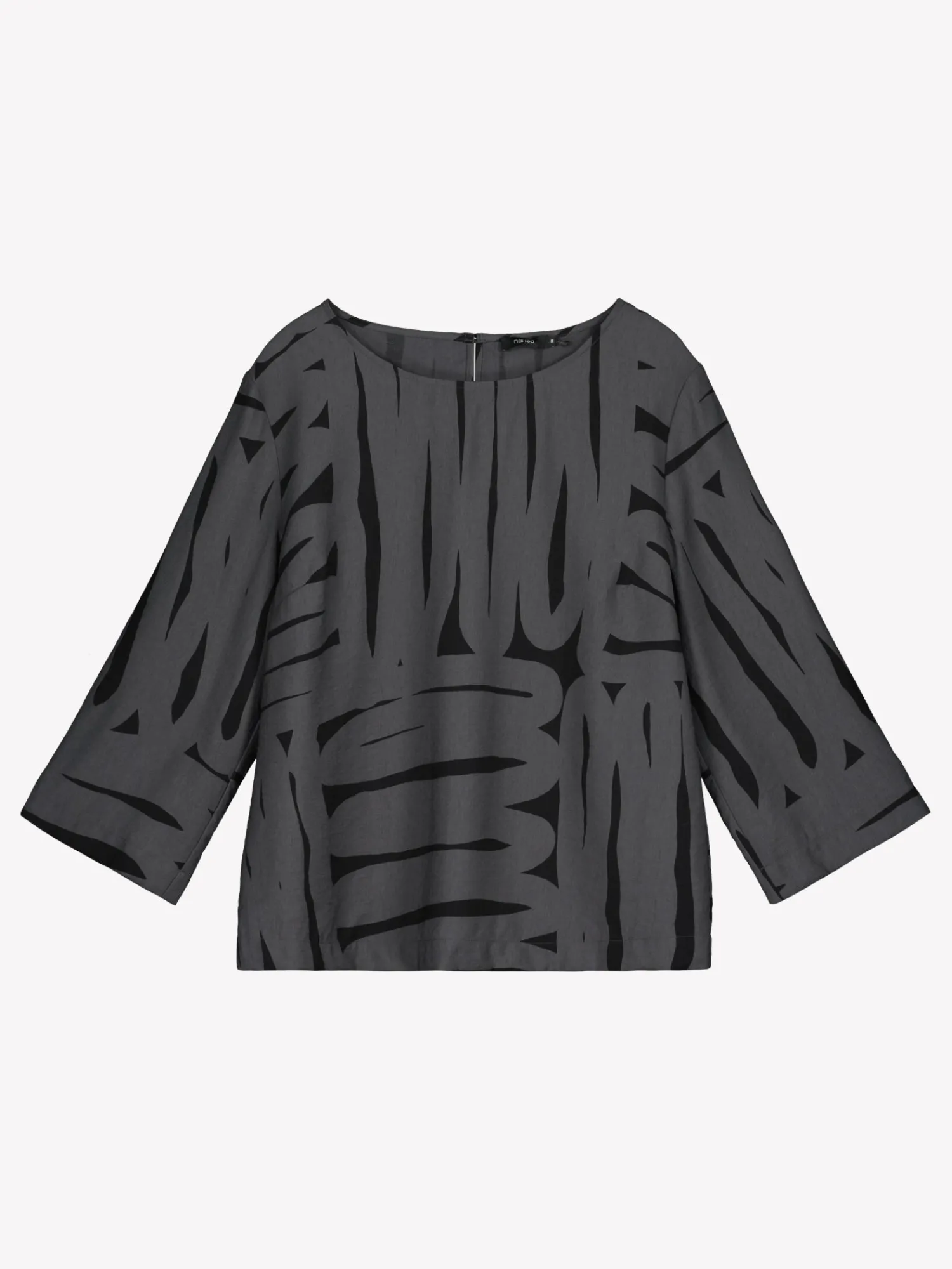 Naisten kuosillinen harmaa Kaiku-pusero. Pusero yhdistyy kauniisti samanvärisiin Kaiku-housuihin. Suoralinjaisessa puserossa on kantilla viimeistelty ovaali pääntie, jonka takana on nappihalkio. Väljät hihat ovat 3/4 pituiset. Puseron pituus koossa 38 on noin 62 cm. Materiaali on laadukasta ja miellyttävän tuntuista, kevyttä twill-sidoksista viskoosi-polyamidikangasta.