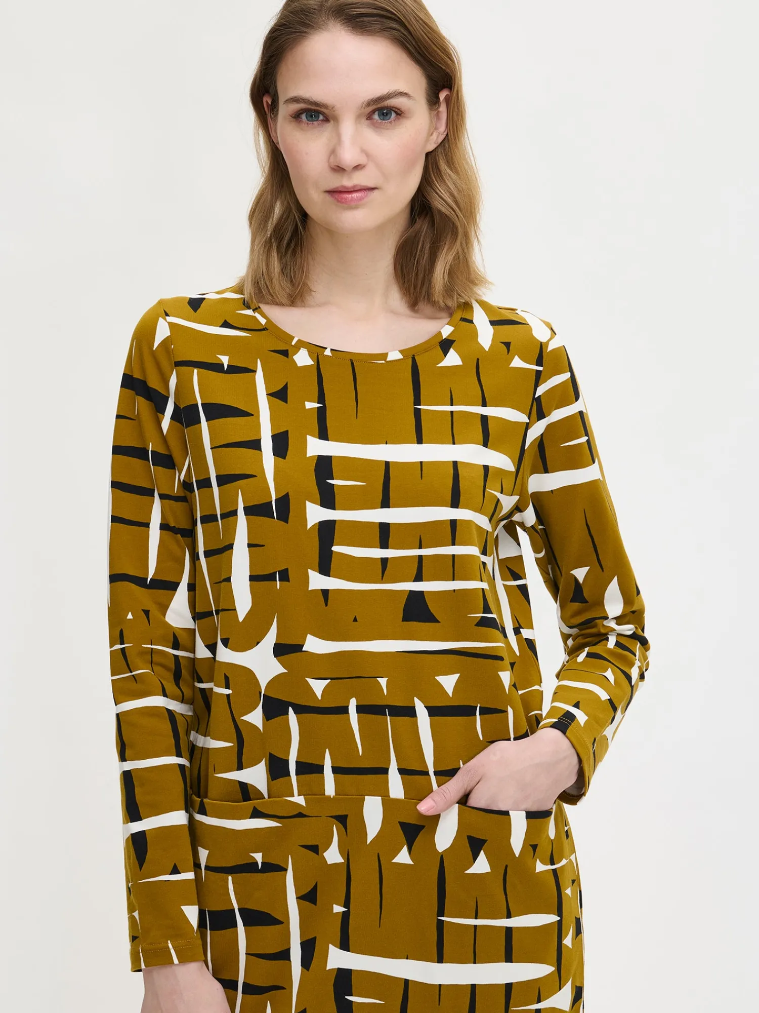 Naisten kuosillinen ruskea Kaiku-tunika. Suoralinjaisessa tunikassa on tereellä viimeistelty pyöreä pääntie ja täyspitkät hihat. Tunikan leikkaussaumassa on upotettuna taskut. Tunikan pituus koossa M on noin 85 cm. Materiaali on miellyttävän tuntuista ja helppohoitoista puuvilla-elastaani-neulosta.