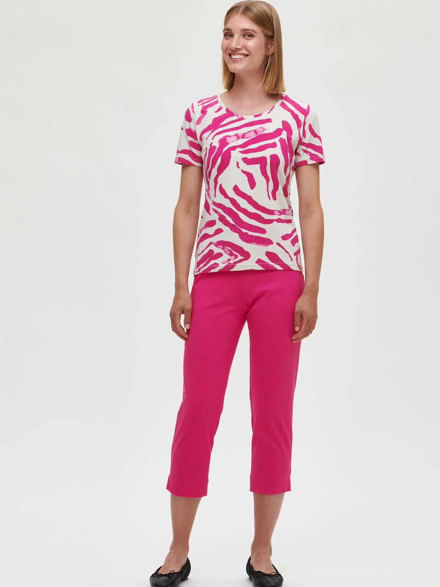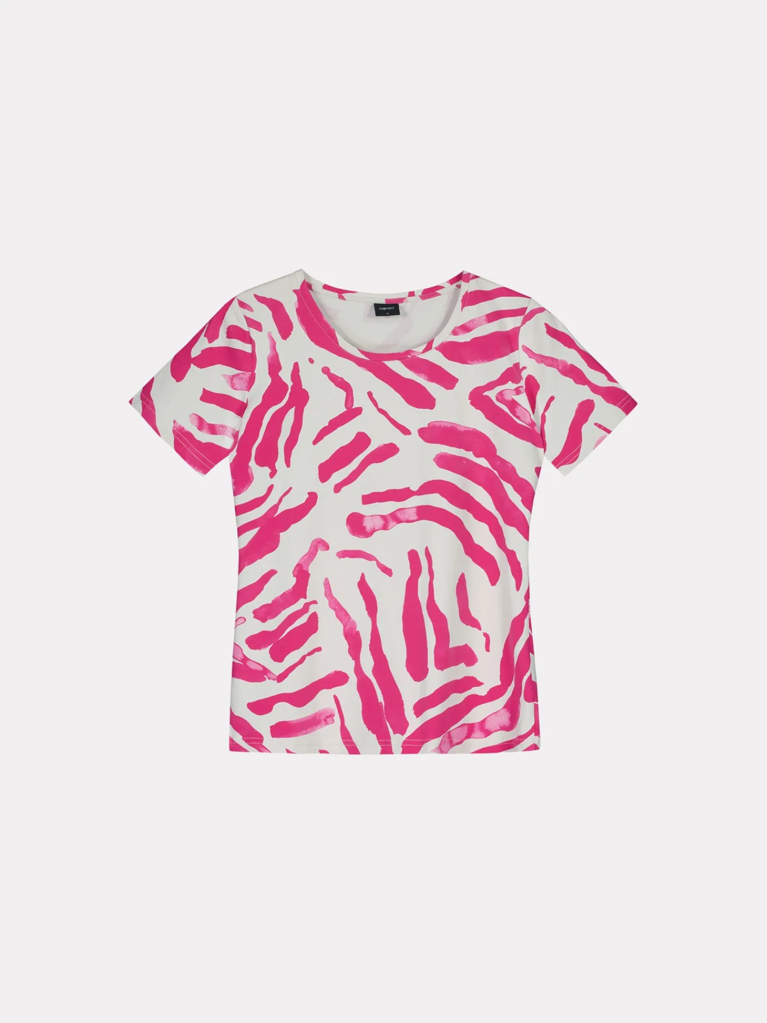 Naisten kuosillinen pinkki Klippan-pusero. Istuvassa puserossa on avara, pyöreä pääntie ja lyhyet hihat. Puseron pituus koossa M on noin 64 cm. Materiaali on laadukasta ja helppohoitoista puuvilla-elastaani-neulosta, joka pysyy hyvänä pesusta toiseen.
