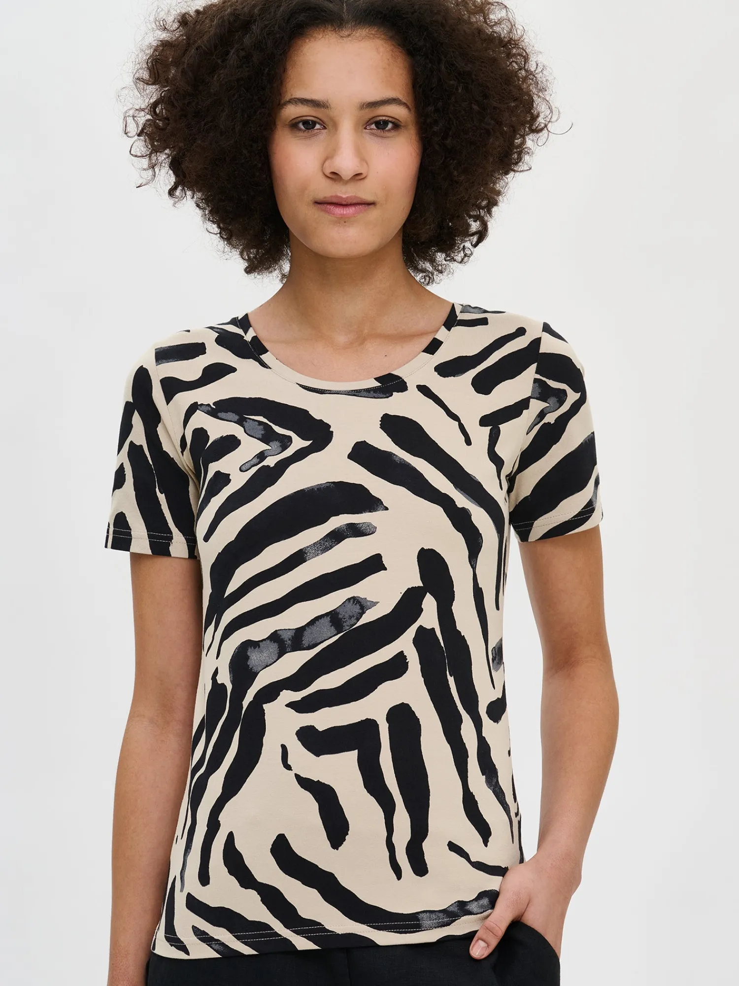 Naisten kuosillinen musta Klippan-pusero. Istuvassa puserossa on avara, pyöreä pääntie ja lyhyet hihat. Puseron pituus koossa M on noin 64 cm. Materiaali on laadukasta ja helppohoitoista puuvilla-elastaani-neulosta, joka pysyy hyvänä pesusta toiseen.
