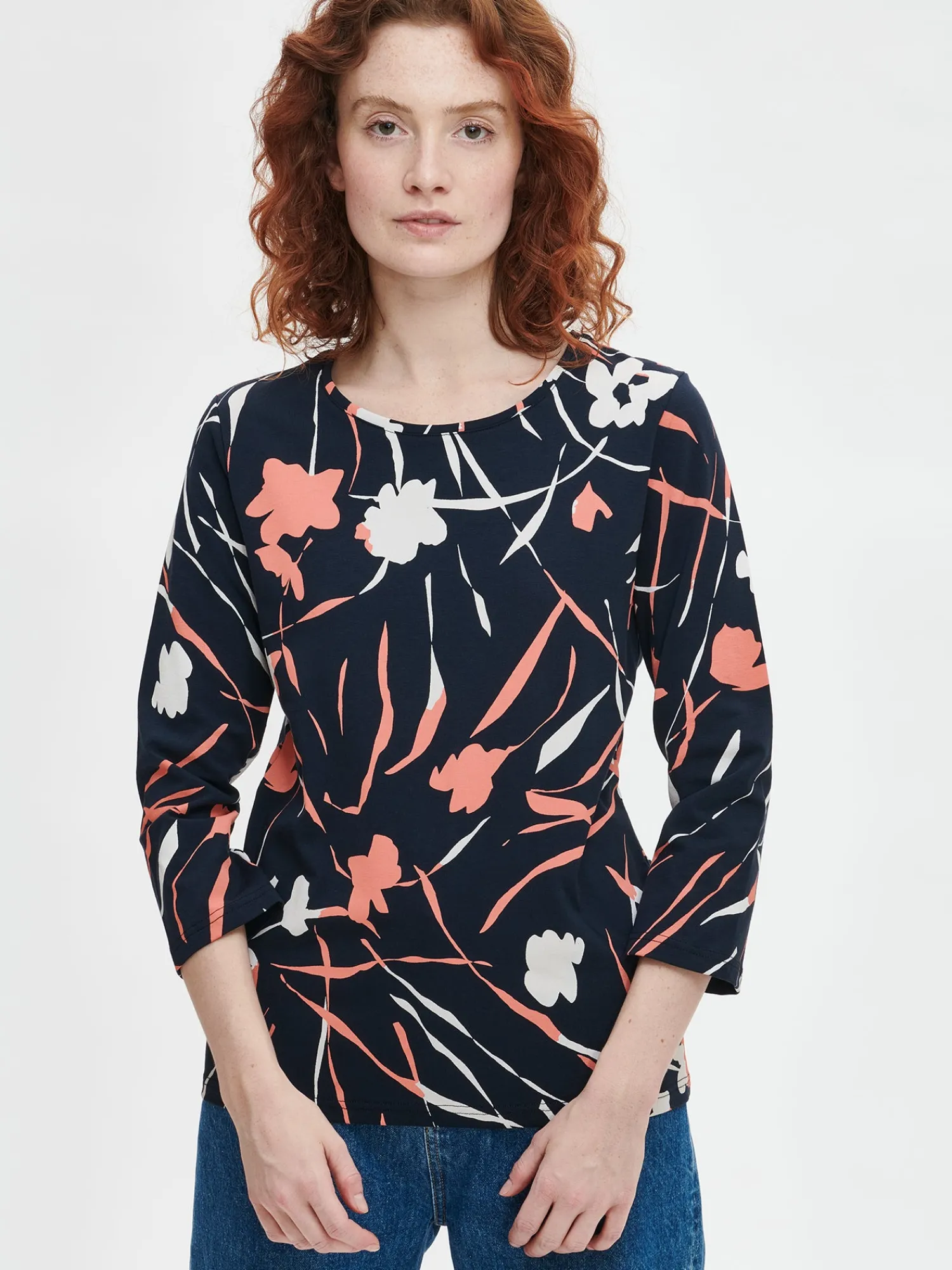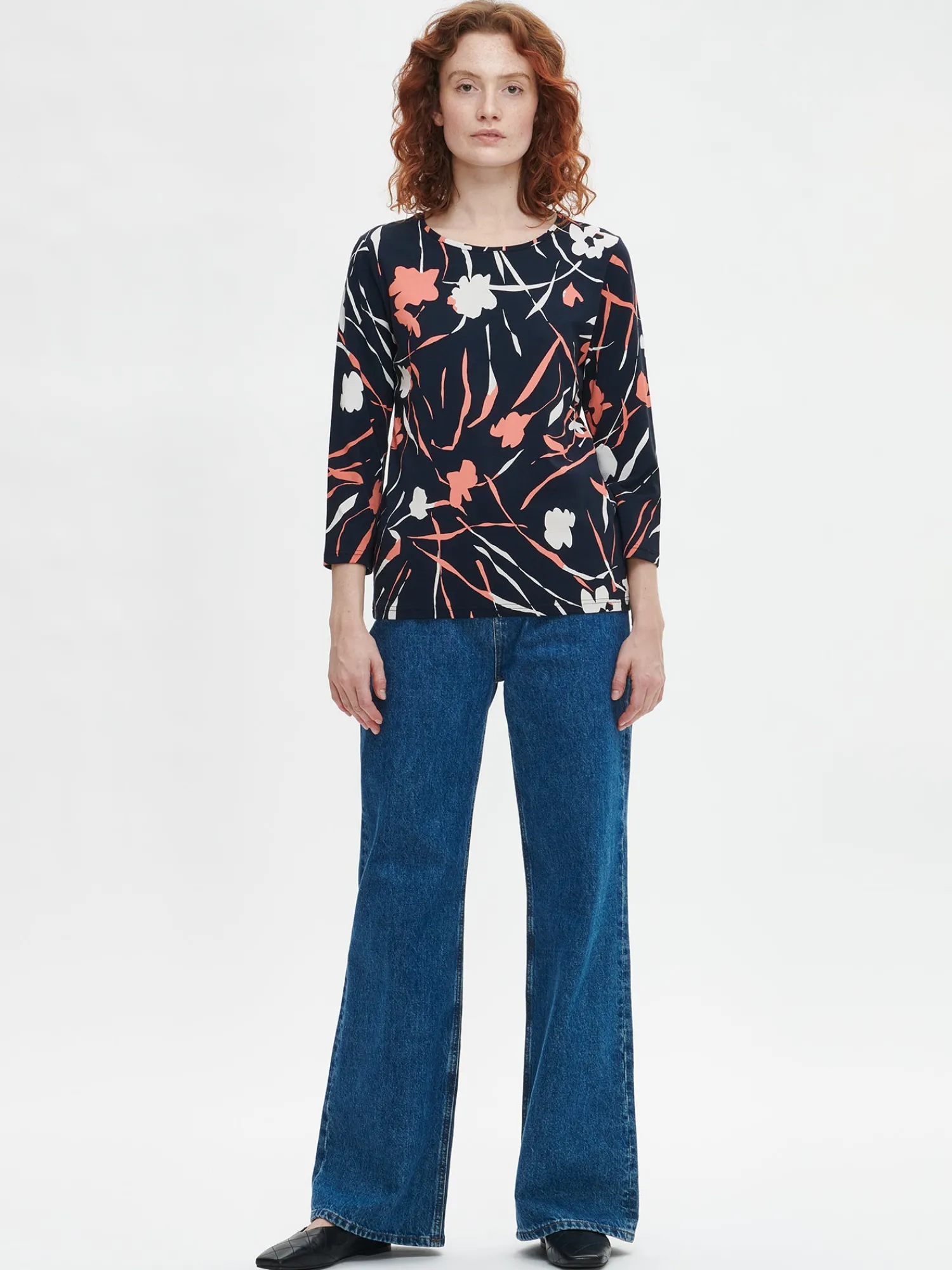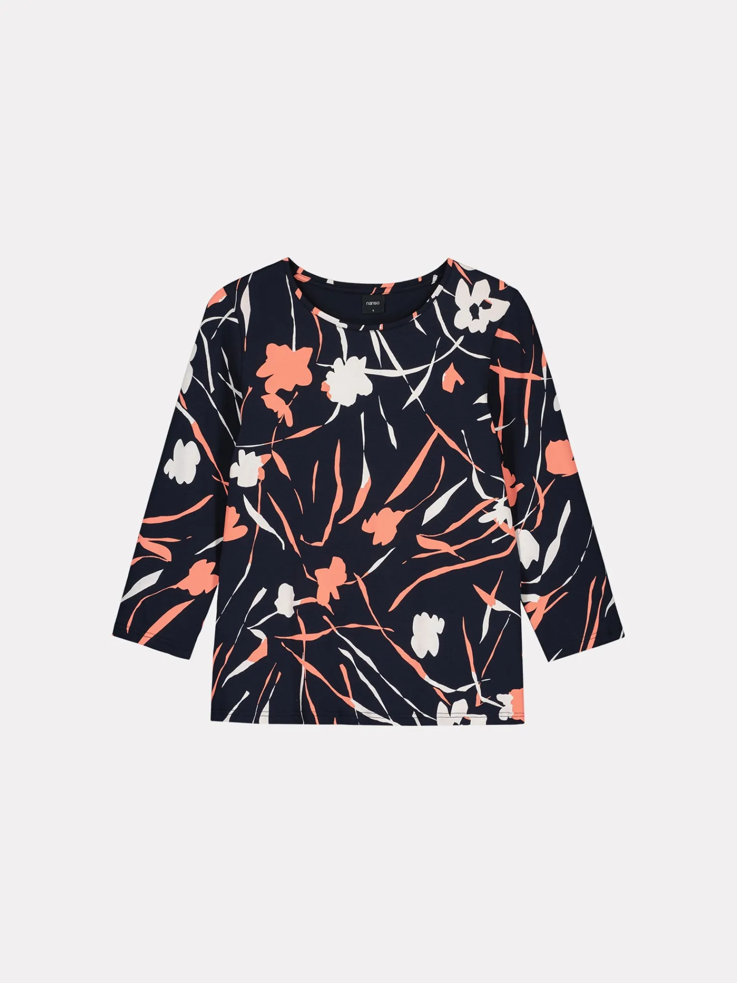 Naisten kuosillinen tummansininen Laukka-pusero. Istuvassa puserossa on tereellä viimeistelty pyöreä pääntie ja 3/4 pituiset hihat. Puseron pituus koossa M on noin 65 cm. Materiaali on miellyttävän tuntuista ja helppohoitoista puuvilla-elastaani-neulosta.