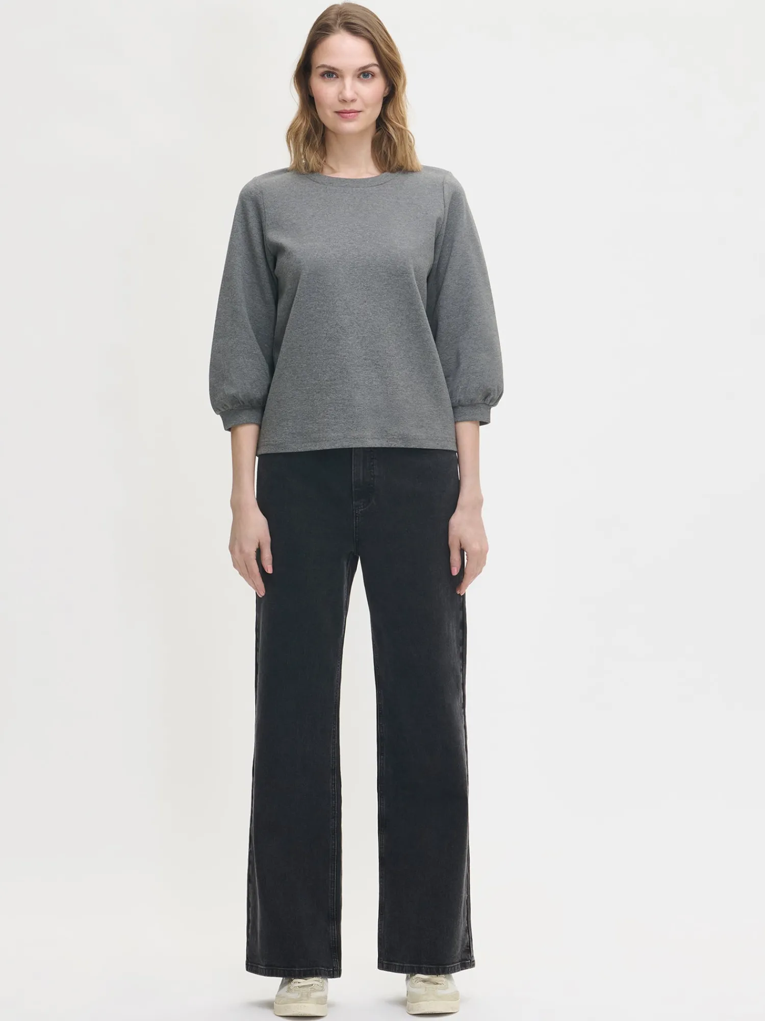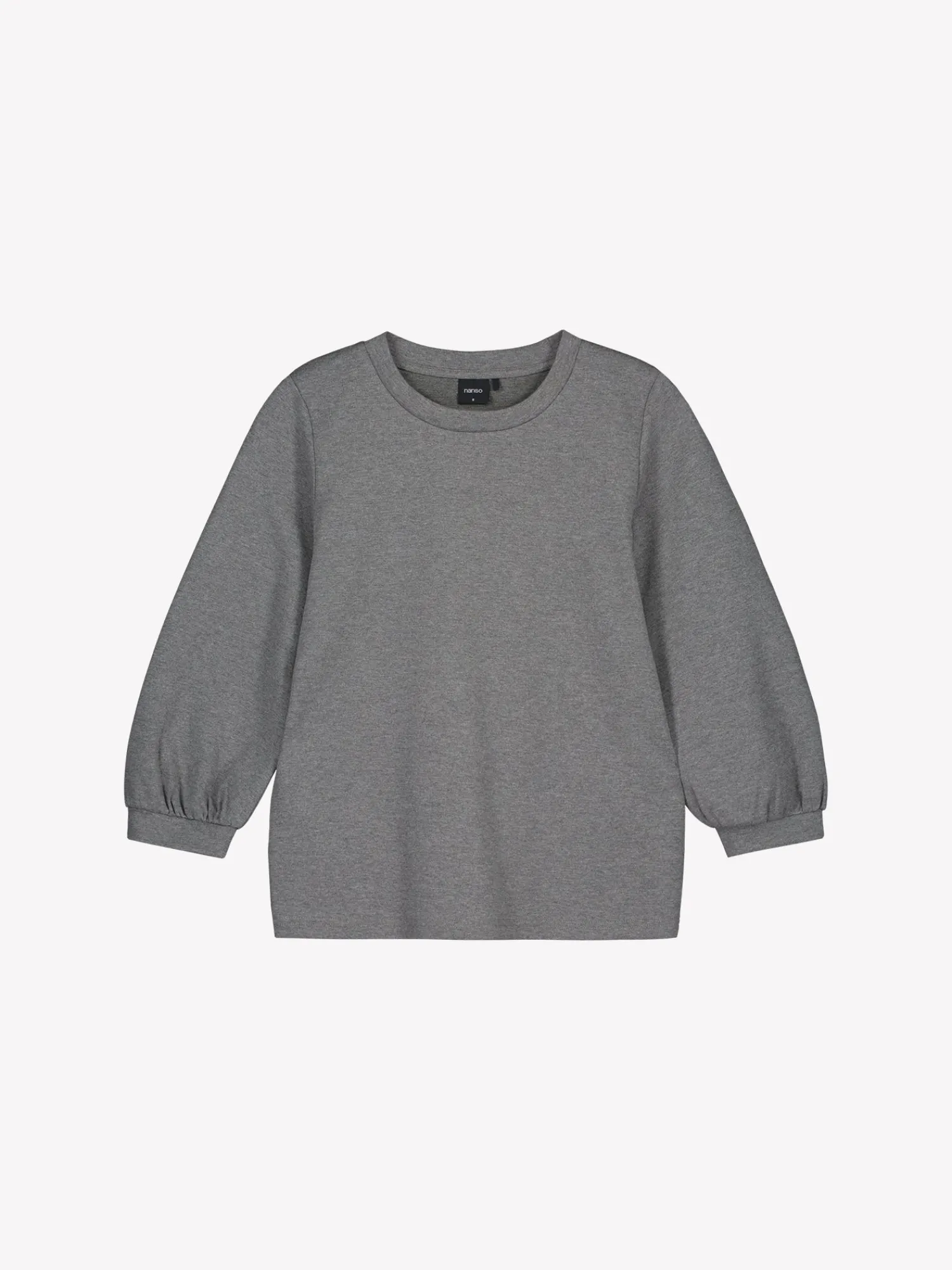 Naisten harmaa Leija-pusero. Puserossa on pyöreä pääntie ja suora helma. Hihansuissa on kaksinkertainen kaitale, jonka yläpuolelle poimuttuu 3/4 pituiset hihat. Puseron pituus koossa M on noin 62 cm. Materiaali on miellyttävän tuntuista, paksumpaa interlock-neulosta.