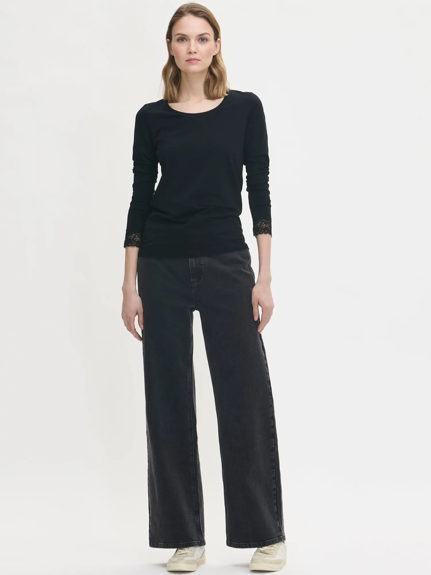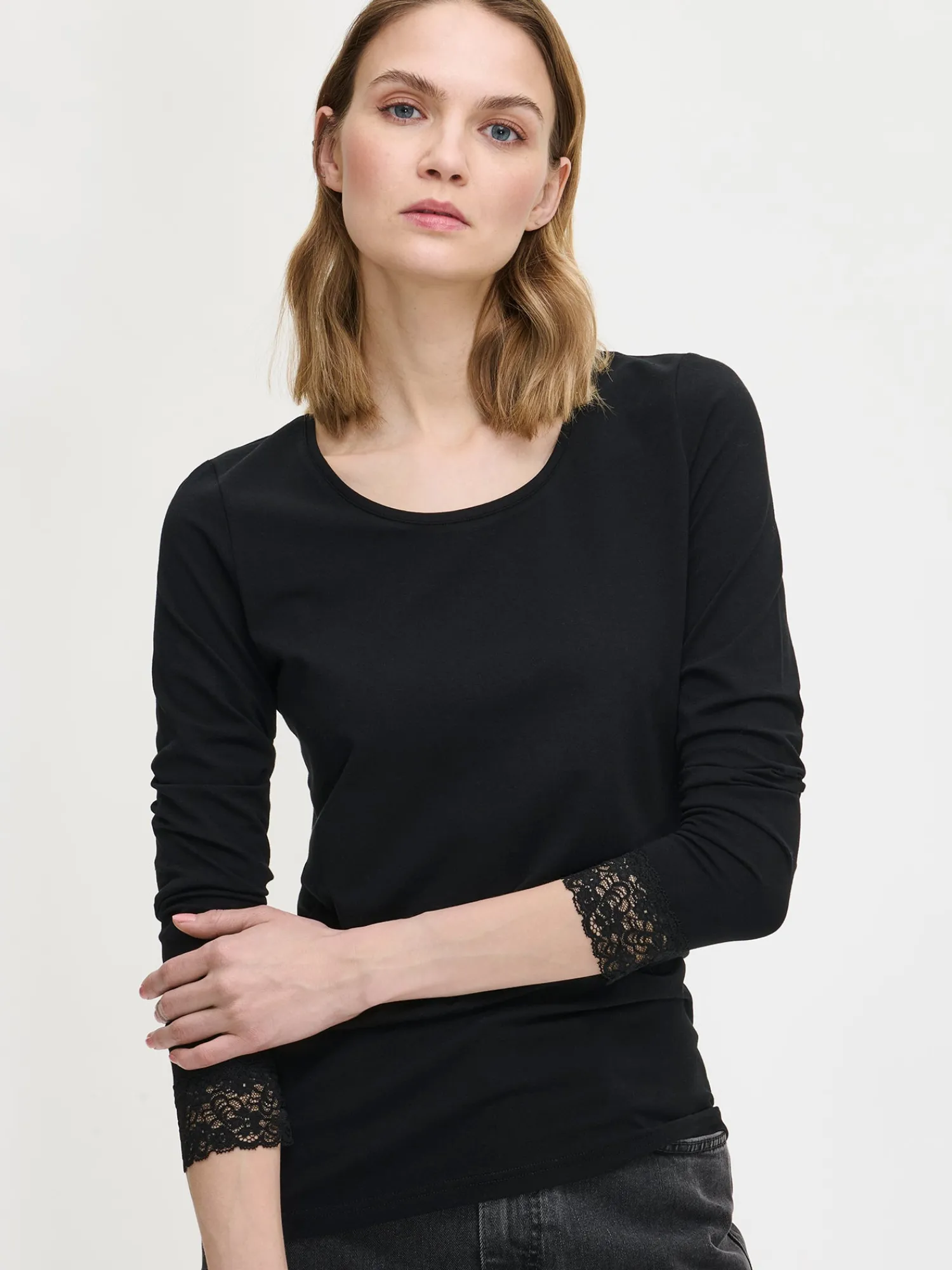 Naisten klassinen musta, pitkähihainen Lempi pusero pyöreällä pääntiellä. Hihat ovat täyspitkät ja hihansuussa on kauniit pitsikoristeet. Puseron pituus koossa M on noin 68 cm. Materiaali on miellyttävää ja joustavaa luomupuuvilla-elastaani-neulosta.