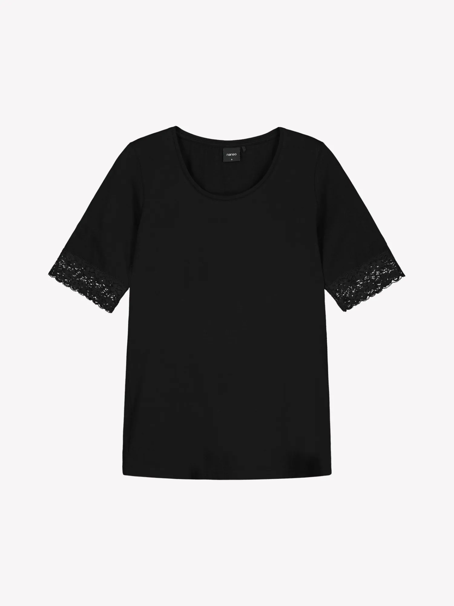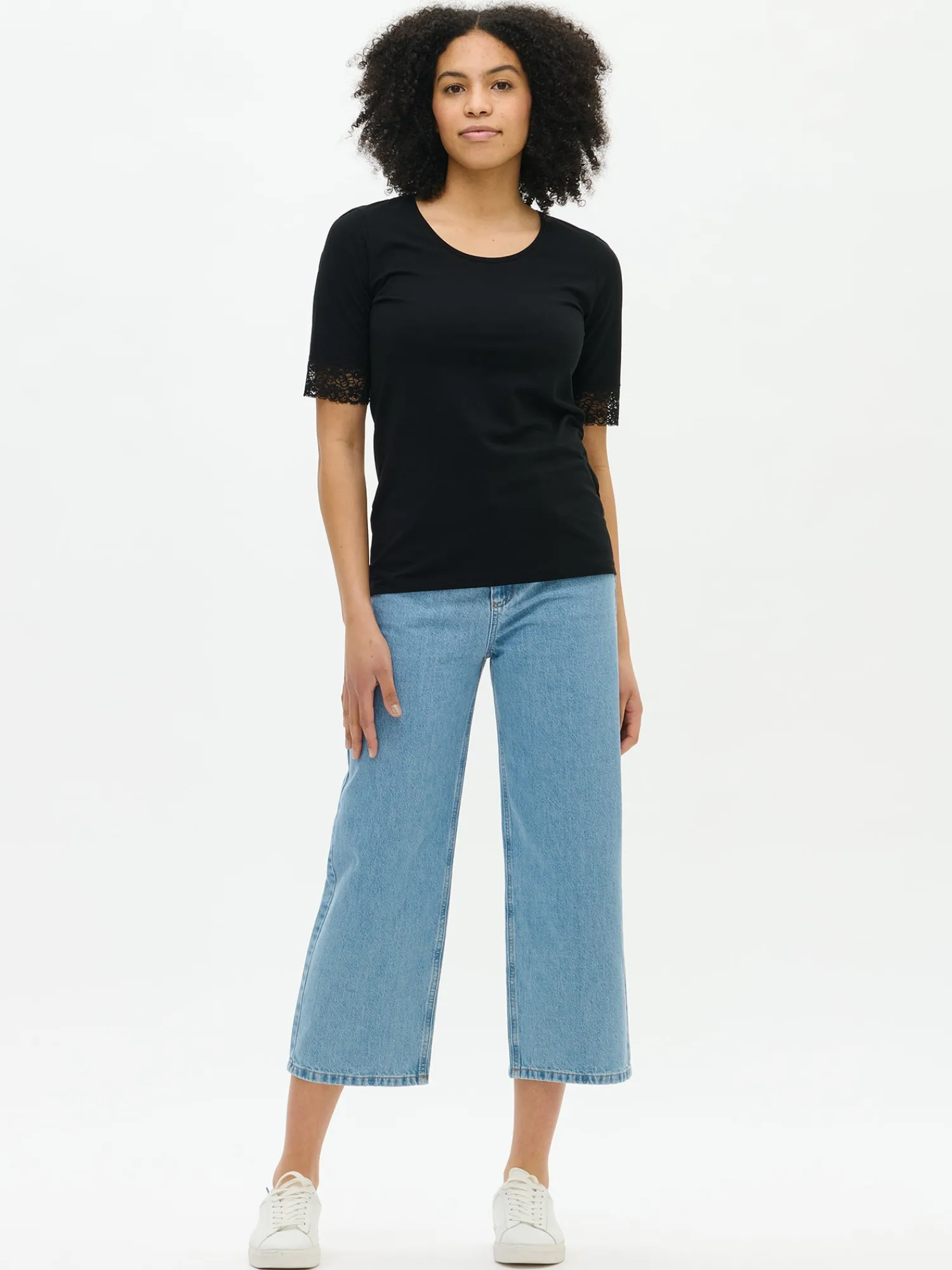 Naisten klassinen musta Lempi t-paita pyöreällä pääntiellä. Laadukas t-paita on varma valinta arjen pukeutumiseen. Lempi t-paidassa on kaunis pitsi hihan reunoissa. Hihat ovat puolipitkät. T-paidan pituus koossa M on noin 68 cm. Materiaali on miellyttävää ja joustavaa luomupuuvilla-elastaani-neulosta.