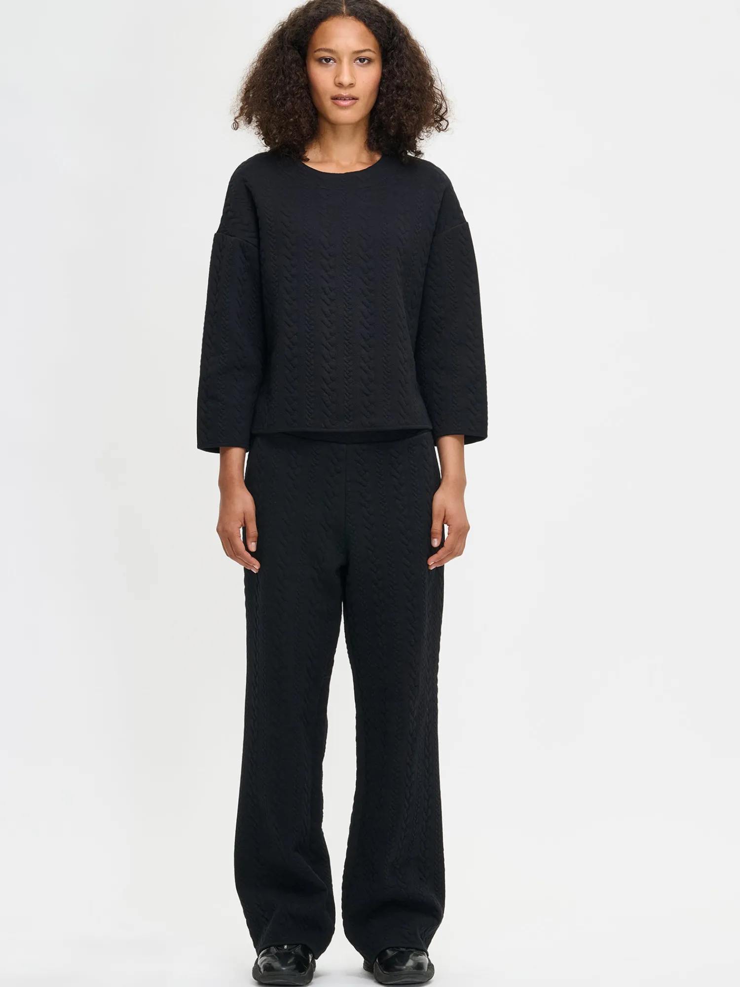Naisten mukava musta Letti-pusero. Puserossa on alavaralla viimeistelty pyöreä pääntie, pudotettu olkalinja ja pitkät hihat. Puseron helmassa pyöristetyt halkiot. Puseron pituus koossa M on noin 64 cm. Ryhdikäs palmikkomaisesti pintakuvioitu materiaali on miellyttävää puuvilla-elastaanineulosta. Materiaalille on ominaista 3-5% kutistuminen ensimmäisessä pesussa.