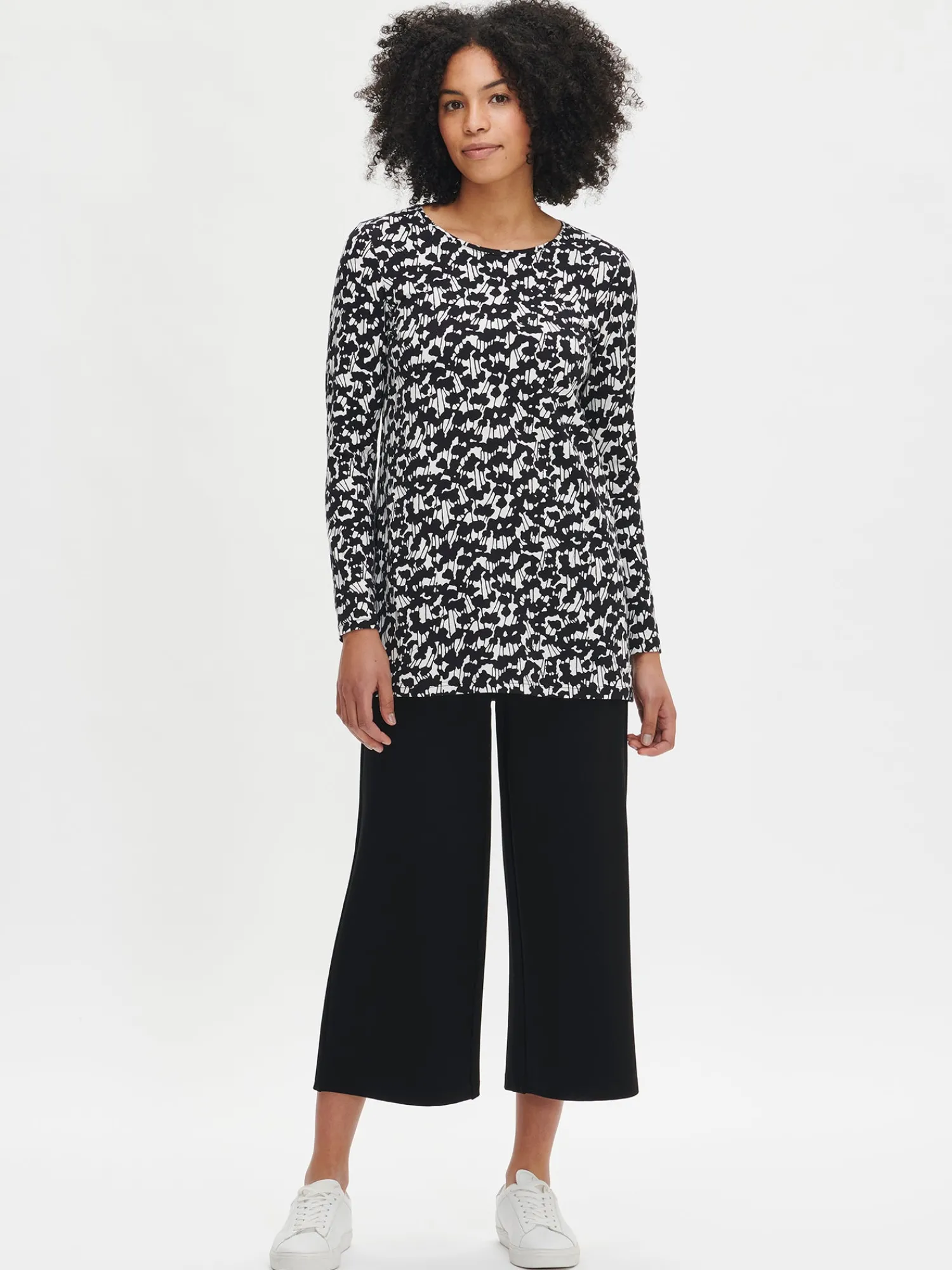 Naisten pitkähihainen mustavalkoinen Liito-tunika kauniilla kuosilla. Tunikassa on pyöreä tereellä viimeistelty pääntie, sivuissa taskut ja täyspitkät hihat. Tunikan pituus koossa M on noin 80 cm. Materiaali on miellyttävän tuntuista ja helppohoitoista puuvilla-elastaani-neulosta.