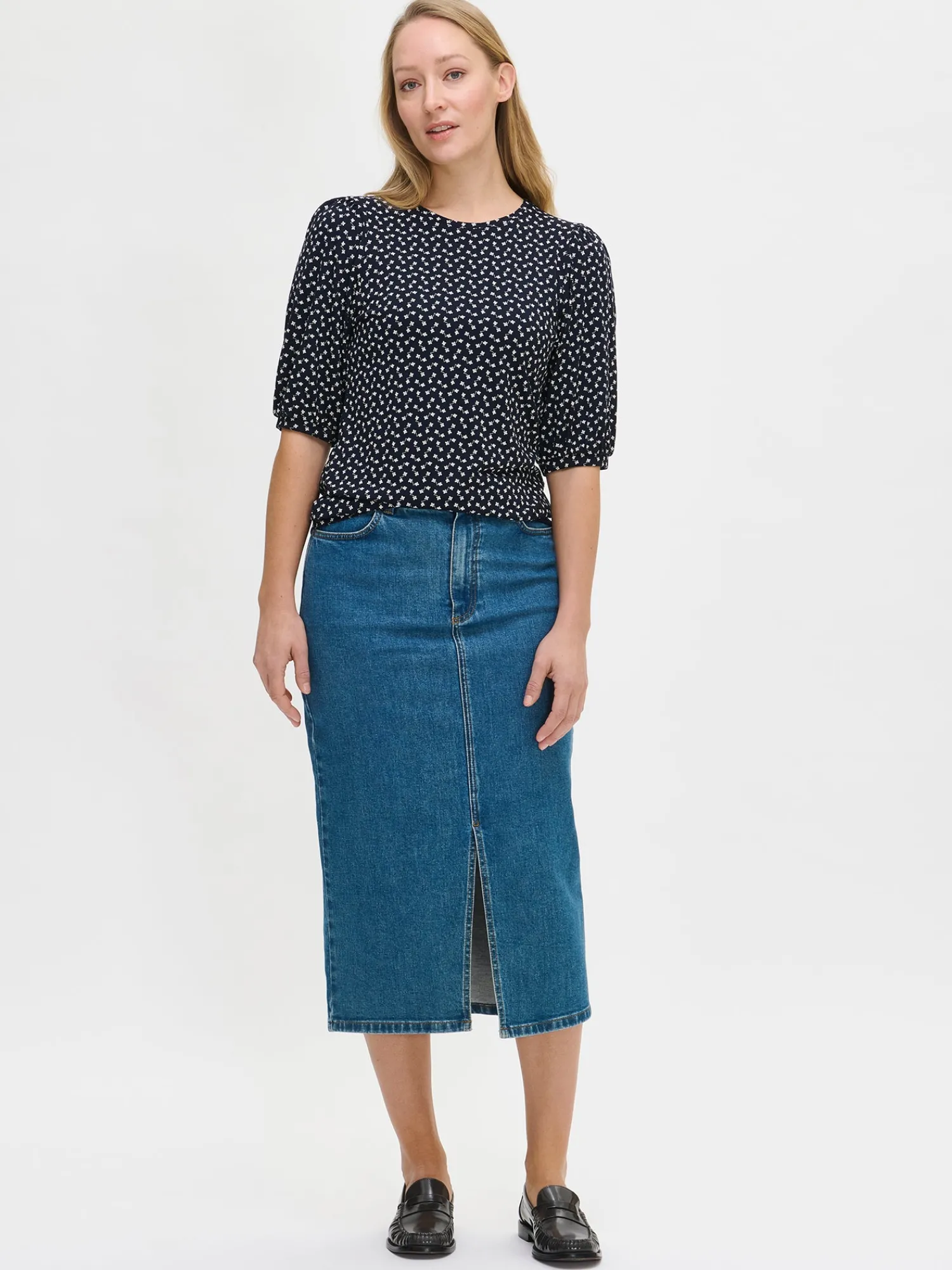Naisten kuosillinen tummansininen Liliana-pusero. Puserossa on tereellä viimeistelty pyöreä pääntie. 2/4 mittaiset hihat poimuttuvat olalta sekä hihansuun kaitaleen yläpuolelta. Puseron pituus koossa M on noin 65 cm. Kauniisti laskeutuvan puseron materiaali on laadukasta ja miellyttävän tuntuista viskoosi-elastaani-neulosta. Viskoosineulos on sähköistymätöntä ja helppohoitoista. Tuote on valmistettu LENZING™ ECOVERO™ -viskoosista. Materiaalille on ominaista 3-5 % kutistuminen ensimmäisessä pesussa.