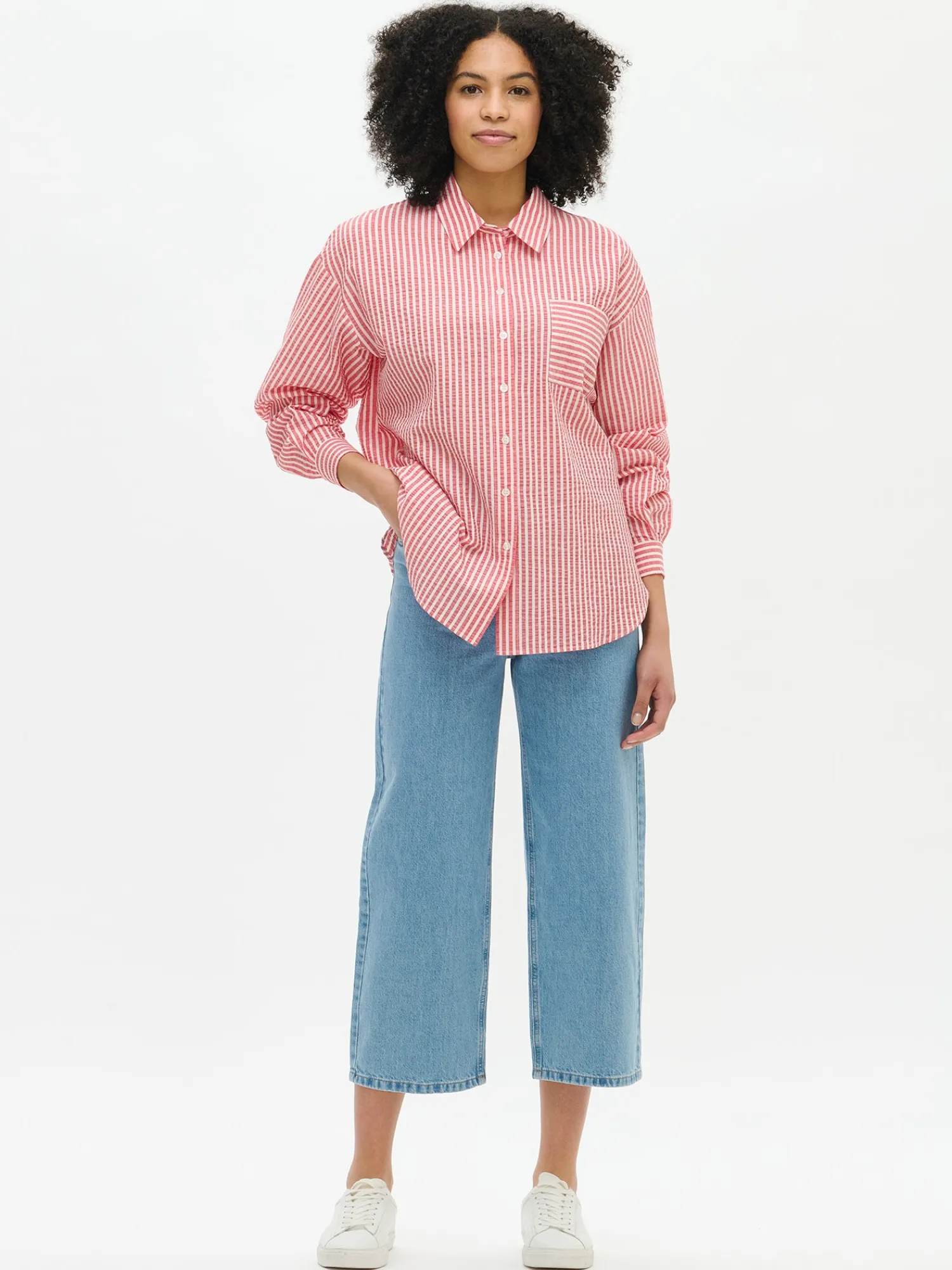 Naisten raidallinen punainen Marea-paitapusero. Marea-paitapuserossa klassinen kauluspaita yhdistyy ajattomaan ja raikkaaseen raitakuosiin. Paitapuserossa on kaulus, pudotettu olkalinja, rintatasku ja napit edessä. Hihat ovat täyspitkät. Puseron pituus koossa 38 on noin 75 cm. Materiaali on kevyttä kudottua puuvilla-viskoosi-elastaanikangasta, jossa on kaunis pintastruktuuri.
