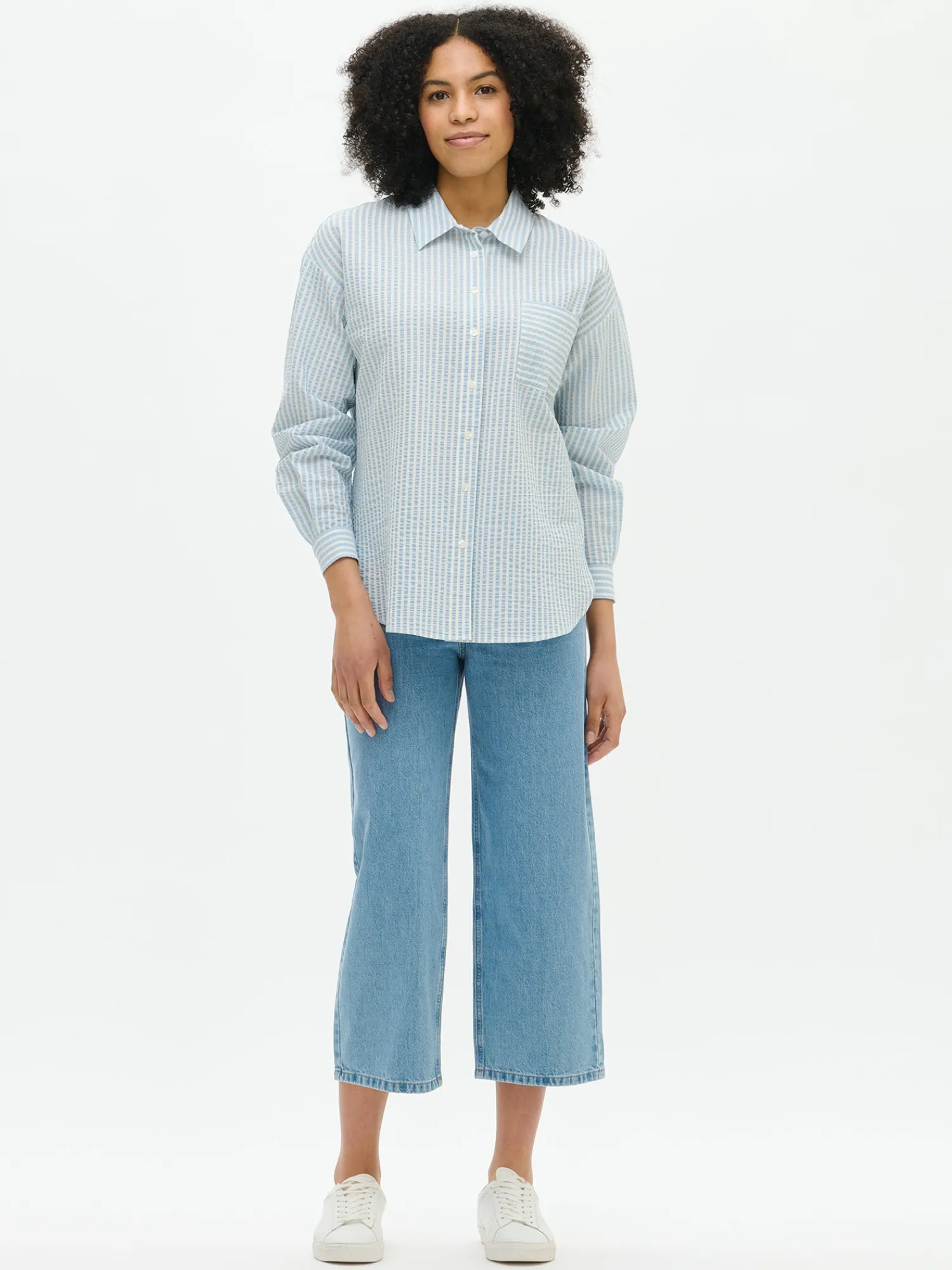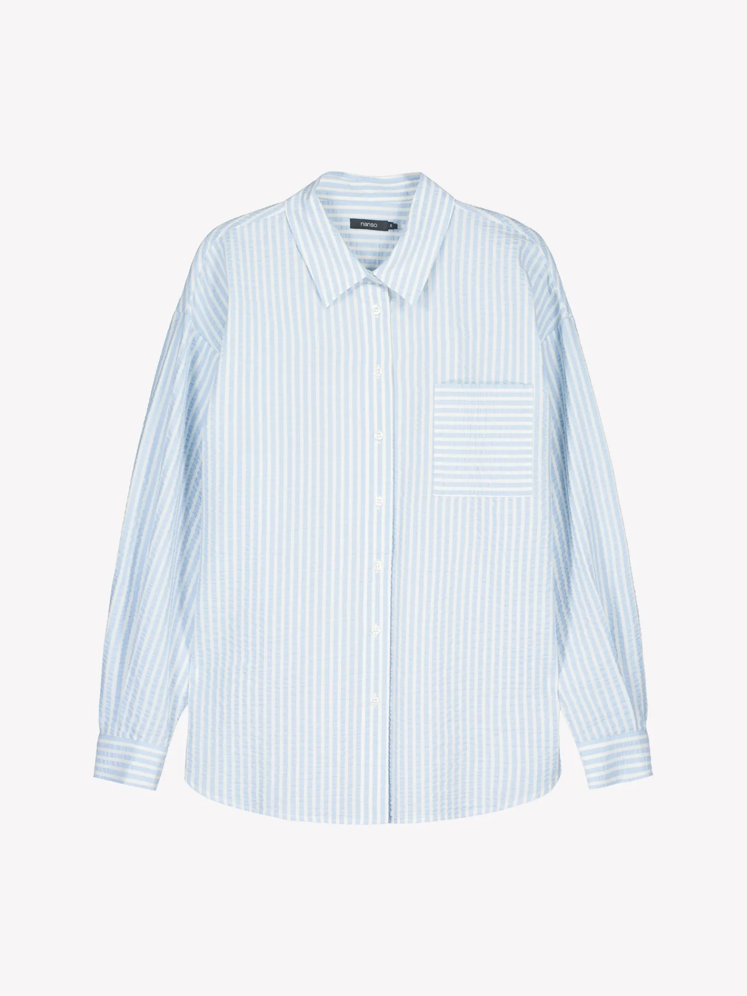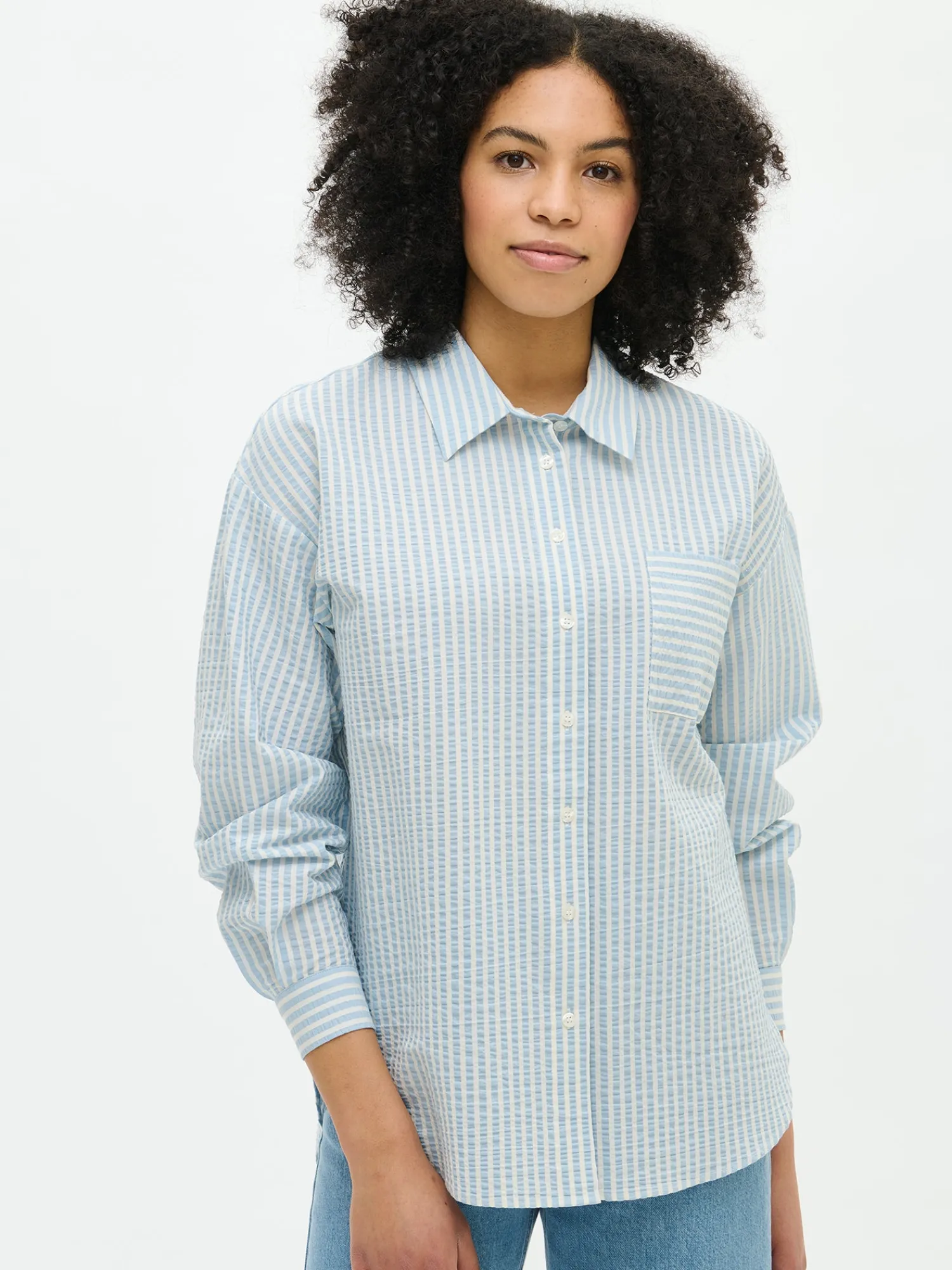 Naisten raidallinen vaaleansininen Marea-paitapusero. Marea-paitapuserossa klassinen kauluspaita yhdistyy ajattomaan ja raikkaaseen raitakuosiin. Paitapuserossa on kaulus, pudotettu olkalinja, rintatasku ja napit edessä. Hihat ovat täyspitkät. Puseron pituus koossa 38 on noin 75 cm. Materiaali on kevyttä kudottua puuvilla-viskoosi-elastaanikangasta, jossa on kaunis pintastruktuuri.