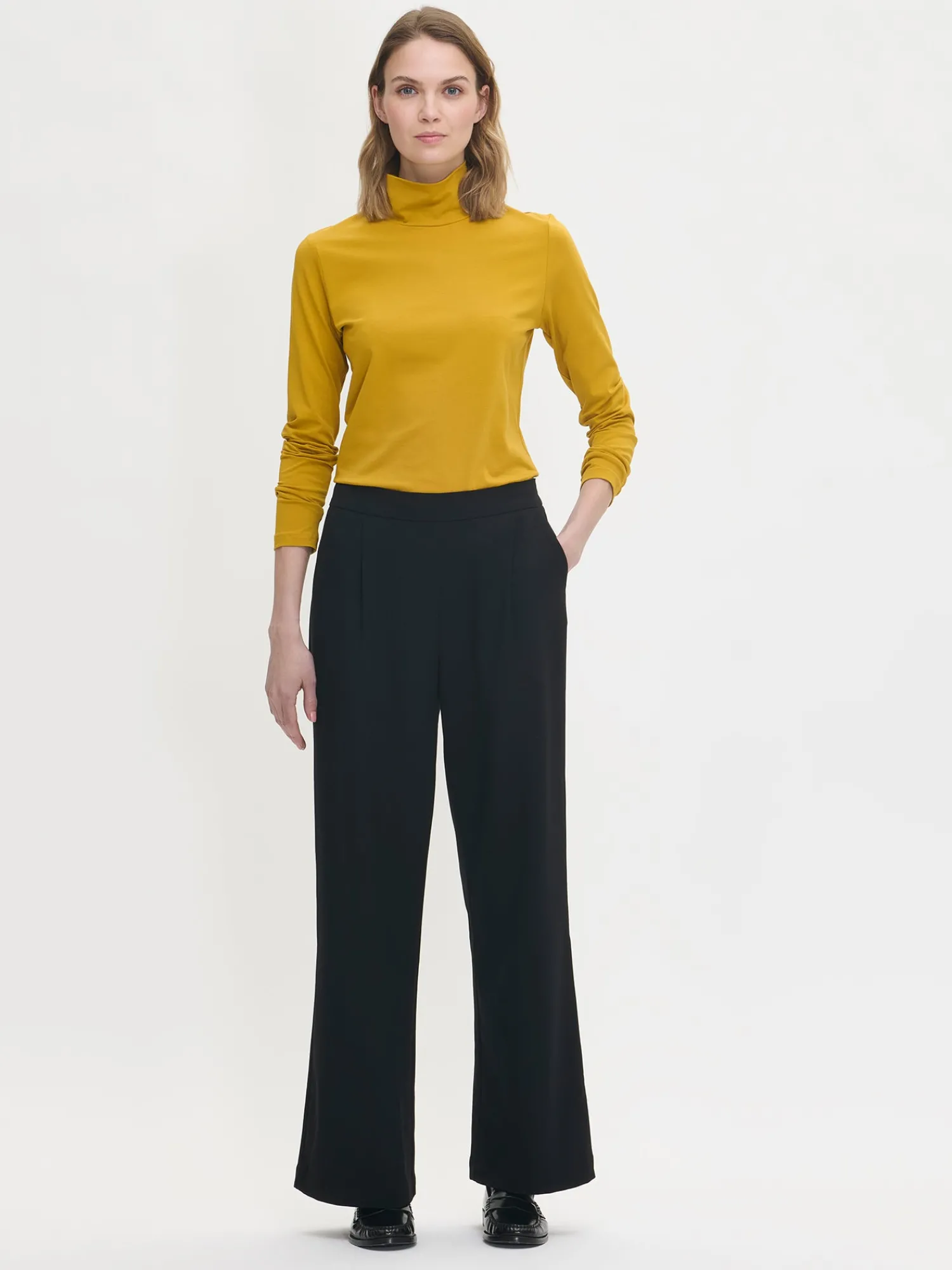 Naisten keltainen Mari-poolopusero. Istuva poolo on ajaton klassikko, johon haluaa pukeutua vuodesta toiseen. Monikäyttöisen poolon voi pukea myös lyhythihaisen mekon tai paidan alle. Istuvassa matalakauluksellisessa poolopuserossa on täyspitkät hihat. Puseron pituus koossa M on noin 65 cm. Poolon materiaali on miellyttävää ja joustavaa luomupuuvilla-elastaani-neulosta.
