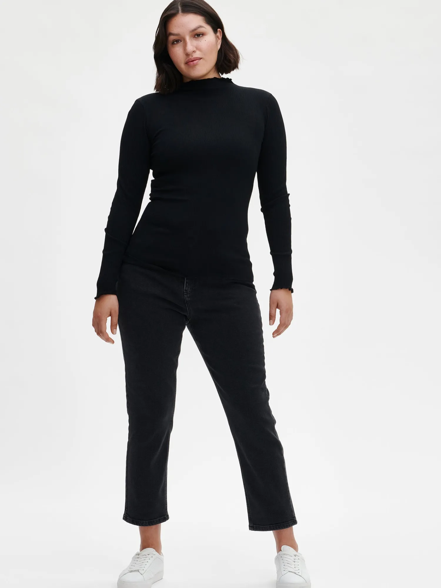 Naisten istuva, musta struktuuripintainen Mette-pusero. Ajattoman puseron voi helposti yhdistää erilaisten housujen, hameiden tai mekkojen pariksi. Tyylikkäässä puserossa on matala pystykaulus ja täyspitkät hihat. Puseron pääntien ja hihansuiden reunat on huoliteltu rullapäärmeellä, joka luo paidan reunoihin kauniin aaltoilevan efektin. Puseron pituus koossa M on noin 65 cm. Materiaali on miellyttävää ja joustavaa puuvilla-polyesteri-elastaani-neulosta.