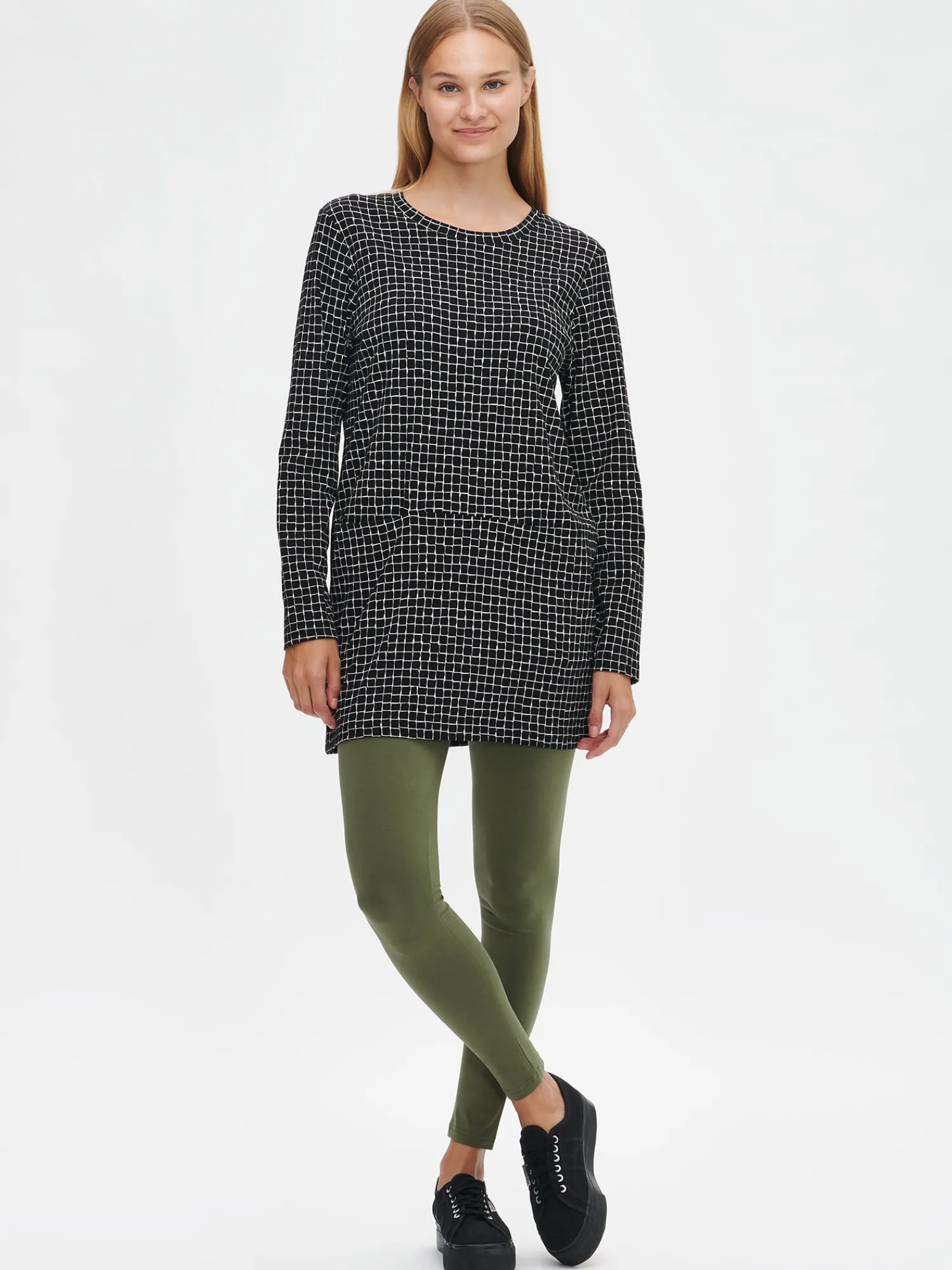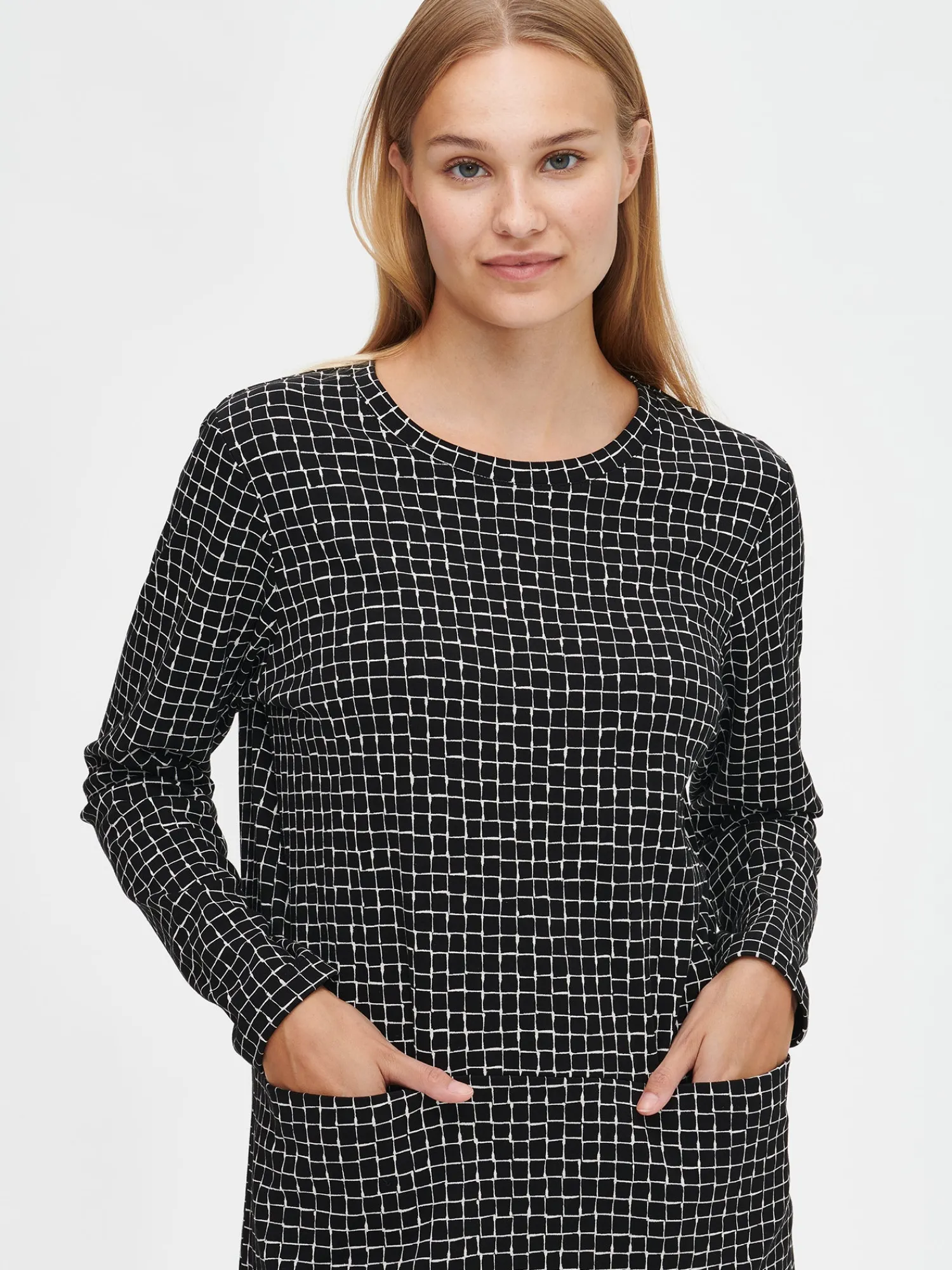 Naisten kuosillinen musta Mosaiikki-tunika. Tunikassa on leveällä tereellä viimeistelty pyöreä pääntie ja täyspitkät hihat. Tunikassa on edessä leikkaussaumassa upotettuna taskut. Tunikan pituus koossa M on noin 80 cm. Materiaali on 100 % puuvillaa, jämäkämpää interlock-neulosta.