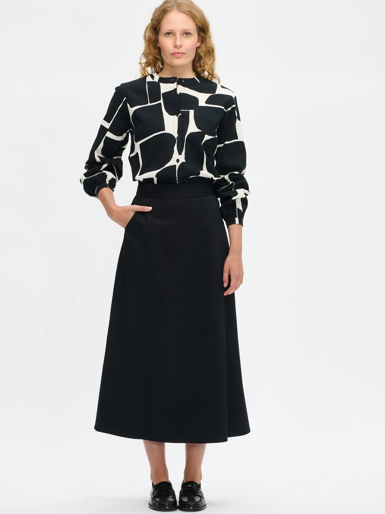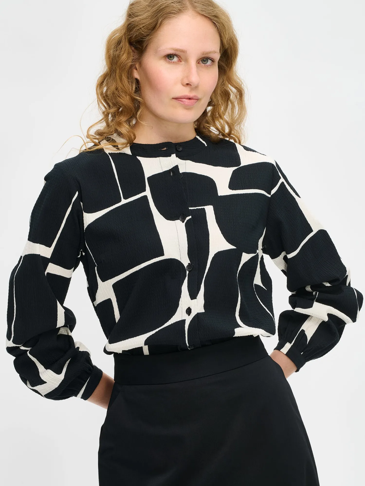Naisten kuosillinen Muuri-paitapusero. Suoralinjaisessa paitapuserossa on kaulus, edessä napitus ja rintamuotolaskokset. Puserossa on täyspitkät hihat, jotka poimuttuvat kauniisti hihansuun kaitaleen yläpuolella. Hihansuissa on nappihalkiot ja helma on suora. Puseron pituus koossa 38 on noin 70 cm. Tuote on valmistettu laadukkaasta ja ryhdikkäästä kudotusta puuvillakangasta, jossa on hieman elastaania antamassa joustoa.