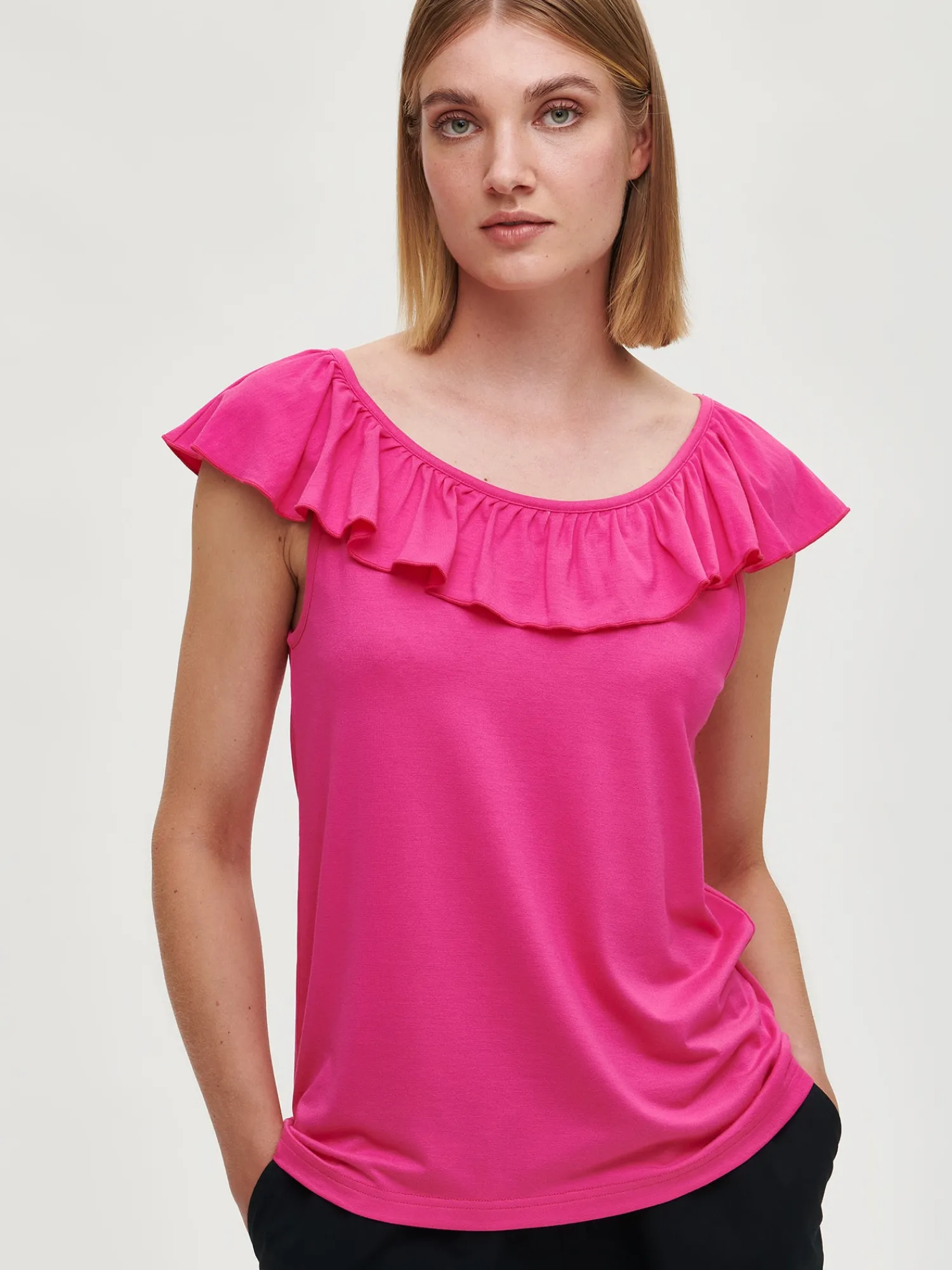 Naisten tyylikäs pinkki Nata-toppi. Hihattoman topin kädentiet on huoliteltu kapealla kantilla. Avaraa pääntietä reunustaa kauniisti laskeutuva frilla. Topin pituus koossa M on noin 62 cm. Materiaali on laadukasta ja miellyttävän tuntuista, ohutta viskoosi-elastaani-neulosta. Viskoosineulos on sähköistymätöntä ja helppohoitoista. Tuote on valmistettu vastuullisemmasta LENZING™ ECOVERO™ -viskoosista. Materiaalille on ominaista 3-5% kutistuminen ensimmäisessä pesussa.