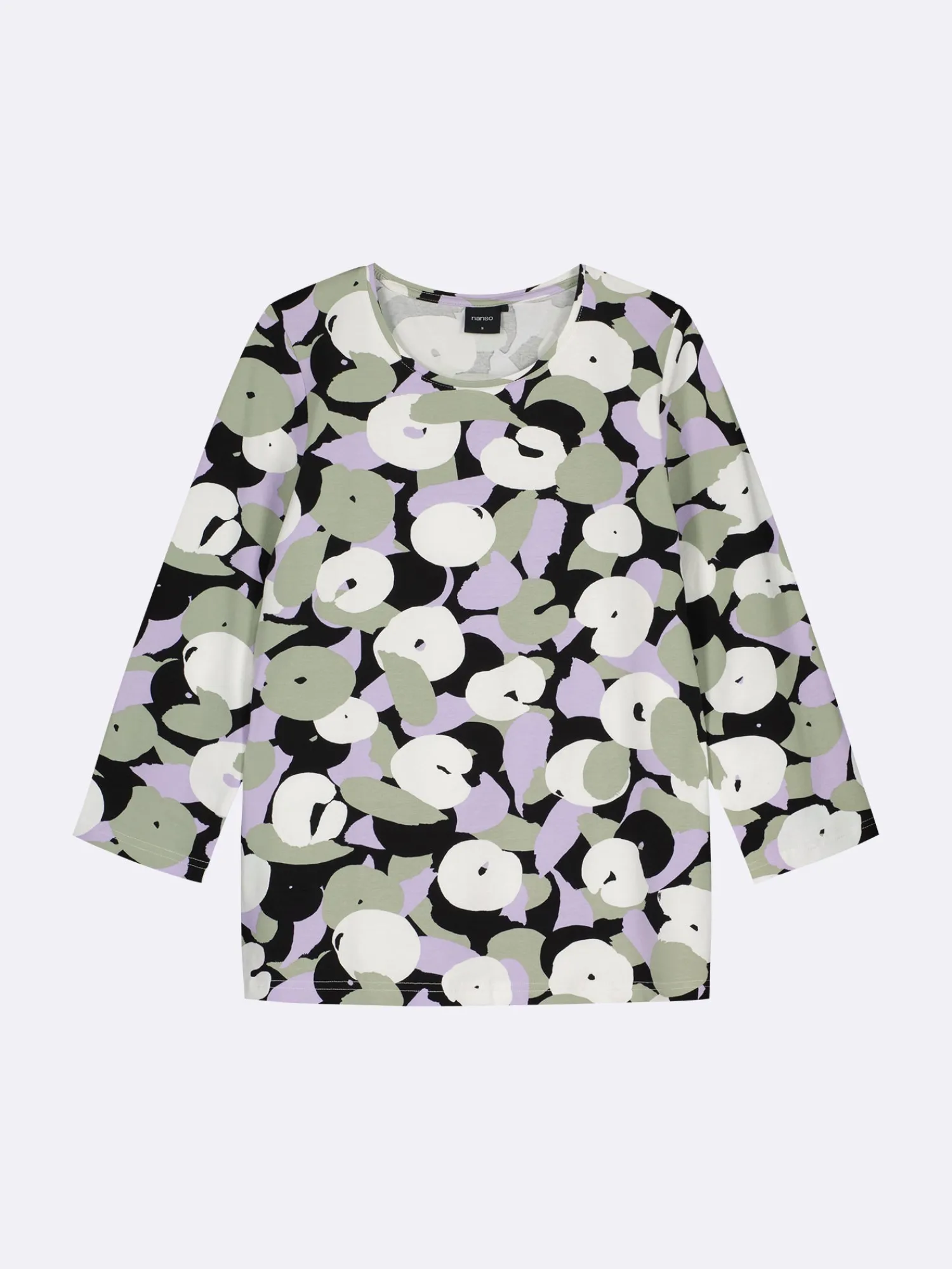Naisten kuosillinen oliivinvihreä Perenna-pusero. Istuvassa puserossa on tereellä viimeistelty pyöreä pääntie ja 3/4 pituiset hihat. Puseron pituus koossa M on noin 65 cm. Materiaali on miellyttävän tuntuista ja helppohoitoista puuvilla-elastaani-neulosta.