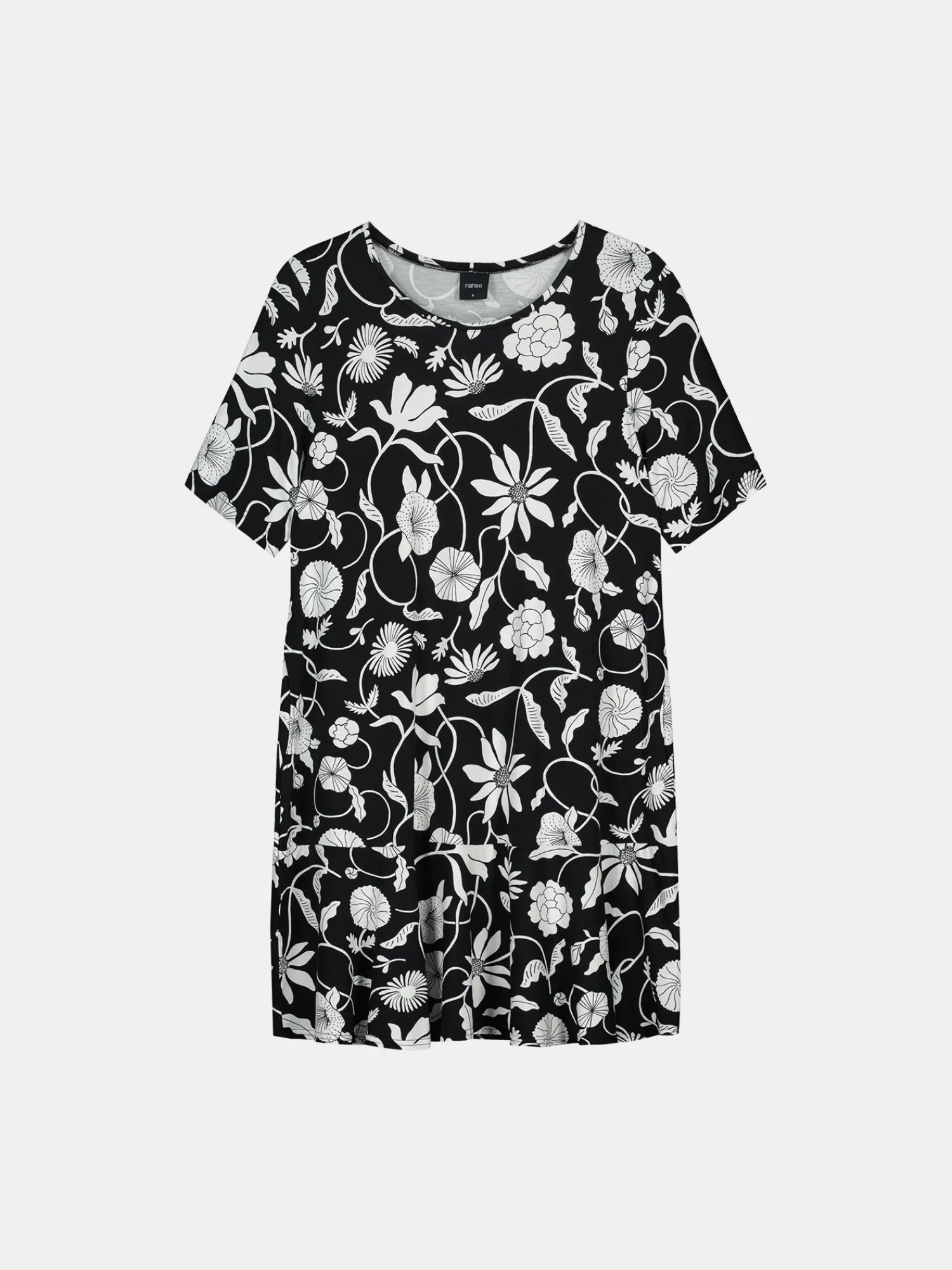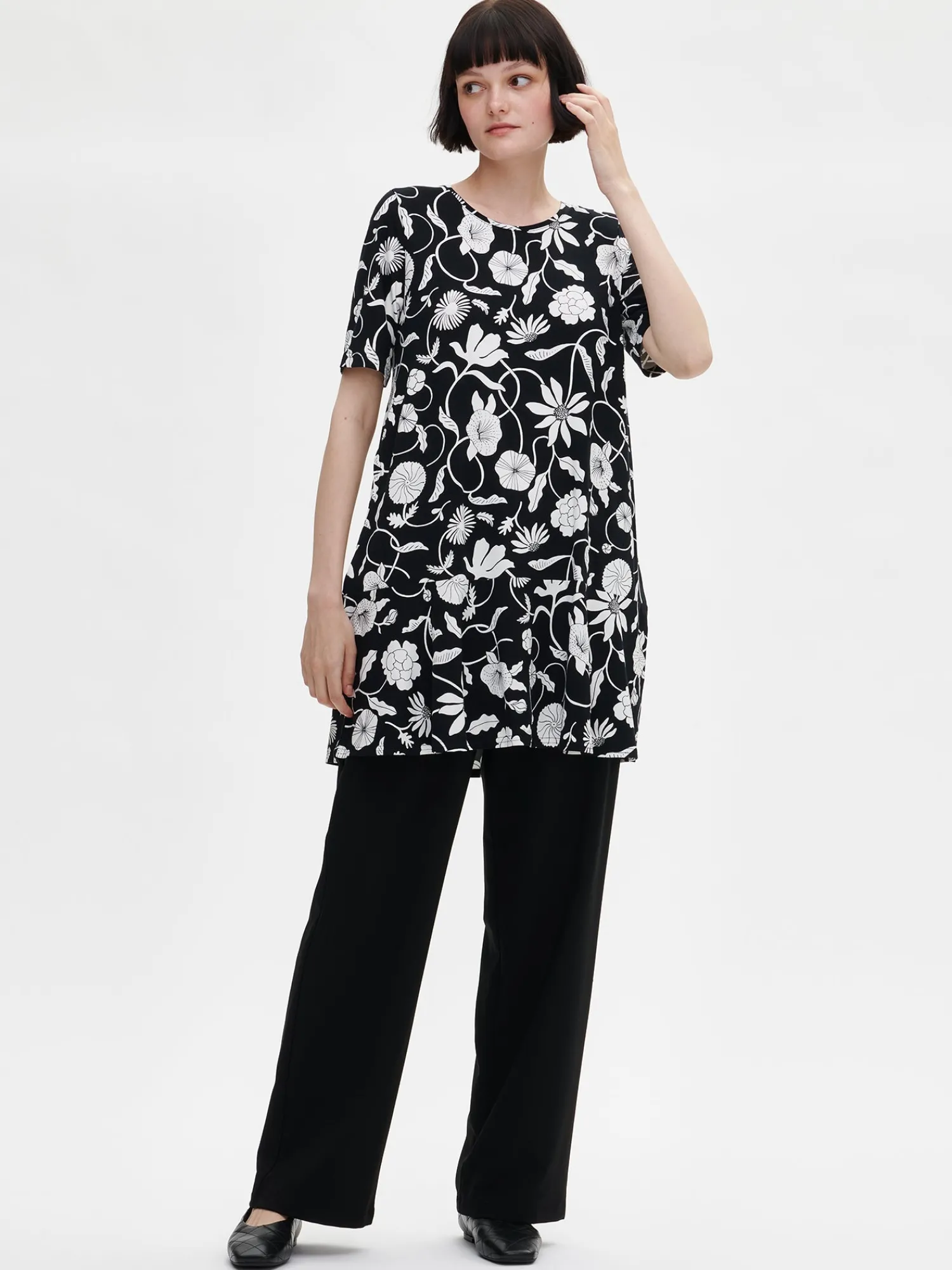 Naisten kuosillinen mustavalkoinen Pieni Linokukka-tunika. Tunikassa on tereellä viimeistelty pyöreä pääntie ja 2/4 pituiset hihat. Tunikan sivuissa on taskut ja helma on kellotettu. Tunikan pituus koossa M on noin 85 cm. Kauniisti laskeutuvan tunikan materiaali on laadukasta ja miellyttävän tuntuista viskoosi-elastaani-neulosta. Viskoosineulos on sähköistymätöntä ja helppohoitoista. Tuote on valmistettu vastuullisemmasta LENZING™ ECOVERO™ -viskoosista. Materiaalille on ominaista 3-5% kutistuminen ensimmäisessä pesussa.