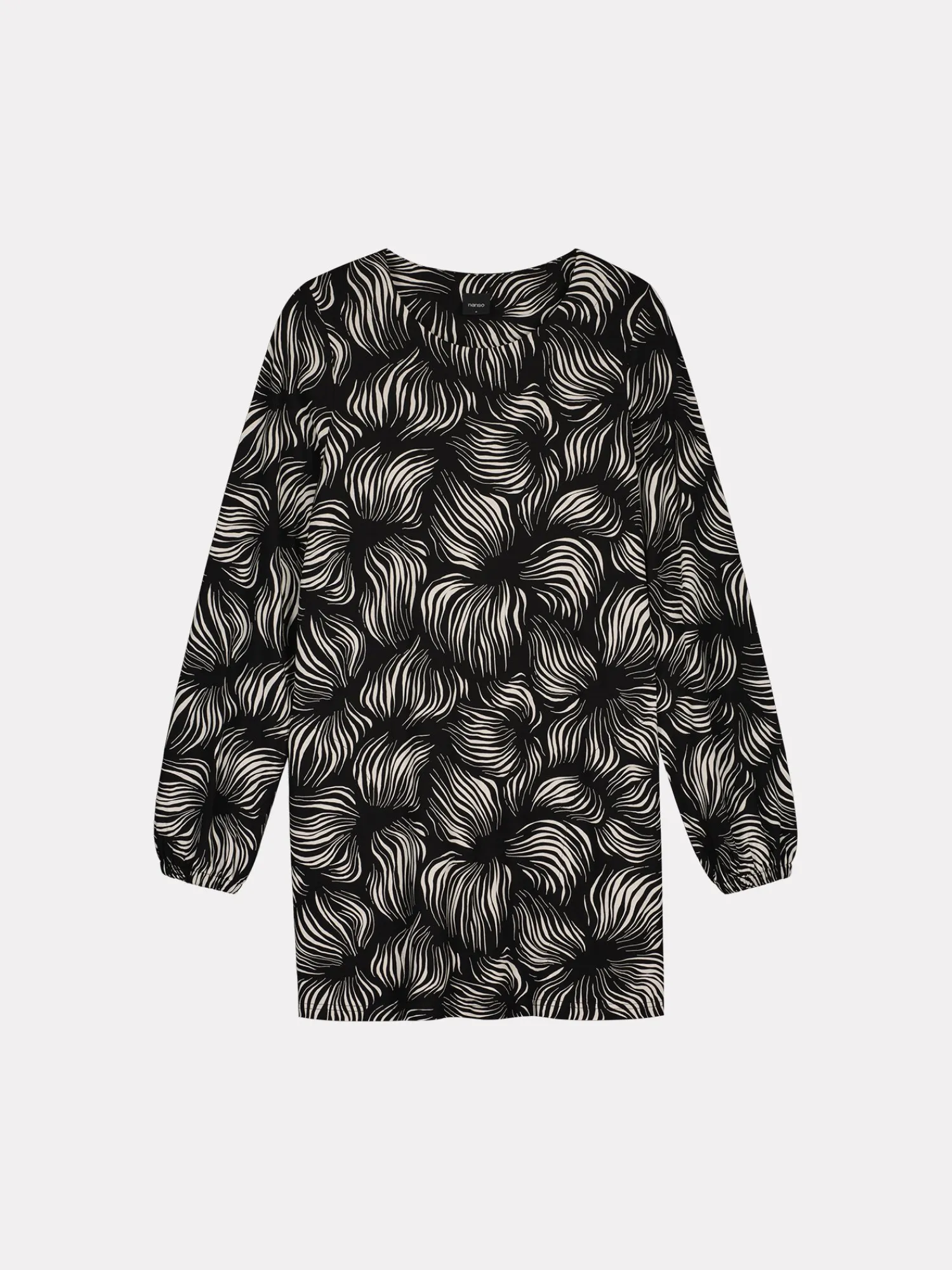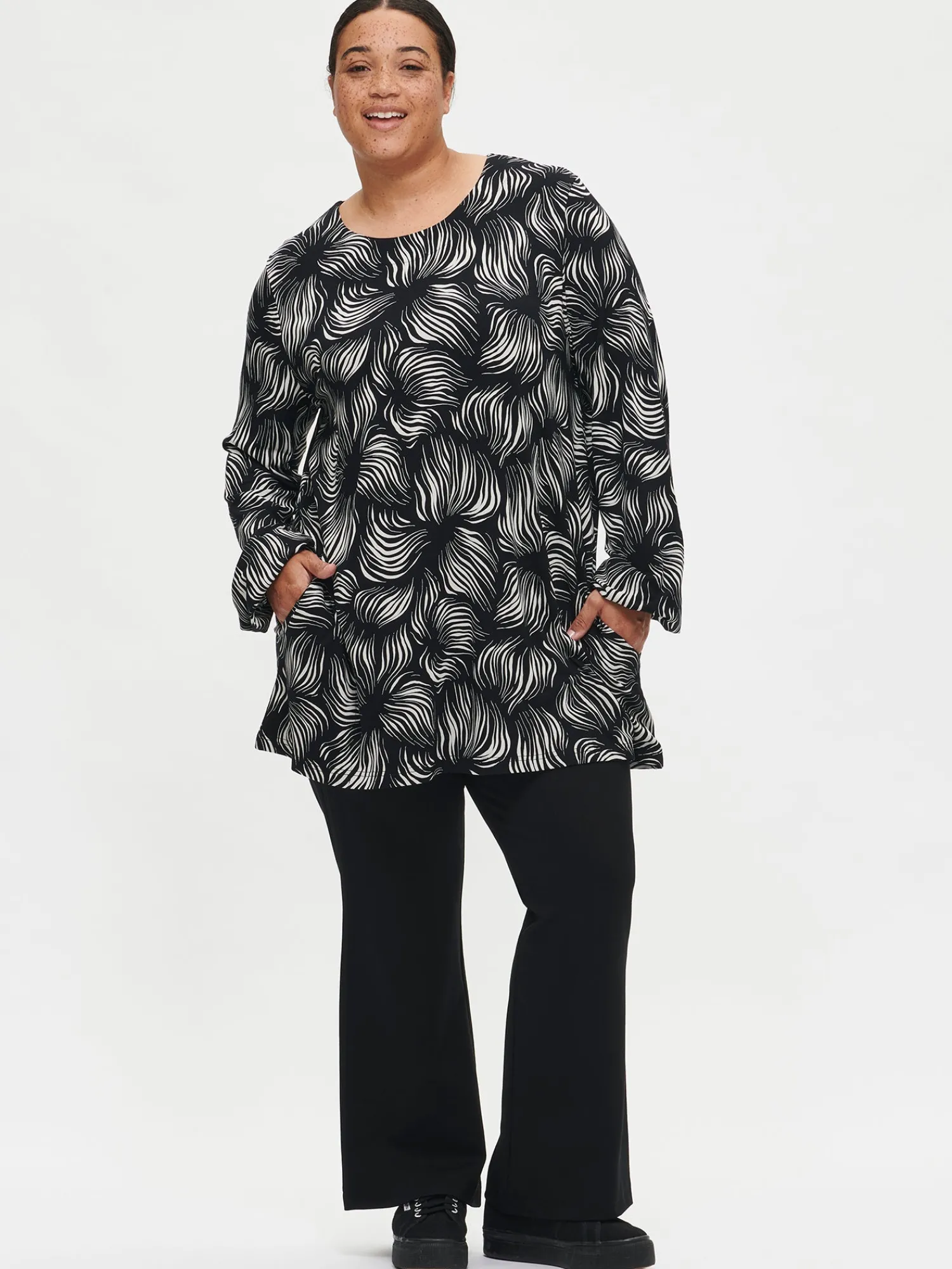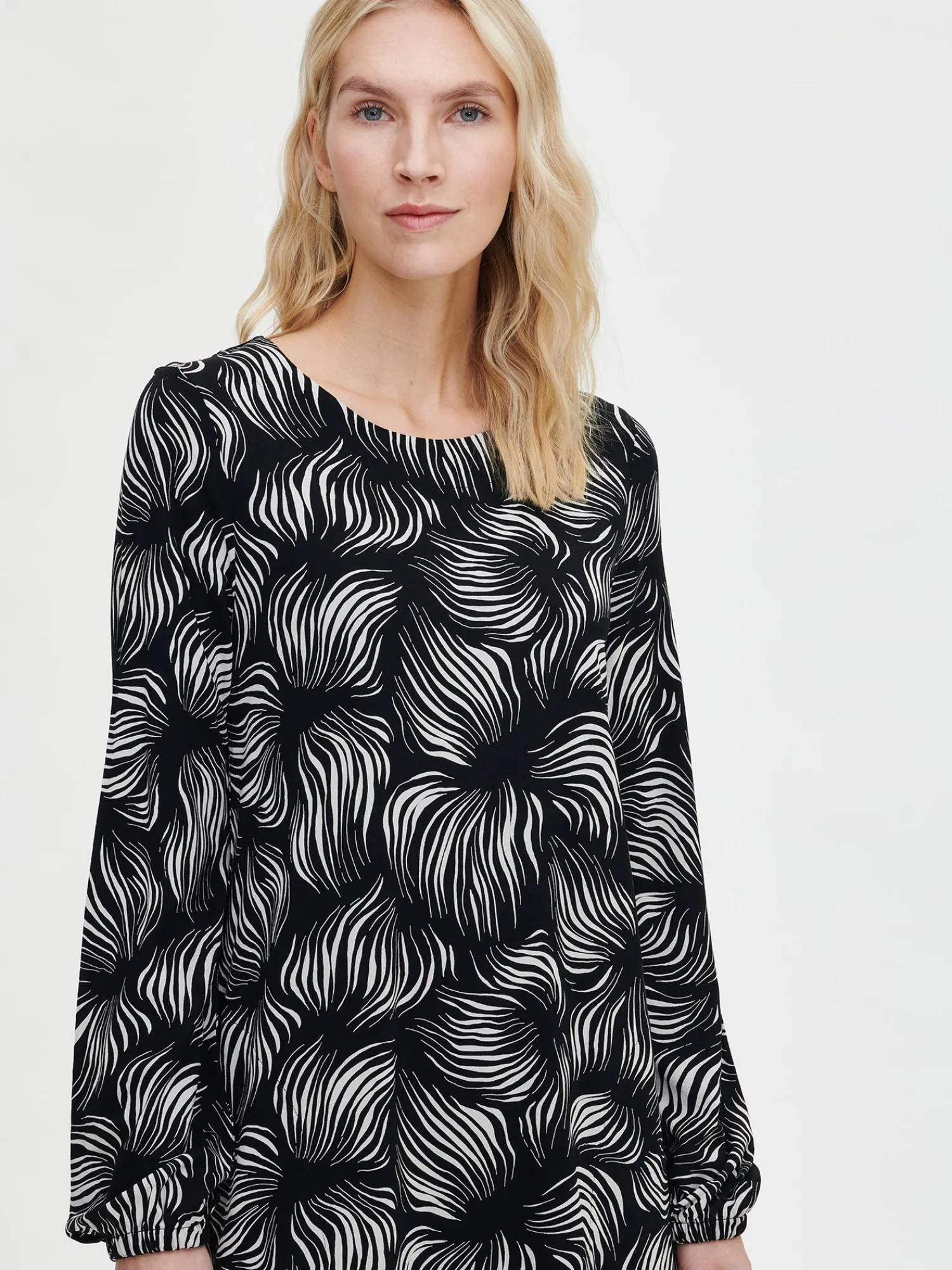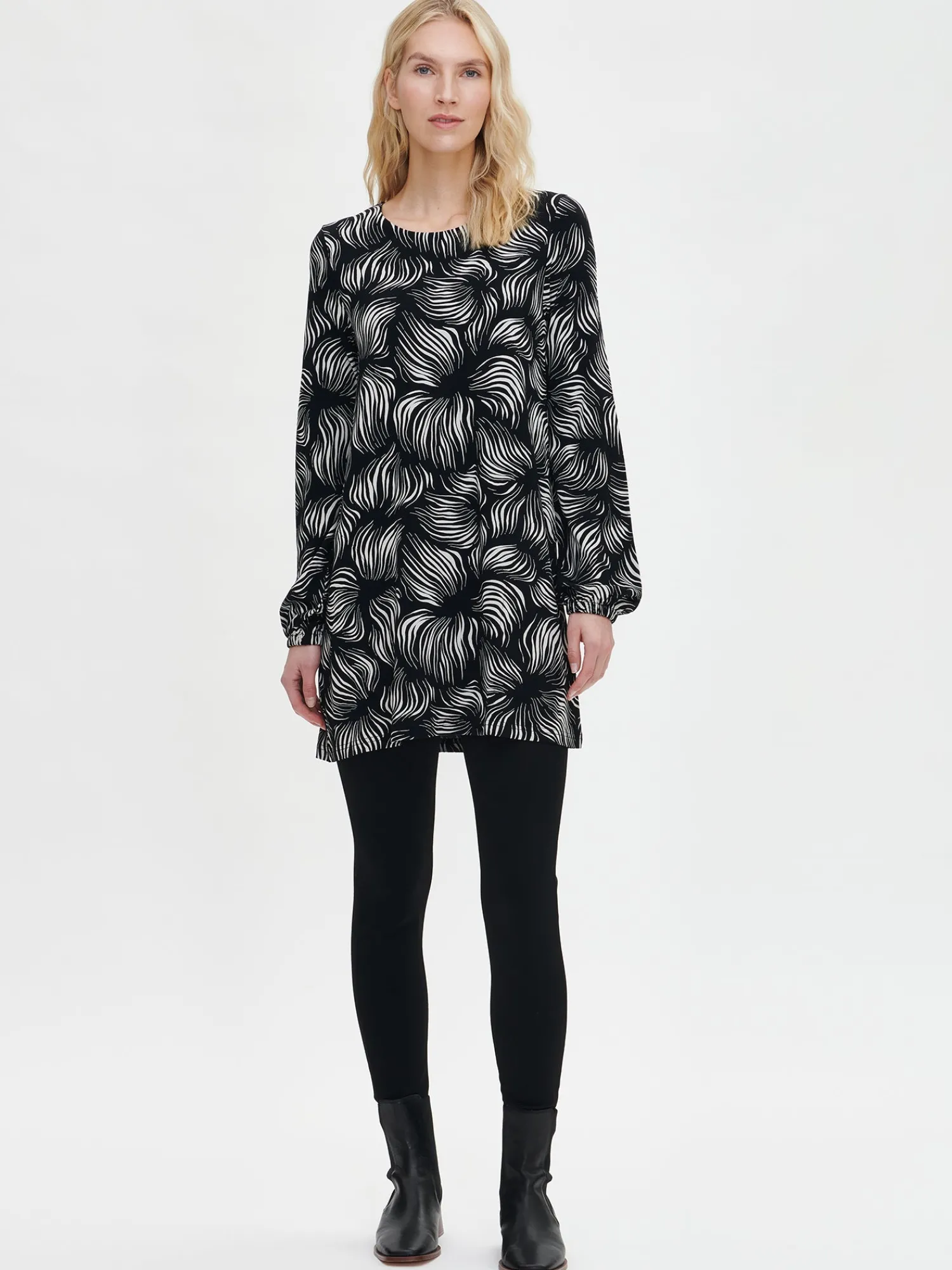 Naisten kuosillinen mustavalkoinen Pieni Tuija-tunika. A-linjaisessa tunikassa on alavaralla viimeistelty pyöreä pääntie ja sivutaskut. Täyspitkät hihat poimuttuvat kauniisti hihansuiden kuminauhakäänteeseen. Tunikan pituus koossa M on noin 80 cm. Tuote on valmistettu LENZING™ ECOVERO™-viskoosista. Materiaali on laadukasta, miellyttävän tuntuista ja laskeutuvaa viskoosi-elastaani-neulosta, joka pysyy hyvänä pesusta toiseen. Materiaalille on ominaista 3-5% kutistuminen ensimmäisessä pesussa.