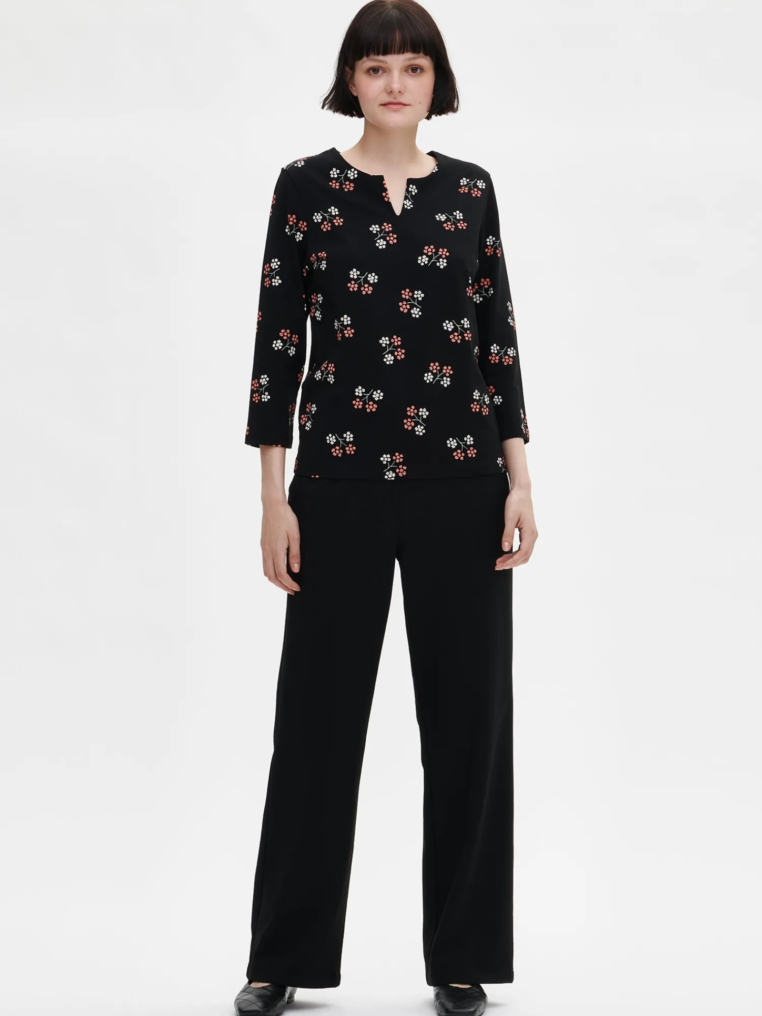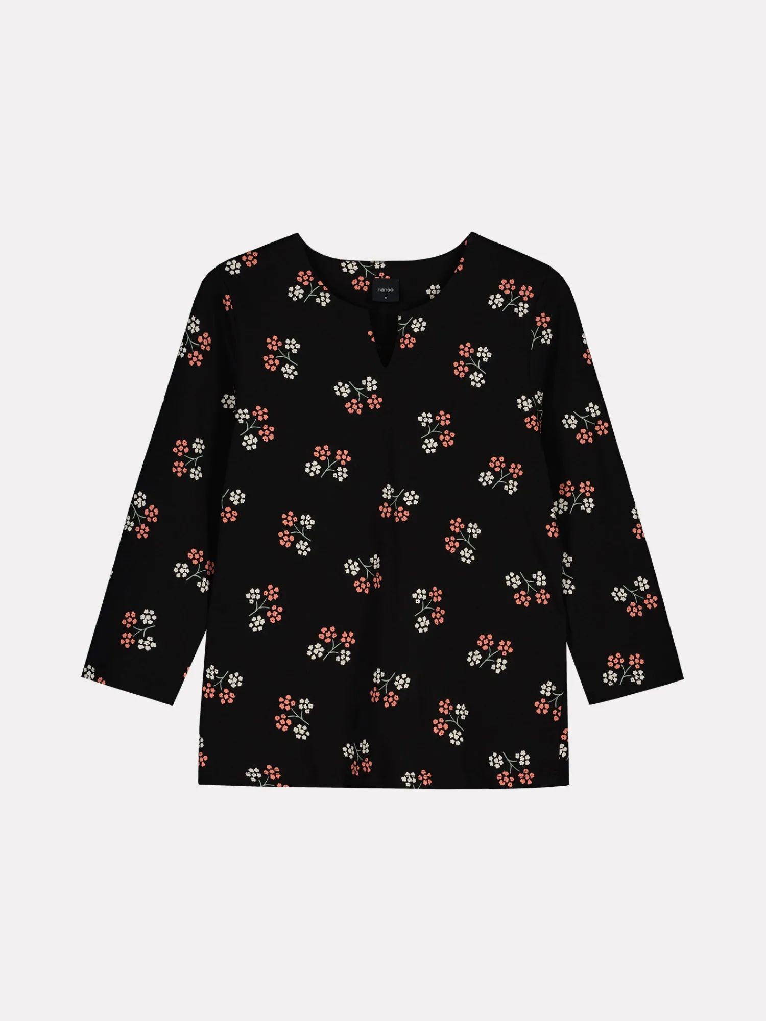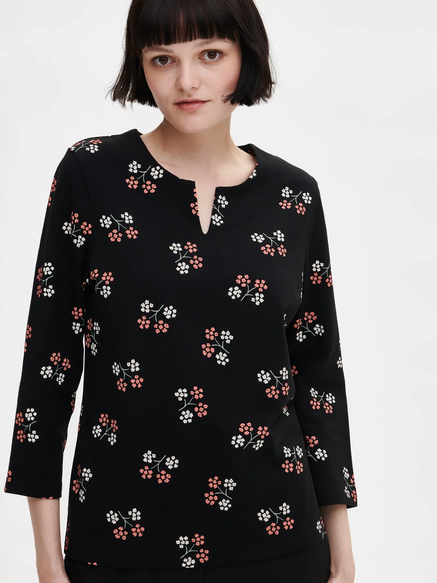Naisten kuosillinen musta Pikku Cassia-pusero. Puserossa on alavaralla viimeistelty pyöreä pääntie, jonka edessä on halkio. Puserossa on 3/4 pituiset hihat ja helma on suora. Puseron pituus koossa M on noin 64 cm. Materiaali on miellyttävää ja joustavaa puuvilla-elastaani-neulosta.