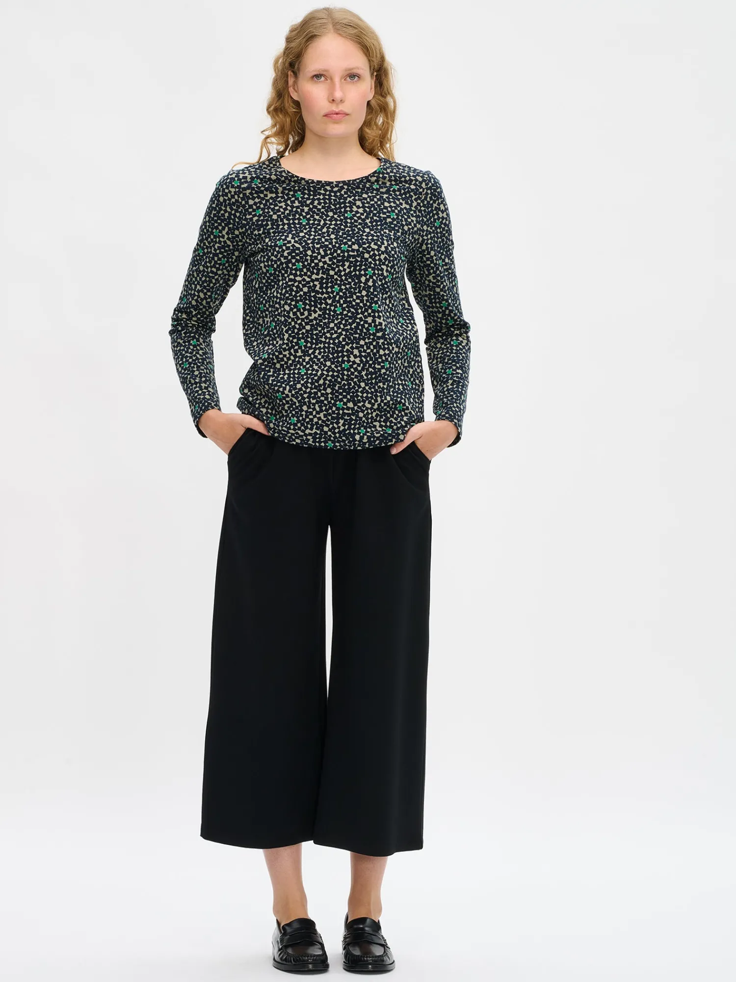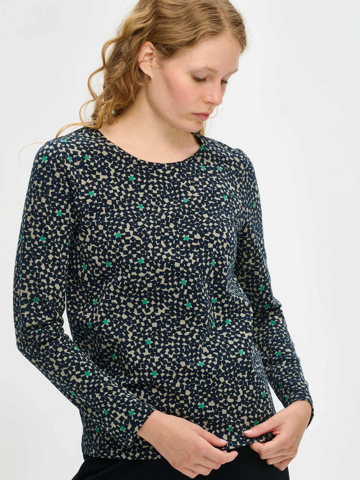 Naisten kuosillinen vihreä Polku-pusero. Puseron pyöreä pääntie on viimeistelty tereellä ja hihat ovat täyspitkät. Puseron pituus koossa M on noin 65 cm. Materiaali on miellyttävän tuntuista ja helppohoitoista puuvilla-elastaani-neulosta.