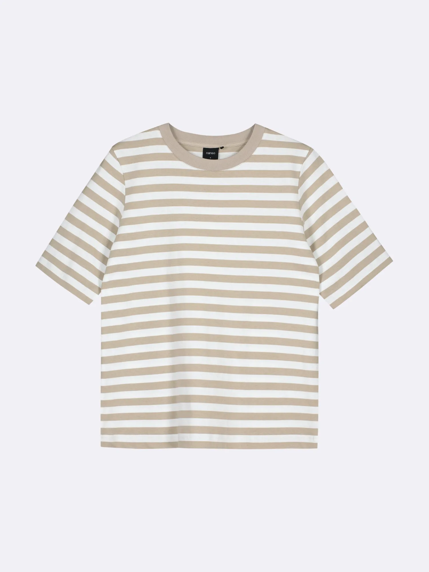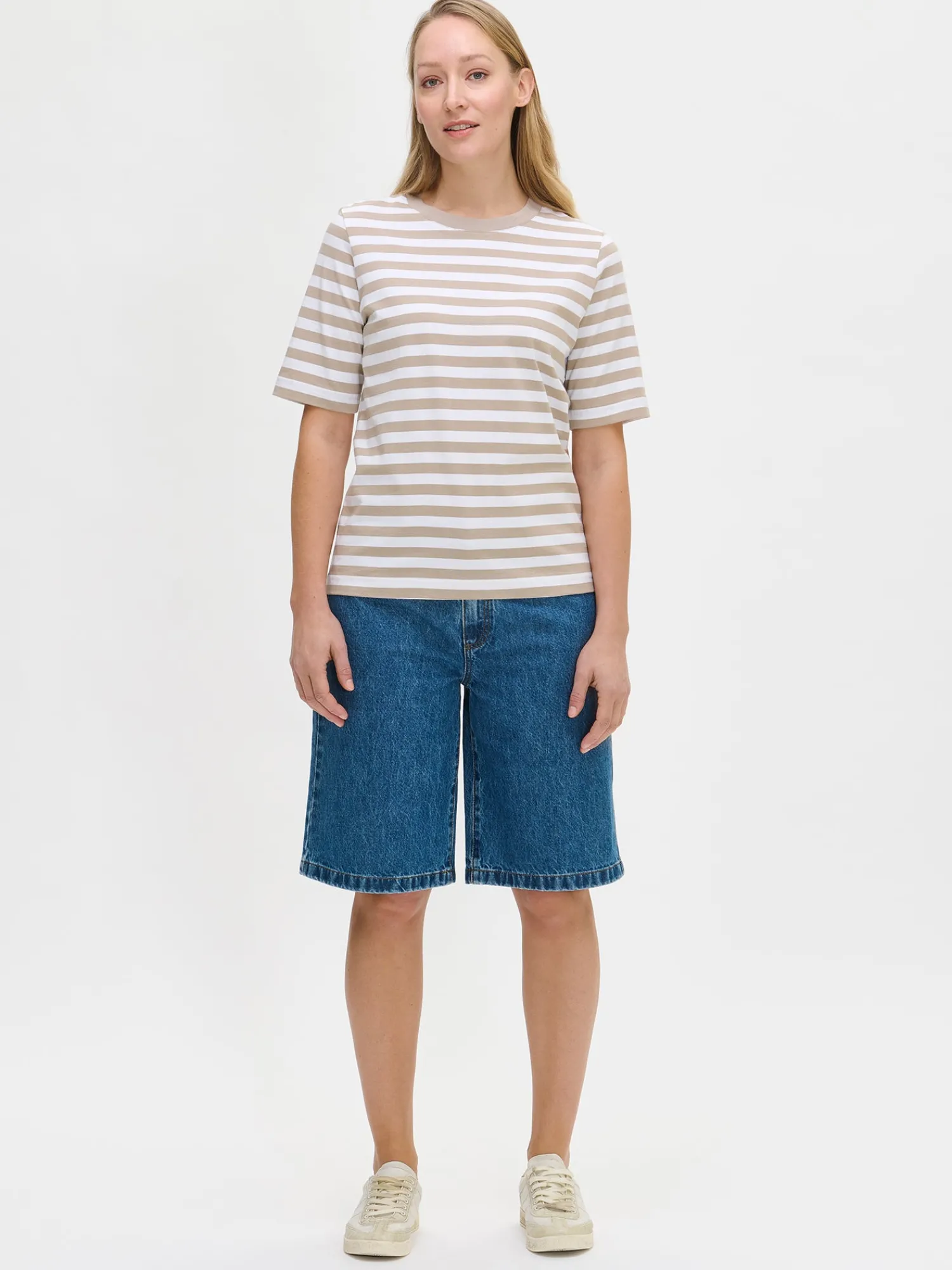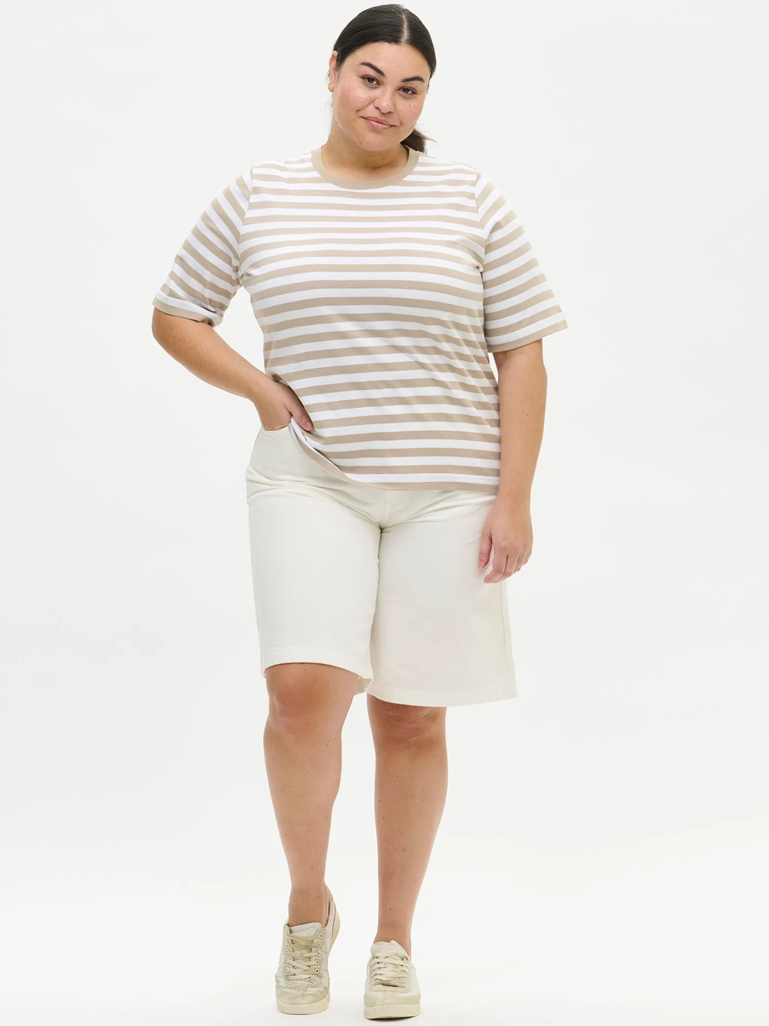 Naisten raidallinen beige-valkoinen Normi-t-paita. Mukava t-paita on arjen klassikko, johon on ihana pukeutua päivästä toiseen. Suoralinjaisessa t-paidassa on pyöreä ribbi pääntie ja 2/4 pituiset hihat. T-paidan pituus koossa M on noin 65 cm. Materiaali on 100 % laadukasta puuvillaa, joka pysyy hyvänä käytössä.