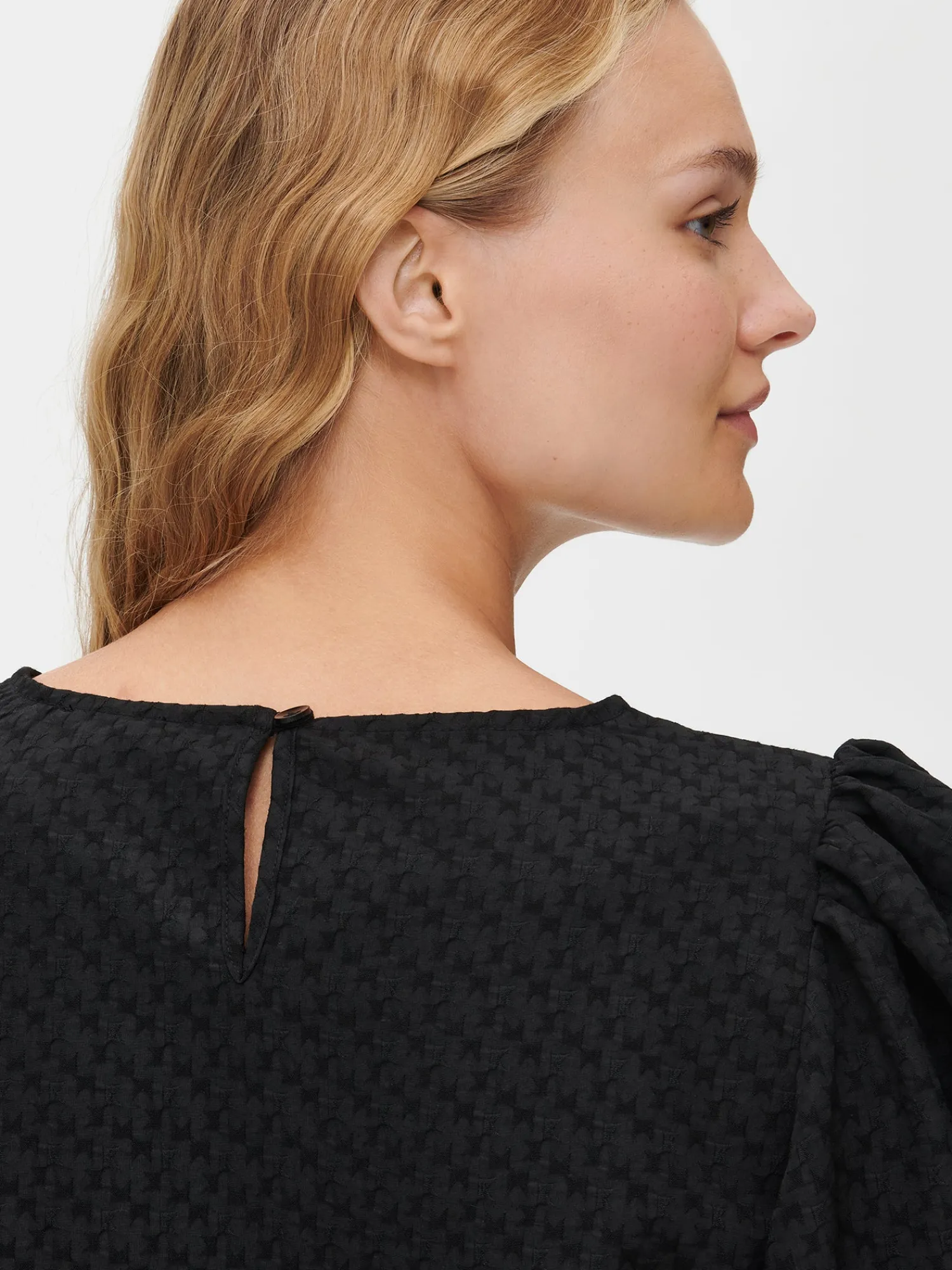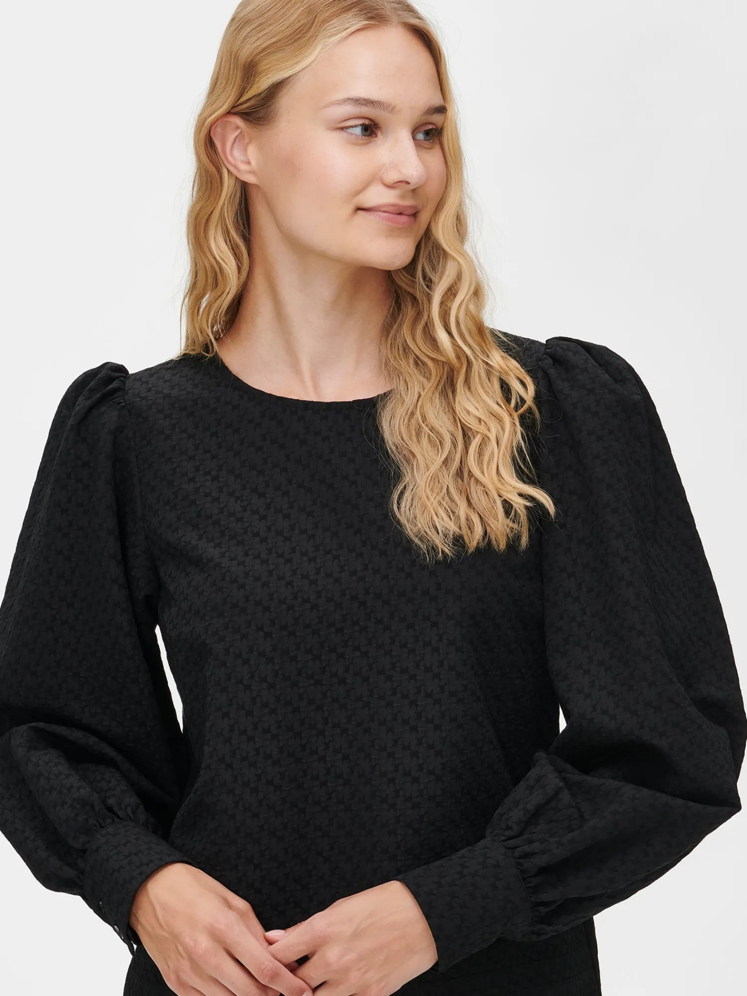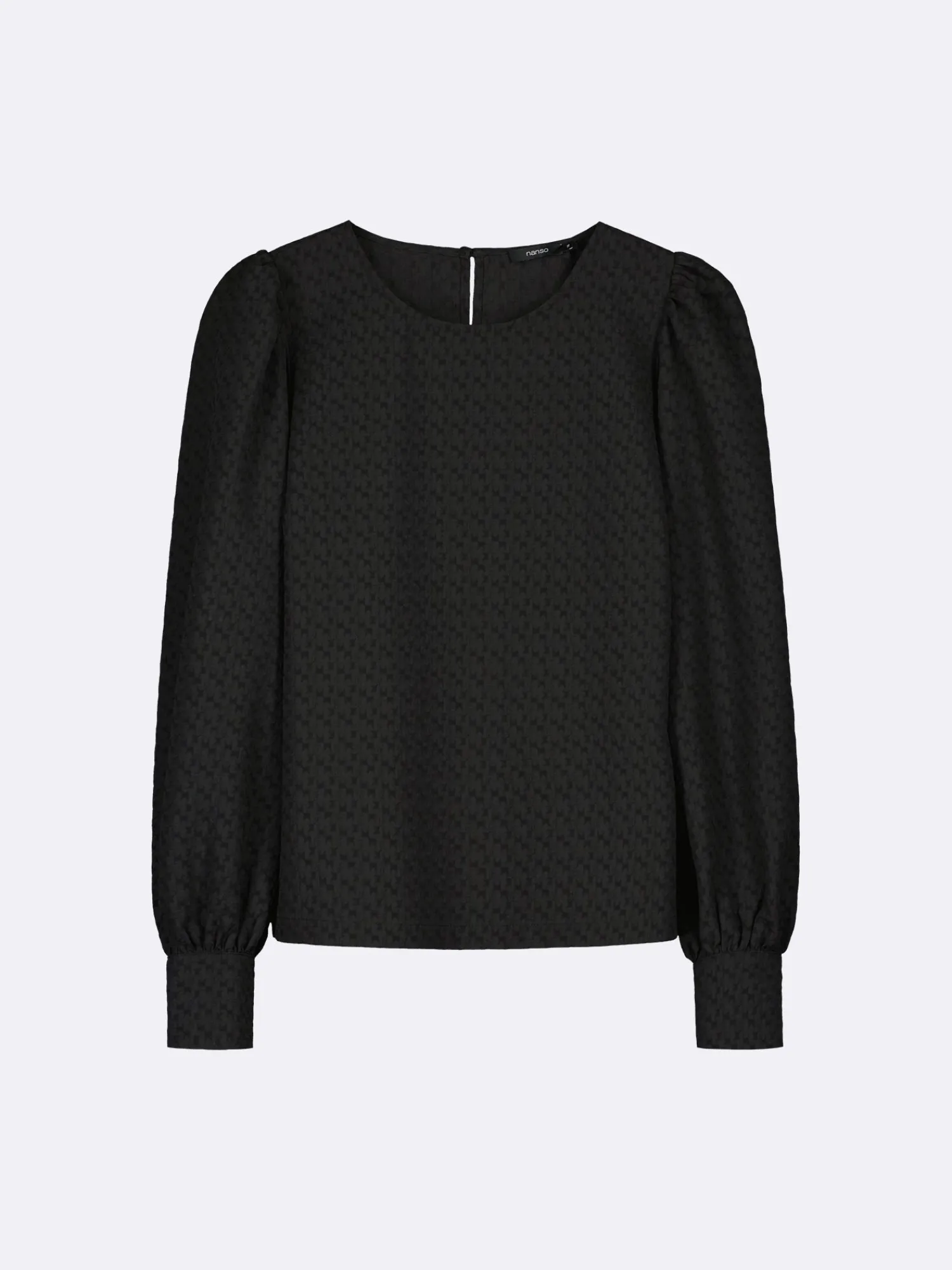 Naisten tyylikäs musta Reliefi-pusero kauniilla tekstuuripinnalla. Pusero on täydellinen yhdistettäväksi sekä hameiden että housujen kanssa. Puserossa on pyöreä pääntie, jossa takana nappihalkio. Puserossa on väljät ja muhkeat täyspitkät hihat, jotka poimuttuvat kauniisti olalla sekä kalvosimen yläpuolelle. Hihansuissa on nappikalvosimet. Puseron pituus koossa 38 on noin 60 cm. Materiaali on miellyttävän tuntuista kudottua polyesteri-viskoosi-elastaani -kangasta, jossa on kaunis pintastruktuuri. Materiaalille on ominaista 3-5 % kutistuminen ensimmäisessä pesussa. Suosittelemme tuotteen pesua ennen käyttöä, koska tuotteesta saattaa irrota väriä ennen ensimmäistä pesua.