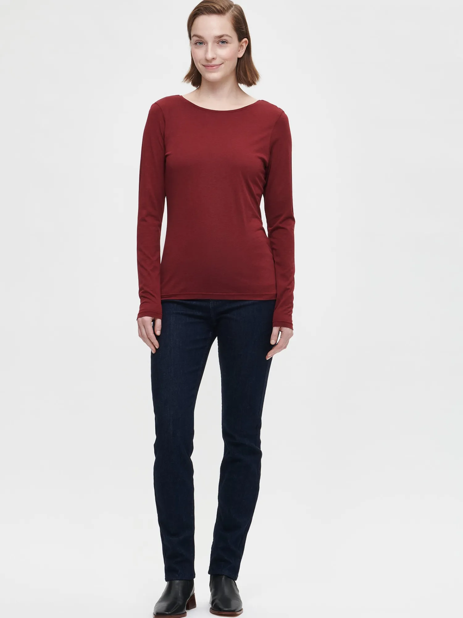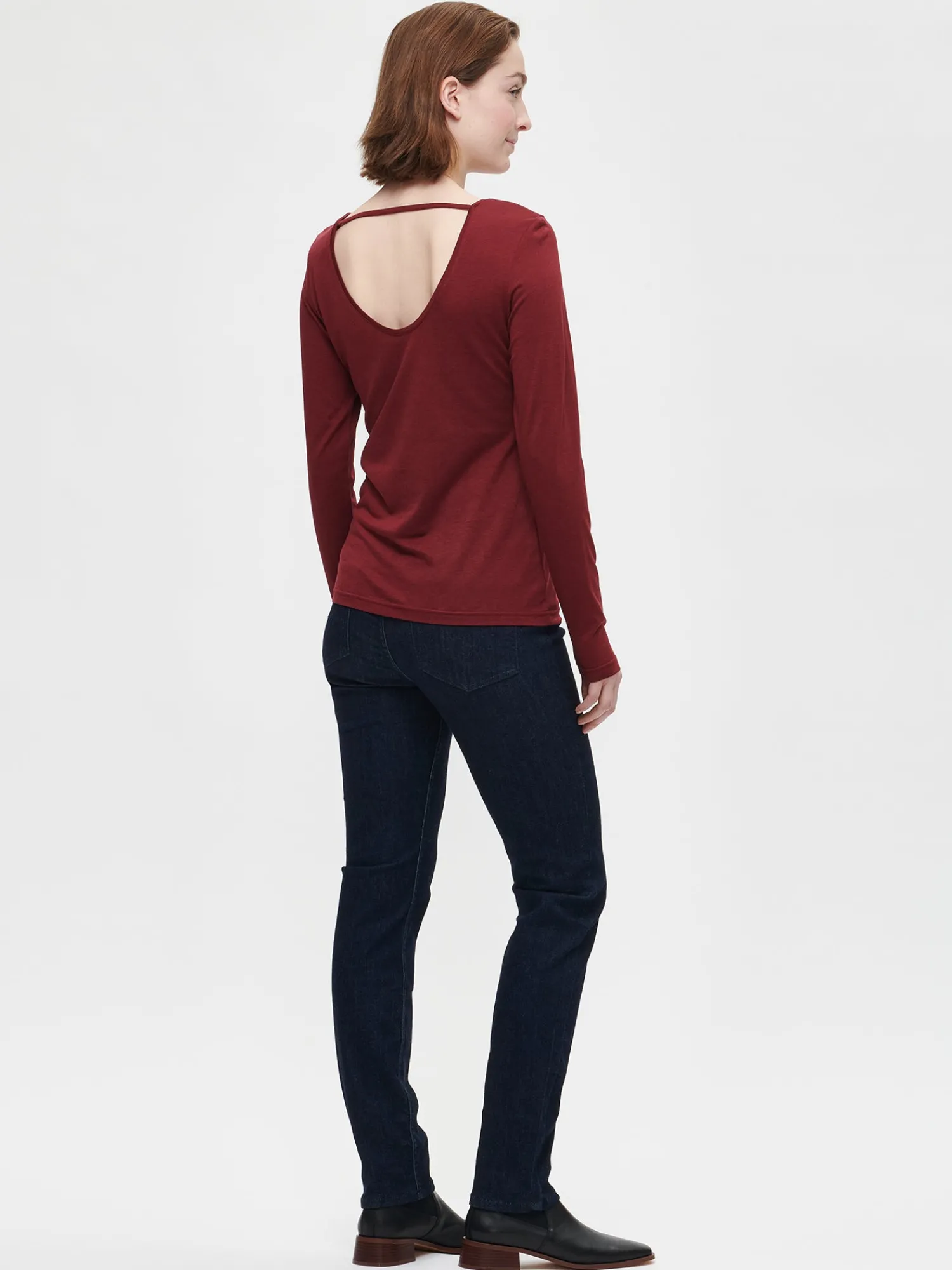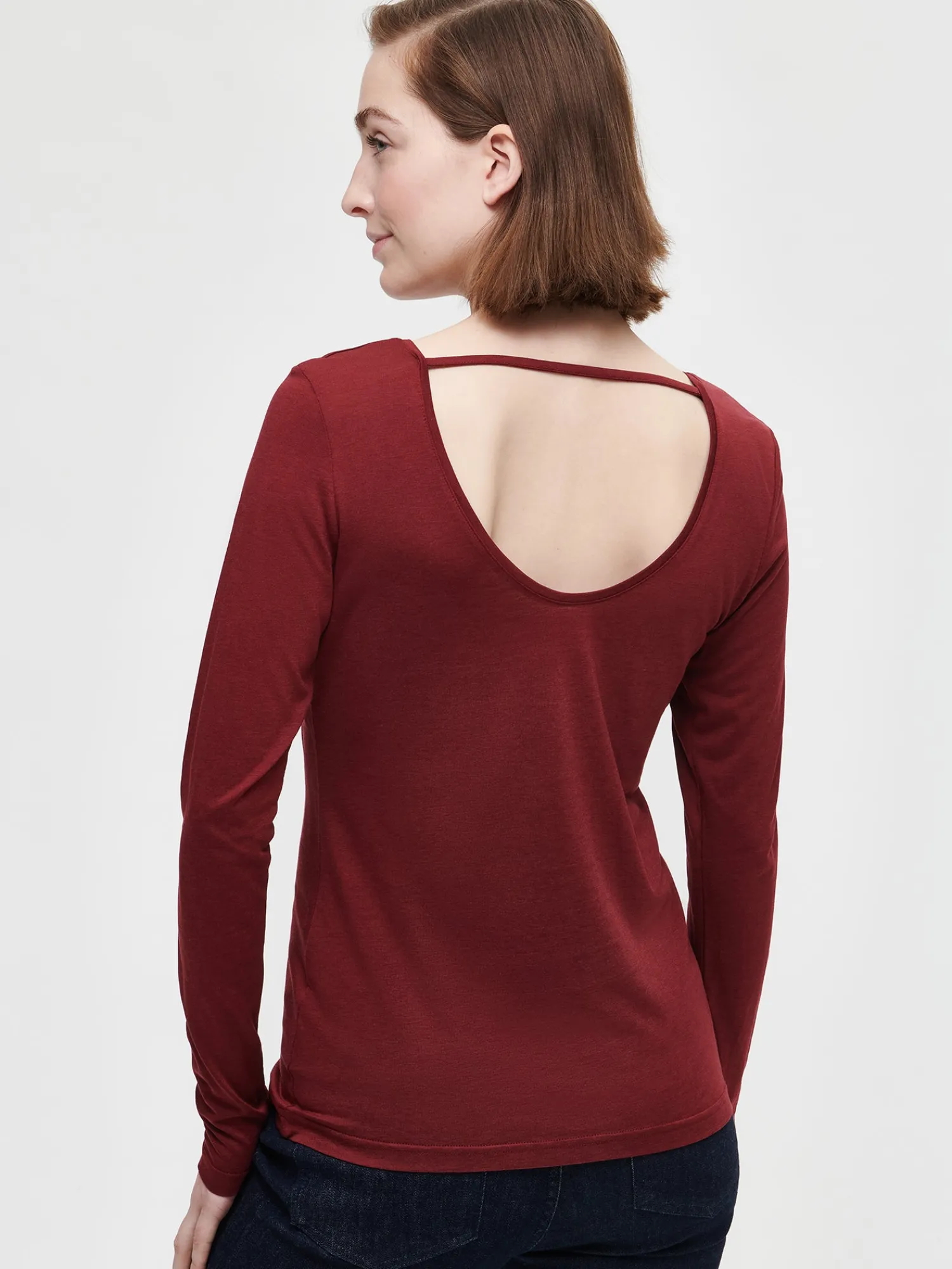 Naisten ylellinen viininpunainen Rosi-pusero täyspitkillä istuvilla hihoilla. Puserossa on kaunis avonainen yksityiskohta selässä. Puseron pituus koossa M on noin 67 cm. Materiaali on laadukasta, iholla höyhenenkevyeltä tuntuvaa lyocell-puuvilla -neulosta. Materiaalille on ominaista kutistua hieman pesussa mutta se venyy taas nopeasti oikeisiin mittoihinsa päälle laittaessa.