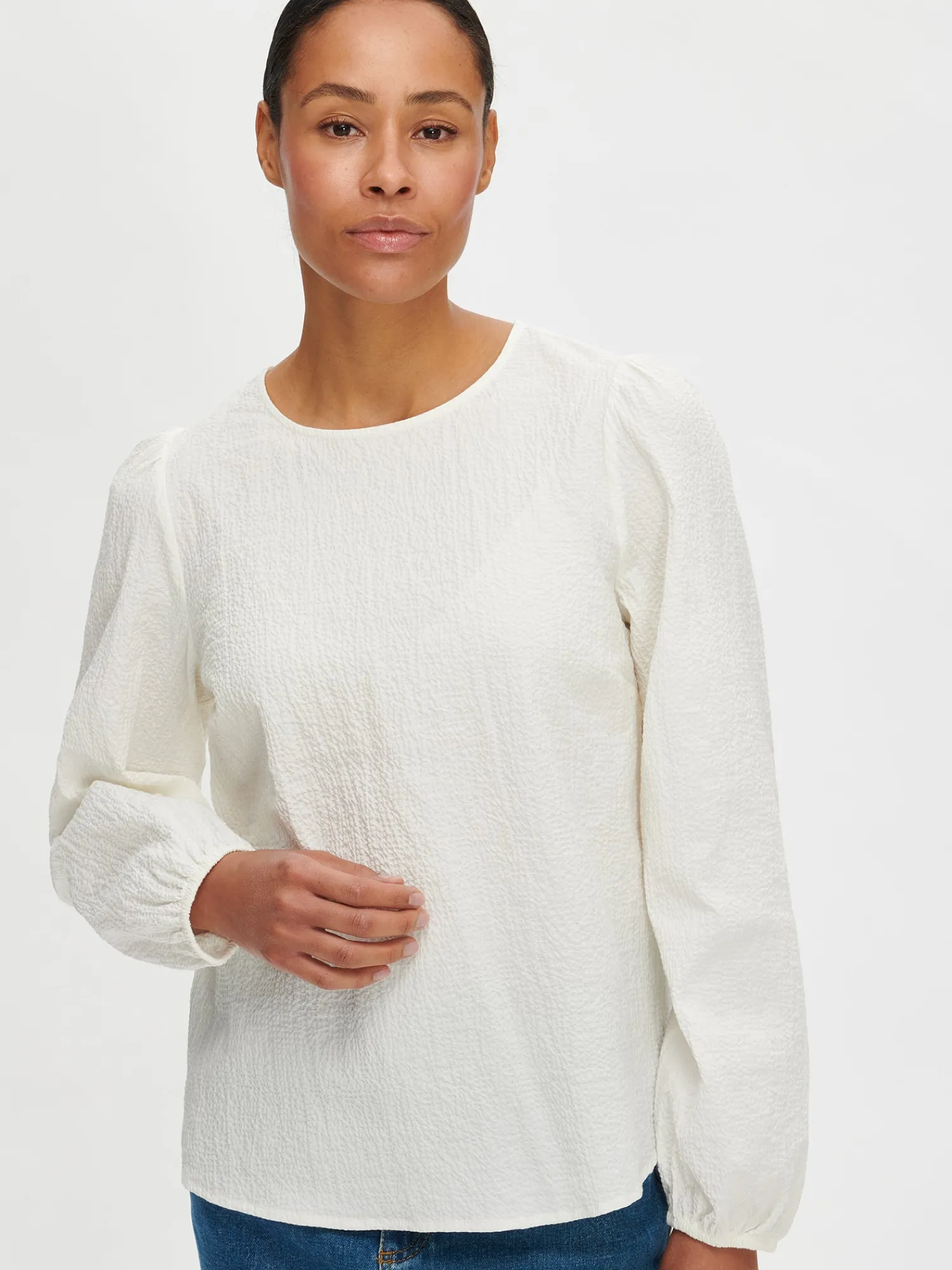 Naisten luonnonvalkoinen pitkähihainen Rusetti-pusero. Yksinkertaisen tyylikäs pusero on helppo yhdistää erilaisiin asukokonaisuuksiin. Puserossa on kantilla viimeistelty pyöreä pääntie ja takana yksityiskohtana halkio kahdella rusetilla, joista ylimmäinen on avattava. Täyspitkät hihat poimuttuvat hihansuiden kuminauhakäänteeseen. Puseron pituus koossa M on noin 64 cm. Materiaali on kudottua puuvillakangasta, jossa kaunis seersucker pintastruktuuri. Kankaassa on hieman elastaania antamassa joustoa. Materiaalille on ominaista 3-5% kutistuminen ensimmäisessä pesussa.