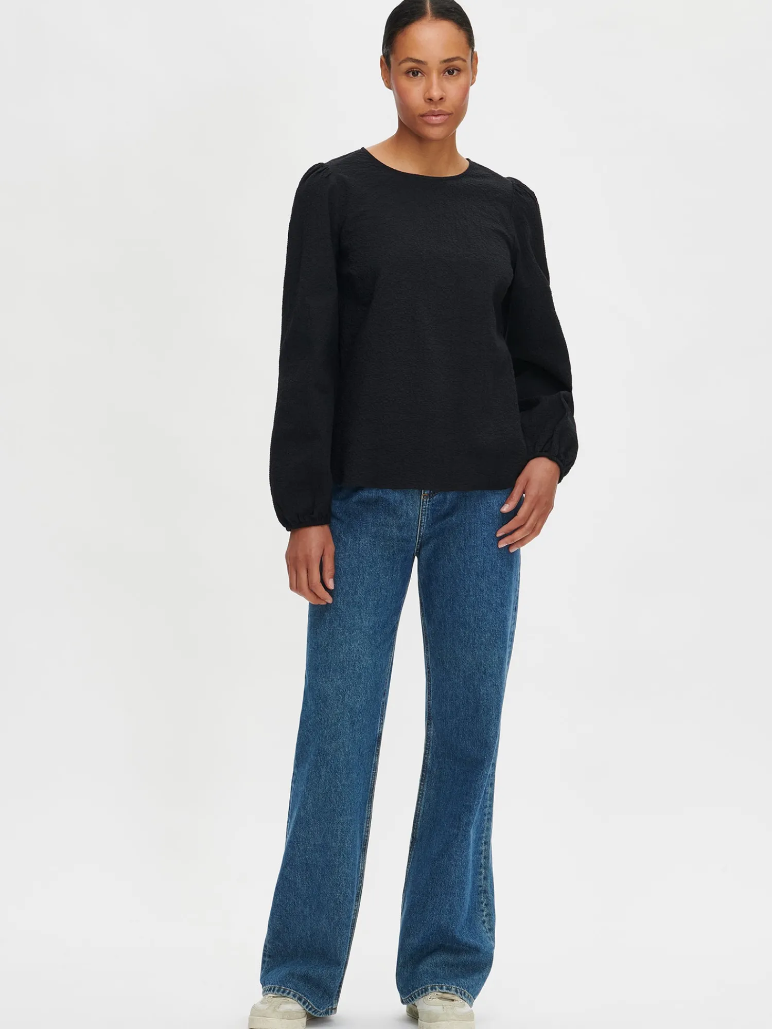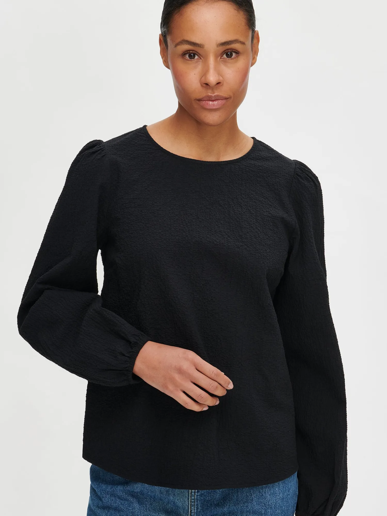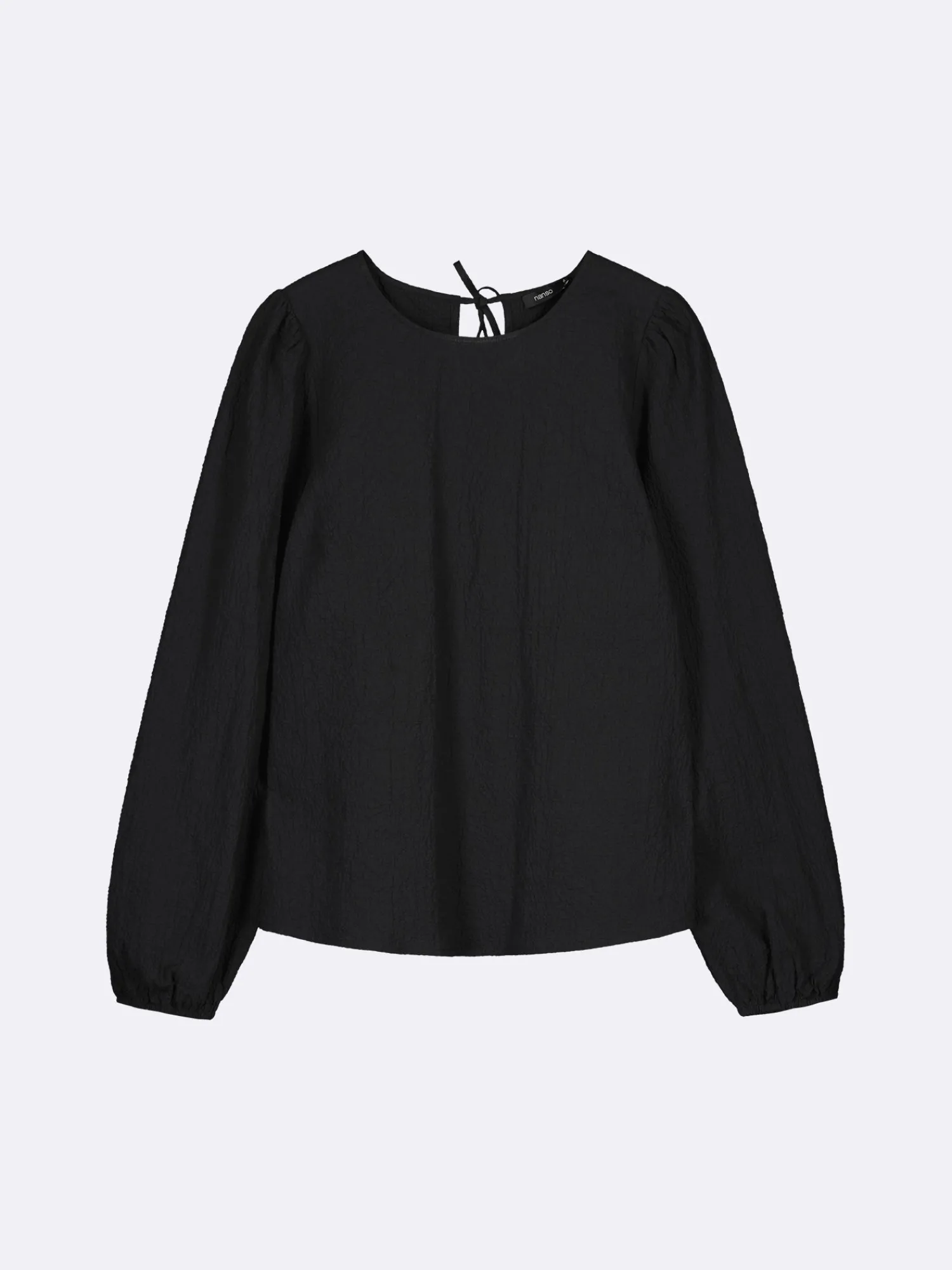 Naisten musta pitkähihainen Rusetti-pusero. Yksinkertaisen tyylikäs pusero on helppo yhdistää erilaisiin asukokonaisuuksiin. Puserossa on kantilla viimeistelty pyöreä pääntie ja takana yksityiskohtana halkio kahdella rusetilla, joista ylimmäinen on avattava. Täyspitkät hihat poimuttuvat hihansuiden kuminauhakäänteeseen. Puseron pituus koossa M on noin 64 cm. Materiaali on kudottua puuvillakangasta, jossa kaunis seersucker pintastruktuuri. Kankaassa on hieman elastaania antamassa joustoa. Materiaalille on ominaista 3-5% kutistuminen ensimmäisessä pesussa.