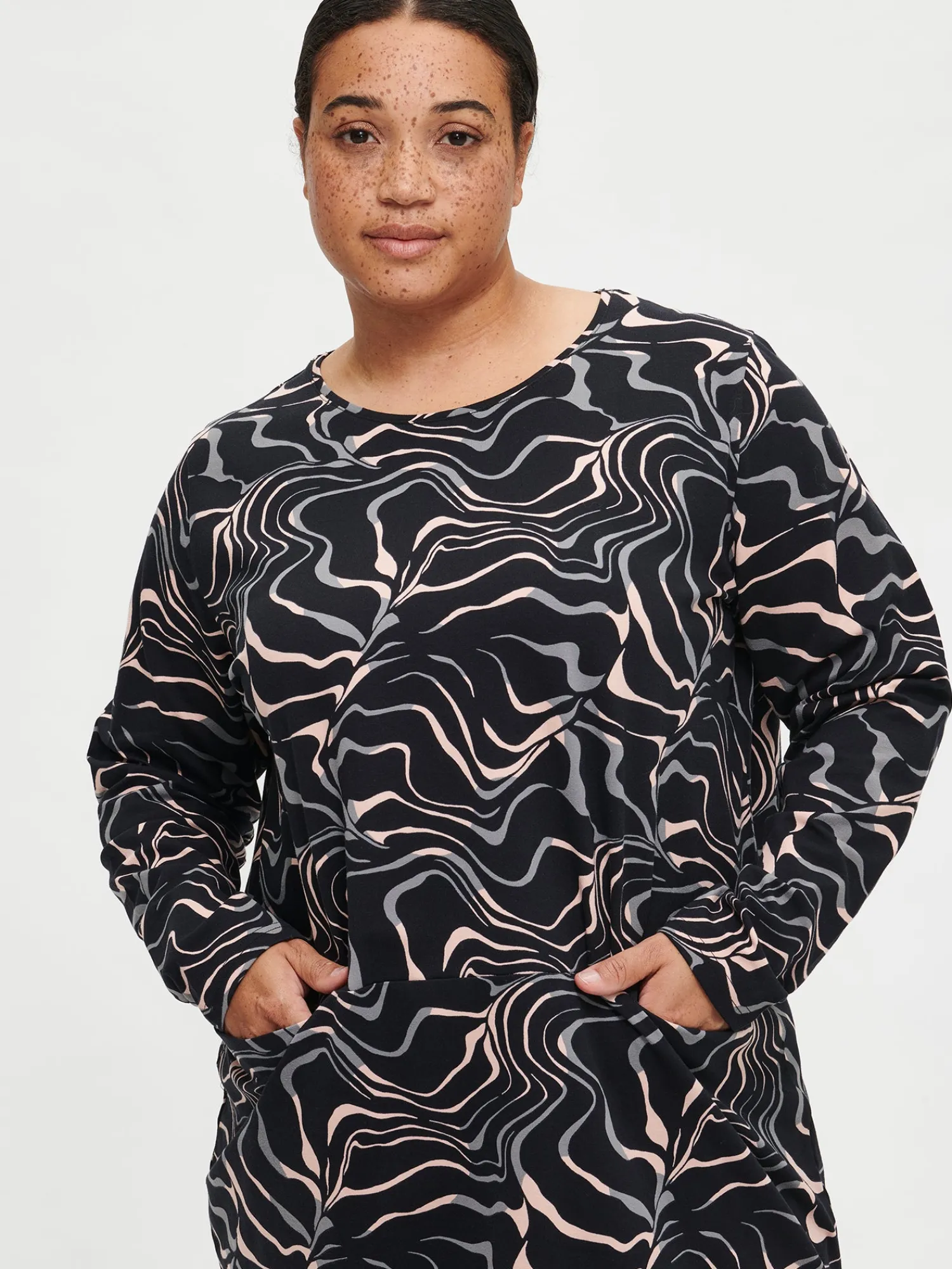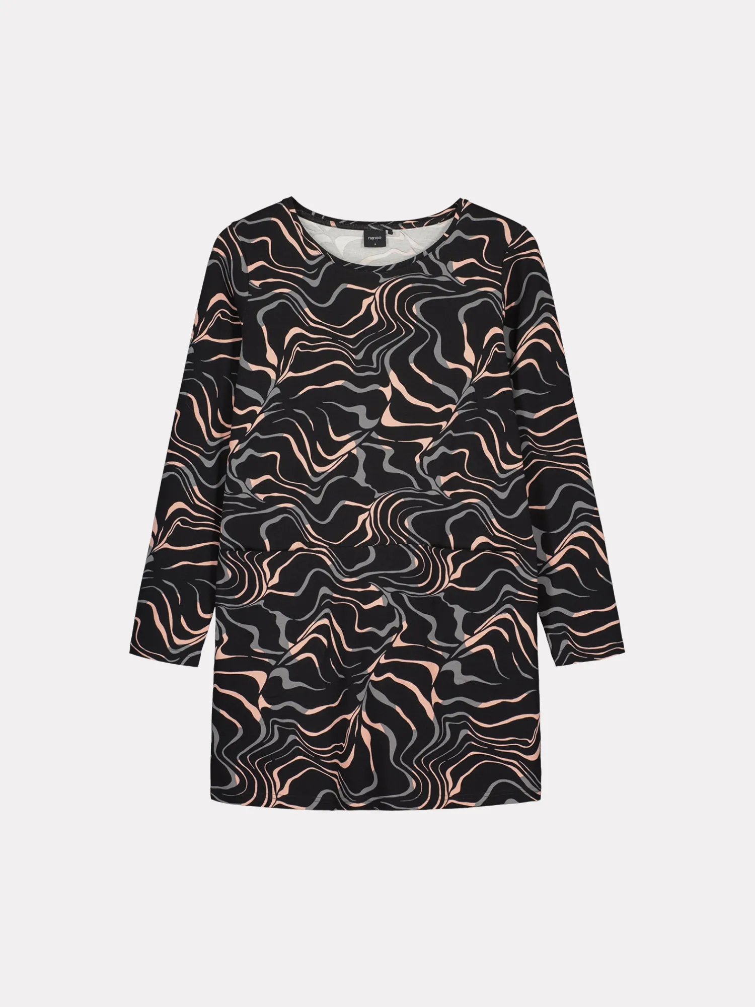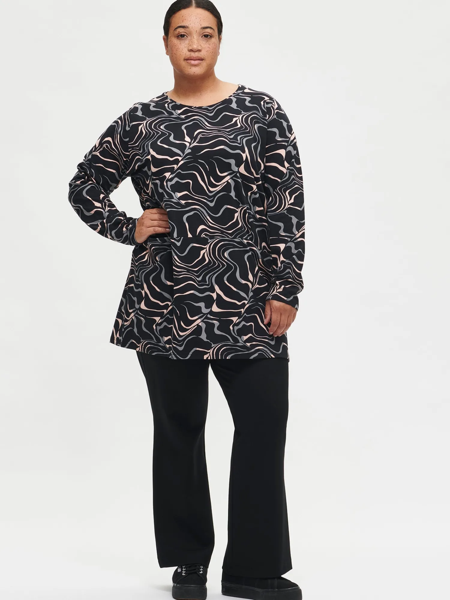 Naisten musta Saara-tunika kauniilla kuosilla. Rennossa suoralinjaisessa tunikassa on tereellä viimeistelty pyöreä pääntie ja täyspitkät hihat. Tunikan leikkaussaumassa on upotettuna taskut. Tunikan pituus koossa M on noin 85 cm. Materiaali on miellyttävän tuntuista ja helppohoitoista puuvilla-elastaani-neulosta.
