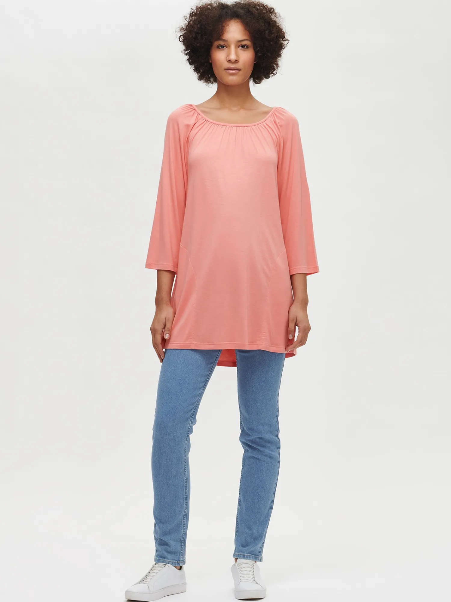 Naisten koralli Sommar-tunika. Tunikassa on kantilla poimutettu pyöreä pääntie, sivuissa taskut ja 3/4 pituiset raglanhihat. Tunikan pituus koossa M on noin 78 cm. Materiaali on laadukasta ja miellyttävän tuntuista, ohutta viskoosi-elastaani-neulosta. Viskoosineulos on sähköistymätöntä ja helppohoitoista. Tuote on valmistettu vastuullisemmasta LENZING™ ECOVERO™ -viskoosista. Materiaalille on ominaista 3-5% kutistuminen ensimmäisessä pesussa.