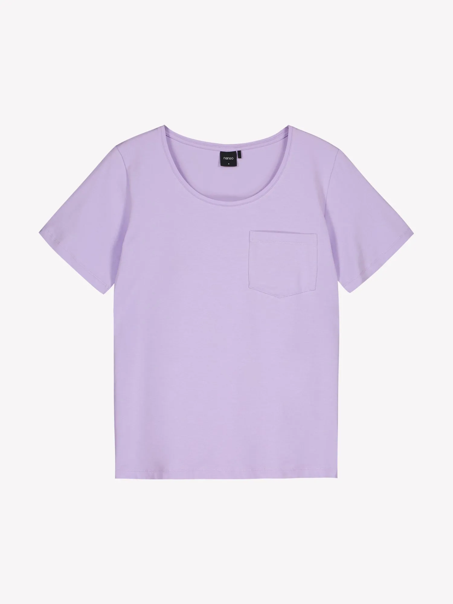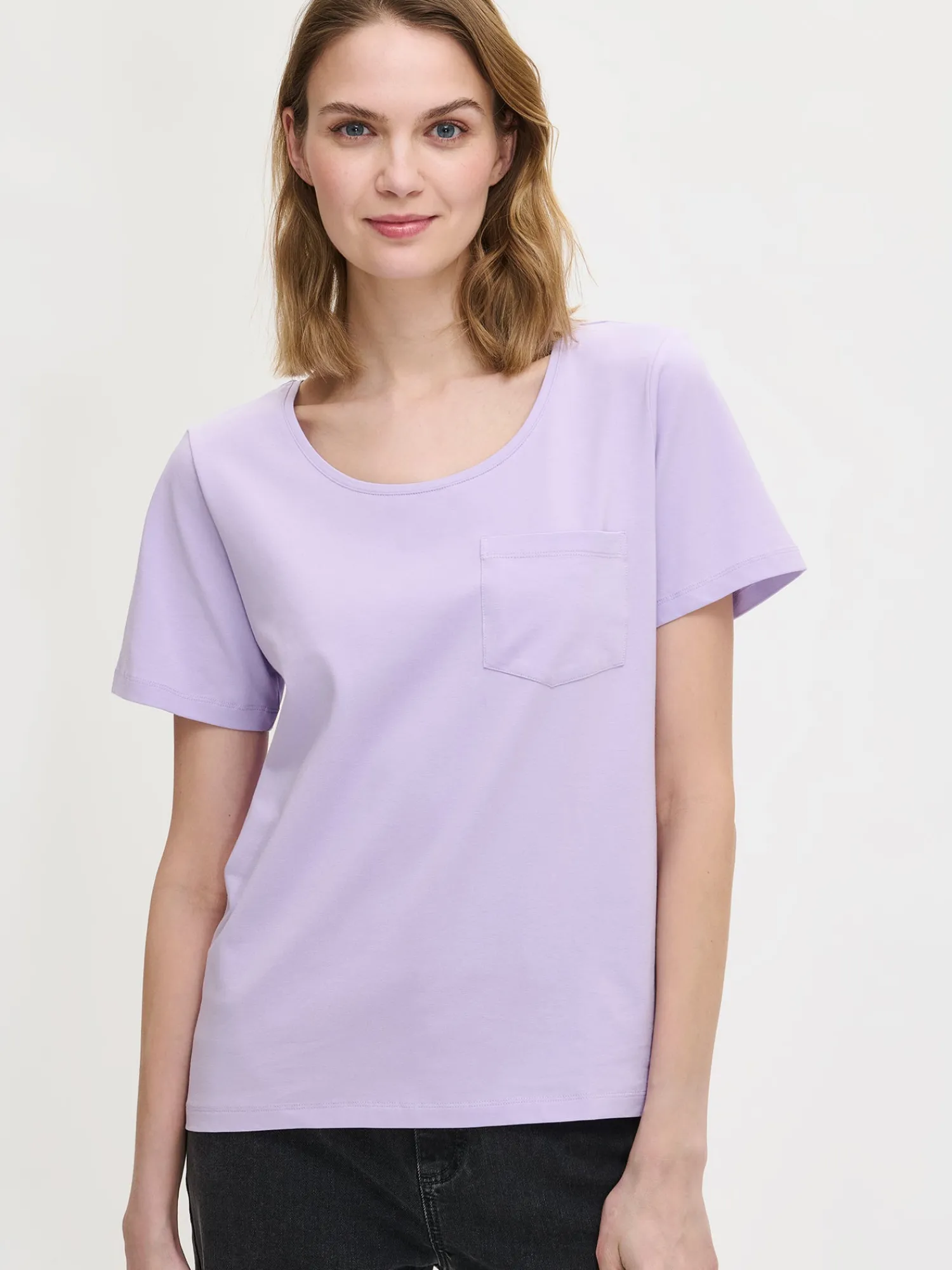 Naisten tyylikäs lila Tasku t-paita pyöreällä pääntiellä. Klassiseen t-paitaan voi aina luottaa, sillä se sopii vaivattomasti jokaiseen asuun. Hihat on lyhyet ja paidassa on rintatasku. T-paidan pituus koossa M on noin 65 cm. Materiaali on miellyttävää ja joustavaa puuvilla-elastaani-neulosta.