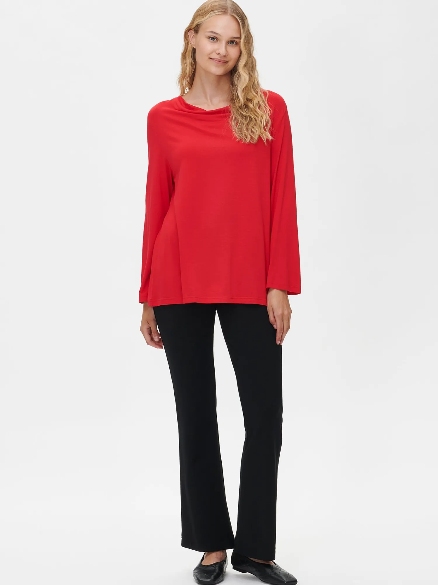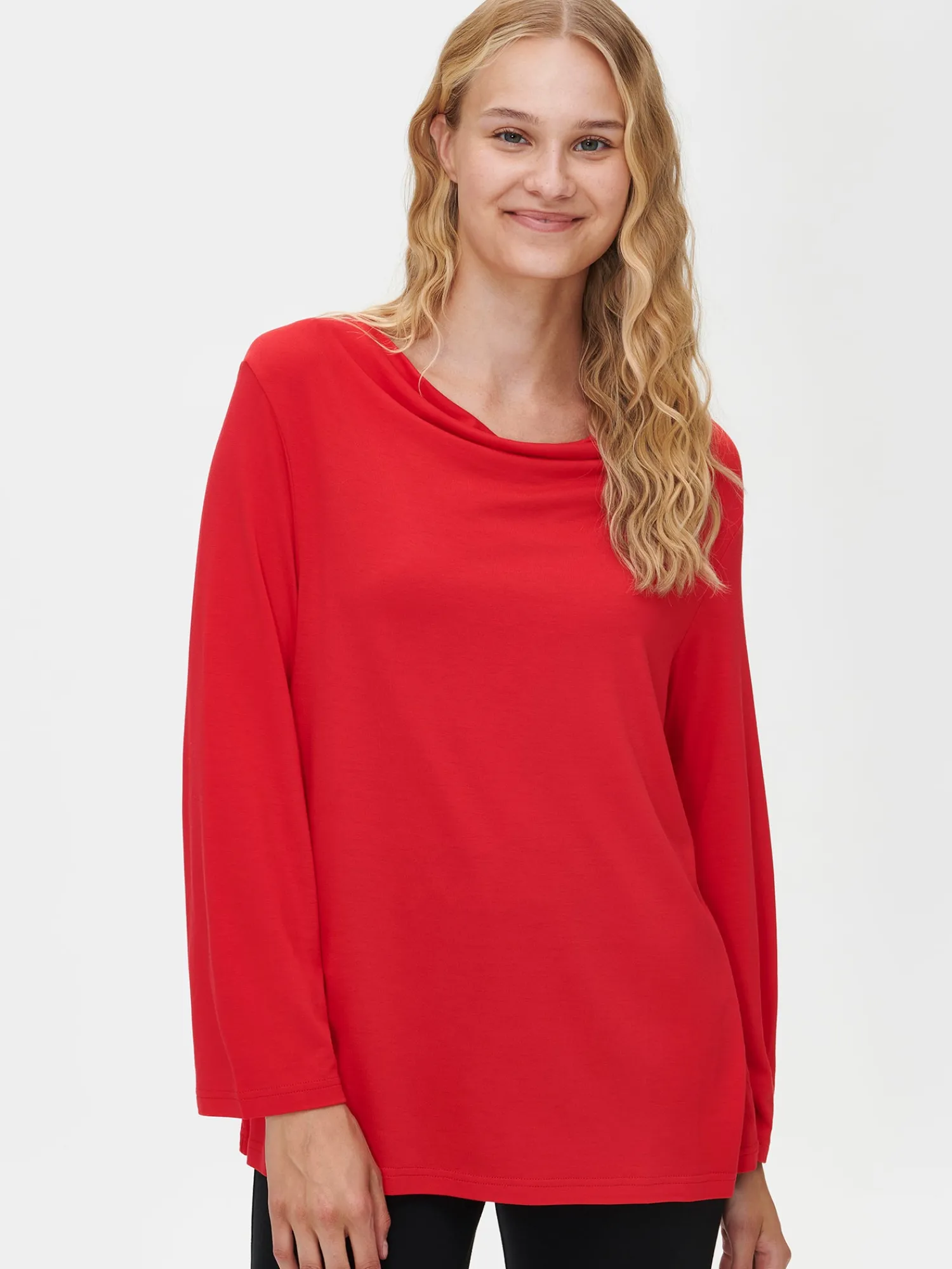 Naisten punainen Tuulia-pusero. Puserossa on elegantti, kauniisti laskeutuva putouspääntie ja 3/4 pituiset hihat. Klassinen pusero on helppo yhdistää erilaisiin asukokonaisuuksiin. Puseron pituus koossa M on noin 62 cm. Tuote on valmistettu LENZING™ ECOVERO™-viskoosista. Materiaali on laadukasta ja miellyttävän tuntuista viskoosi-elastaani-neulosta. Viskoosineulos on sähköistymätöntä ja helppohoitoista. Materiaalille on ominaista 3-5% kutistuminen ensimmäisessä pesussa.